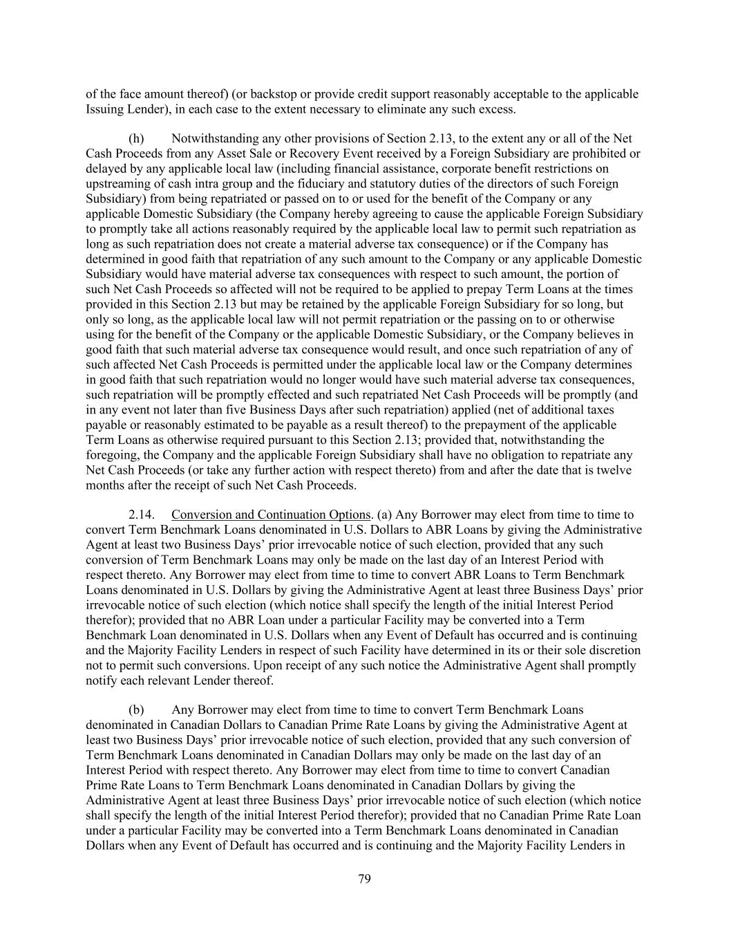 79 of the face amount thereof) (or backstop or provide credit support reasonably acceptable to the applicable Issuing Lender), in each case to the extent necessary to eliminate any such excess. (h) Notwithstanding any other provisions of Section 2.13, to the extent any or all of the Net Cash Proceeds from any Asset Sale or Recovery Event received by a Foreign Subsidiary are prohibited or delayed by any applicable local law (including financial assistance, corporate benefit restrictions on upstreaming of cash intra group and the fiduciary and statutory duties of the directors of such Foreign Subsidiary) from being repatriated or passed on to or used for the benefit of the Company or any applicable Domestic Subsidiary (the Company hereby agreeing to cause the applicable Foreign Subsidiary to promptly take all actions reasonably required by the applicable local law to permit such repatriation as long as such repatriation does not create a material adverse tax consequence) or if the Company has determined in good faith that repatriation of any such amount to the Company or any applicable Domestic Subsidiary would have material adverse tax consequences with respect to such amount, the portion of such Net Cash Proceeds so affected will not be required to be applied to prepay Term Loans at the times provided in this Section 2.13 but may be retained by the applicable Foreign Subsidiary for so long, but only so long, as the applicable local law will not permit repatriation or the passing on to or otherwise using for the benefit of the Company or the applicable Domestic Subsidiary, or the Company believes in good faith that such material adverse tax consequence would result, and once such repatriation of any of such affected Net Cash Proceeds is permitted under the applicable local law or the Company determines in good faith that such repatriation would no longer would have such material adverse tax consequences, such repatriation will be promptly effected and such repatriated Net Cash Proceeds will be promptly (and in any event not later than five Business Days after such repatriation) applied (net of additional taxes payable or reasonably estimated to be payable as a result thereof) to the prepayment of the applicable Term Loans as otherwise required pursuant to this Section 2.13; provided that, notwithstanding the foregoing, the Company and the applicable Foreign Subsidiary shall have no obligation to repatriate any Net Cash Proceeds (or take any further action with respect thereto) from and after the date that is twelve months after the receipt of such Net Cash Proceeds. 2.14. Conversion and Continuation Options. (a) Any Borrower may elect from time to time to convert Term Benchmark Loans denominated in U.S. Dollars to ABR Loans by giving the Administrative Agent at least two Business Days’ prior irrevocable notice of such election, provided that any such conversion of Term Benchmark Loans may only be made on the last day of an Interest Period with respect thereto. Any Borrower may elect from time to time to convert ABR Loans to Term Benchmark Loans denominated in U.S. Dollars by giving the Administrative Agent at least three Business Days’ prior irrevocable notice of such election (which notice shall specify the length of the initial Interest Period therefor); provided that no ABR Loan under a particular Facility may be converted into a Term Benchmark Loan denominated in U.S. Dollars when any Event of Default has occurred and is continuing and the Majority Facility Lenders in respect of such Facility have determined in its or their sole discretion not to permit such conversions. Upon receipt of any such notice the Administrative Agent shall promptly notify each relevant Lender thereof. (b) Any Borrower may elect from time to time to convert Term Benchmark Loans denominated in Canadian Dollars to Canadian Prime Rate Loans by giving the Administrative Agent at least two Business Days’ prior irrevocable notice of such election, provided that any such conversion of Term Benchmark Loans denominated in Canadian Dollars may only be made on the last day of an Interest Period with respect thereto. Any Borrower may elect from time to time to convert Canadian Prime Rate Loans to Term Benchmark Loans denominated in Canadian Dollars by giving the Administrative Agent at least three Business Days’ prior irrevocable notice of such election (which notice shall specify the length of the initial Interest Period therefor); provided that no Canadian Prime Rate Loan under a particular Facility may be converted into a Term Benchmark Loans denominated in Canadian Dollars when any Event of Default has occurred and is continuing and the Majority Facility Lenders in