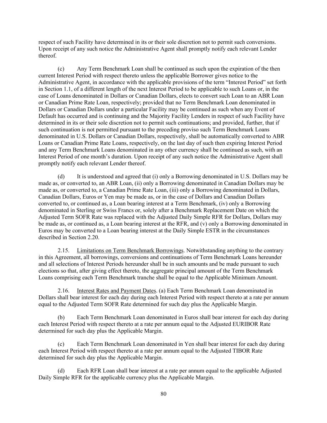 80 respect of such Facility have determined in its or their sole discretion not to permit such conversions. Upon receipt of any such notice the Administrative Agent shall promptly notify each relevant Lender thereof. (c) Any Term Benchmark Loan shall be continued as such upon the expiration of the then current Interest Period with respect thereto unless the applicable Borrower gives notice to the Administrative Agent, in accordance with the applicable provisions of the term “Interest Period” set forth in Section 1.1, of a different length of the next Interest Period to be applicable to such Loans or, in the case of Loans denominated in Dollars or Canadian Dollars, elects to convert such Loan to an ABR Loan or Canadian Prime Rate Loan, respectively; provided that no Term Benchmark Loan denominated in Dollars or Canadian Dollars under a particular Facility may be continued as such when any Event of Default has occurred and is continuing and the Majority Facility Lenders in respect of such Facility have determined in its or their sole discretion not to permit such continuations; and provided, further, that if such continuation is not permitted pursuant to the preceding proviso such Term Benchmark Loans denominated in U.S. Dollars or Canadian Dollars, respectively, shall be automatically converted to ABR Loans or Canadian Prime Rate Loans, respectively, on the last day of such then expiring Interest Period and any Term Benchmark Loans denominated in any other currency shall be continued as such, with an Interest Period of one month’s duration. Upon receipt of any such notice the Administrative Agent shall promptly notify each relevant Lender thereof. (d) It is understood and agreed that (i) only a Borrowing denominated in U.S. Dollars may be made as, or converted to, an ABR Loan, (ii) only a Borrowing denominated in Canadian Dollars may be made as, or converted to, a Canadian Prime Rate Loan, (iii) only a Borrowing denominated in Dollars, Canadian Dollars, Euros or Yen may be made as, or in the case of Dollars and Canadian Dollars converted to, or continued as, a Loan bearing interest at a Term Benchmark, (iv) only a Borrowing denominated in Sterling or Swiss Francs or, solely after a Benchmark Replacement Date on which the Adjusted Term SOFR Rate was replaced with the Adjusted Daily Simple RFR for Dollars, Dollars may be made as, or continued as, a Loan bearing interest at the RFR, and (v) only a Borrowing denominated in Euros may be converted to a Loan bearing interest at the Daily Simple ESTR in the circumstances described in Section 2.20. 2.15. Limitations on Term Benchmark Borrowings. Notwithstanding anything to the contrary in this Agreement, all borrowings, conversions and continuations of Term Benchmark Loans hereunder and all selections of Interest Periods hereunder shall be in such amounts and be made pursuant to such elections so that, after giving effect thereto, the aggregate principal amount of the Term Benchmark Loans comprising each Term Benchmark tranche shall be equal to the Applicable Minimum Amount. 2.16. Interest Rates and Payment Dates. (a) Each Term Benchmark Loan denominated in Dollars shall bear interest for each day during each Interest Period with respect thereto at a rate per annum equal to the Adjusted Term SOFR Rate determined for such day plus the Applicable Margin. (b) Each Term Benchmark Loan denominated in Euros shall bear interest for each day during each Interest Period with respect thereto at a rate per annum equal to the Adjusted EURIBOR Rate determined for such day plus the Applicable Margin. (c) Each Term Benchmark Loan denominated in Yen shall bear interest for each day during each Interest Period with respect thereto at a rate per annum equal to the Adjusted TIBOR Rate determined for such day plus the Applicable Margin. (d) Each RFR Loan shall bear interest at a rate per annum equal to the applicable Adjusted Daily Simple RFR for the applicable currency plus the Applicable Margin.