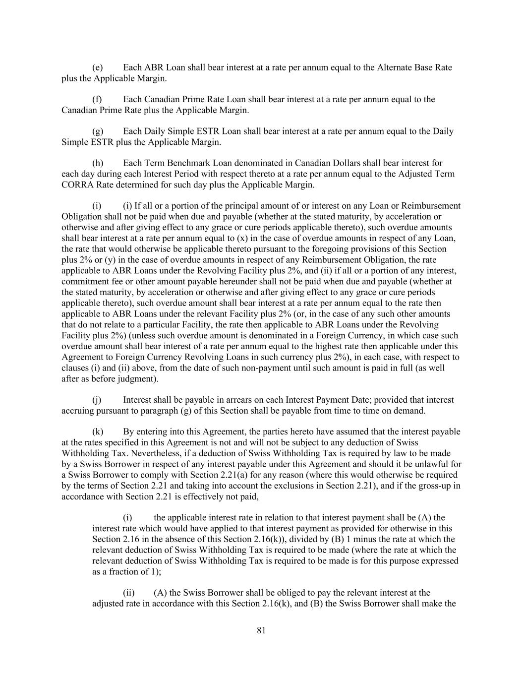 81 (e) Each ABR Loan shall bear interest at a rate per annum equal to the Alternate Base Rate plus the Applicable Margin. (f) Each Canadian Prime Rate Loan shall bear interest at a rate per annum equal to the Canadian Prime Rate plus the Applicable Margin. (g) Each Daily Simple ESTR Loan shall bear interest at a rate per annum equal to the Daily Simple ESTR plus the Applicable Margin. (h) Each Term Benchmark Loan denominated in Canadian Dollars shall bear interest for each day during each Interest Period with respect thereto at a rate per annum equal to the Adjusted Term CORRA Rate determined for such day plus the Applicable Margin. (i) (i) If all or a portion of the principal amount of or interest on any Loan or Reimbursement Obligation shall not be paid when due and payable (whether at the stated maturity, by acceleration or otherwise and after giving effect to any grace or cure periods applicable thereto), such overdue amounts shall bear interest at a rate per annum equal to (x) in the case of overdue amounts in respect of any Loan, the rate that would otherwise be applicable thereto pursuant to the foregoing provisions of this Section plus 2% or (y) in the case of overdue amounts in respect of any Reimbursement Obligation, the rate applicable to ABR Loans under the Revolving Facility plus 2%, and (ii) if all or a portion of any interest, commitment fee or other amount payable hereunder shall not be paid when due and payable (whether at the stated maturity, by acceleration or otherwise and after giving effect to any grace or cure periods applicable thereto), such overdue amount shall bear interest at a rate per annum equal to the rate then applicable to ABR Loans under the relevant Facility plus 2% (or, in the case of any such other amounts that do not relate to a particular Facility, the rate then applicable to ABR Loans under the Revolving Facility plus 2%) (unless such overdue amount is denominated in a Foreign Currency, in which case such overdue amount shall bear interest of a rate per annum equal to the highest rate then applicable under this Agreement to Foreign Currency Revolving Loans in such currency plus 2%), in each case, with respect to clauses (i) and (ii) above, from the date of such non-payment until such amount is paid in full (as well after as before judgment). (j) Interest shall be payable in arrears on each Interest Payment Date; provided that interest accruing pursuant to paragraph (g) of this Section shall be payable from time to time on demand. (k) By entering into this Agreement, the parties hereto have assumed that the interest payable at the rates specified in this Agreement is not and will not be subject to any deduction of Swiss Withholding Tax. Nevertheless, if a deduction of Swiss Withholding Tax is required by law to be made by a Swiss Borrower in respect of any interest payable under this Agreement and should it be unlawful for a Swiss Borrower to comply with Section 2.21(a) for any reason (where this would otherwise be required by the terms of Section 2.21 and taking into account the exclusions in Section 2.21), and if the gross-up in accordance with Section 2.21 is effectively not paid, (i) the applicable interest rate in relation to that interest payment shall be (A) the interest rate which would have applied to that interest payment as provided for otherwise in this Section 2.16 in the absence of this Section 2.16(k)), divided by (B) 1 minus the rate at which the relevant deduction of Swiss Withholding Tax is required to be made (where the rate at which the relevant deduction of Swiss Withholding Tax is required to be made is for this purpose expressed as a fraction of 1); (ii) (A) the Swiss Borrower shall be obliged to pay the relevant interest at the adjusted rate in accordance with this Section 2.16(k), and (B) the Swiss Borrower shall make the