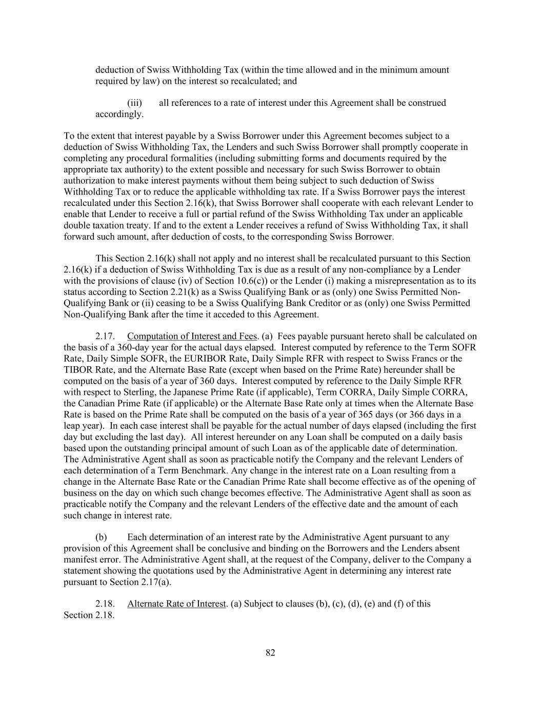 82 deduction of Swiss Withholding Tax (within the time allowed and in the minimum amount required by law) on the interest so recalculated; and (iii) all references to a rate of interest under this Agreement shall be construed accordingly. To the extent that interest payable by a Swiss Borrower under this Agreement becomes subject to a deduction of Swiss Withholding Tax, the Lenders and such Swiss Borrower shall promptly cooperate in completing any procedural formalities (including submitting forms and documents required by the appropriate tax authority) to the extent possible and necessary for such Swiss Borrower to obtain authorization to make interest payments without them being subject to such deduction of Swiss Withholding Tax or to reduce the applicable withholding tax rate. If a Swiss Borrower pays the interest recalculated under this Section 2.16(k), that Swiss Borrower shall cooperate with each relevant Lender to enable that Lender to receive a full or partial refund of the Swiss Withholding Tax under an applicable double taxation treaty. If and to the extent a Lender receives a refund of Swiss Withholding Tax, it shall forward such amount, after deduction of costs, to the corresponding Swiss Borrower. This Section 2.16(k) shall not apply and no interest shall be recalculated pursuant to this Section 2.16(k) if a deduction of Swiss Withholding Tax is due as a result of any non-compliance by a Lender with the provisions of clause (iv) of Section 10.6(c)) or the Lender (i) making a misrepresentation as to its status according to Section 2.21(k) as a Swiss Qualifying Bank or as (only) one Swiss Permitted Non- Qualifying Bank or (ii) ceasing to be a Swiss Qualifying Bank Creditor or as (only) one Swiss Permitted Non-Qualifying Bank after the time it acceded to this Agreement. 2.17. Computation of Interest and Fees. (a) Fees payable pursuant hereto shall be calculated on the basis of a 360-day year for the actual days elapsed. Interest computed by reference to the Term SOFR Rate, Daily Simple SOFR, the EURIBOR Rate, Daily Simple RFR with respect to Swiss Francs or the TIBOR Rate, and the Alternate Base Rate (except when based on the Prime Rate) hereunder shall be computed on the basis of a year of 360 days. Interest computed by reference to the Daily Simple RFR with respect to Sterling, the Japanese Prime Rate (if applicable), Term CORRA, Daily Simple CORRA, the Canadian Prime Rate (if applicable) or the Alternate Base Rate only at times when the Alternate Base Rate is based on the Prime Rate shall be computed on the basis of a year of 365 days (or 366 days in a leap year). In each case interest shall be payable for the actual number of days elapsed (including the first day but excluding the last day). All interest hereunder on any Loan shall be computed on a daily basis based upon the outstanding principal amount of such Loan as of the applicable date of determination. The Administrative Agent shall as soon as practicable notify the Company and the relevant Lenders of each determination of a Term Benchmark. Any change in the interest rate on a Loan resulting from a change in the Alternate Base Rate or the Canadian Prime Rate shall become effective as of the opening of business on the day on which such change becomes effective. The Administrative Agent shall as soon as practicable notify the Company and the relevant Lenders of the effective date and the amount of each such change in interest rate. (b) Each determination of an interest rate by the Administrative Agent pursuant to any provision of this Agreement shall be conclusive and binding on the Borrowers and the Lenders absent manifest error. The Administrative Agent shall, at the request of the Company, deliver to the Company a statement showing the quotations used by the Administrative Agent in determining any interest rate pursuant to Section 2.17(a). 2.18. Alternate Rate of Interest. (a) Subject to clauses (b), (c), (d), (e) and (f) of this Section 2.18.
