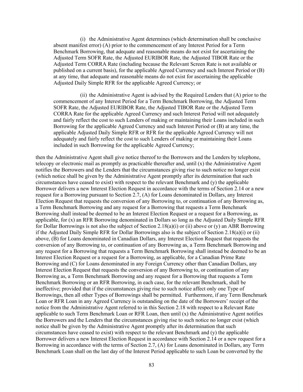 83 (i) the Administrative Agent determines (which determination shall be conclusive absent manifest error) (A) prior to the commencement of any Interest Period for a Term Benchmark Borrowing, that adequate and reasonable means do not exist for ascertaining the Adjusted Term SOFR Rate, the Adjusted EURIBOR Rate, the Adjusted TIBOR Rate or the Adjusted Term CORRA Rate (including because the Relevant Screen Rate is not available or published on a current basis), for the applicable Agreed Currency and such Interest Period or (B) at any time, that adequate and reasonable means do not exist for ascertaining the applicable Adjusted Daily Simple RFR for the applicable Agreed Currency; or (ii) the Administrative Agent is advised by the Required Lenders that (A) prior to the commencement of any Interest Period for a Term Benchmark Borrowing, the Adjusted Term SOFR Rate, the Adjusted EURIBOR Rate, the Adjusted TIBOR Rate or the Adjusted Term CORRA Rate for the applicable Agreed Currency and such Interest Period will not adequately and fairly reflect the cost to such Lenders of making or maintaining their Loans included in such Borrowing for the applicable Agreed Currency and such Interest Period or (B) at any time, the applicable Adjusted Daily Simple RFR or RFR for the applicable Agreed Currency will not adequately and fairly reflect the cost to such Lenders of making or maintaining their Loans included in such Borrowing for the applicable Agreed Currency; then the Administrative Agent shall give notice thereof to the Borrowers and the Lenders by telephone, telecopy or electronic mail as promptly as practicable thereafter and, until (x) the Administrative Agent notifies the Borrowers and the Lenders that the circumstances giving rise to such notice no longer exist (which notice shall be given by the Administrative Agent promptly after its determination that such circumstances have ceased to exist) with respect to the relevant Benchmark and (y) the applicable Borrower delivers a new Interest Election Request in accordance with the terms of Section 2.14 or a new request for a Borrowing pursuant to Section 2.7, (A) for Loans denominated in Dollars, any Interest Election Request that requests the conversion of any Borrowing to, or continuation of any Borrowing as, a Term Benchmark Borrowing and any request for a Borrowing that requests a Term Benchmark Borrowing shall instead be deemed to be an Interest Election Request or a request for a Borrowing, as applicable, for (x) an RFR Borrowing denominated in Dollars so long as the Adjusted Daily Simple RFR for Dollar Borrowings is not also the subject of Section 2.18(a)(i) or (ii) above or (y) an ABR Borrowing if the Adjusted Daily Simple RFR for Dollar Borrowings also is the subject of Section 2.18(a)(i) or (ii) above, (B) for Loans denominated in Canadian Dollars, any Interest Election Request that requests the conversion of any Borrowing to, or continuation of any Borrowing as, a Term Benchmark Borrowing and any request for a Borrowing that requests a Term Benchmark Borrowing shall instead be deemed to be an Interest Election Request or a request for a Borrowing, as applicable, for a Canadian Prime Rate Borrowing and (C) for Loans denominated in any Foreign Currency other than Canadian Dollars, any Interest Election Request that requests the conversion of any Borrowing to, or continuation of any Borrowing as, a Term Benchmark Borrowing and any request for a Borrowing that requests a Term Benchmark Borrowing or an RFR Borrowing, in each case, for the relevant Benchmark, shall be ineffective; provided that if the circumstances giving rise to such notice affect only one Type of Borrowings, then all other Types of Borrowings shall be permitted. Furthermore, if any Term Benchmark Loan or RFR Loan in any Agreed Currency is outstanding on the date of the Borrowers’ receipt of the notice from the Administrative Agent referred to in this Section 2.18 with respect to a Relevant Rate applicable to such Term Benchmark Loan or RFR Loan, then until (x) the Administrative Agent notifies the Borrowers and the Lenders that the circumstances giving rise to such notice no longer exist (which notice shall be given by the Administrative Agent promptly after its determination that such circumstances have ceased to exist) with respect to the relevant Benchmark and (y) the applicable Borrower delivers a new Interest Election Request in accordance with Section 2.14 or a new request for a Borrowing in accordance with the terms of Section 2.7, (A) for Loans denominated in Dollars, any Term Benchmark Loan shall on the last day of the Interest Period applicable to such Loan be converted by the