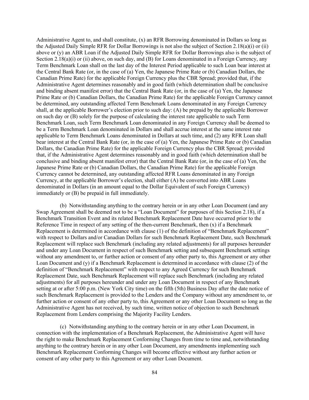 84 Administrative Agent to, and shall constitute, (x) an RFR Borrowing denominated in Dollars so long as the Adjusted Daily Simple RFR for Dollar Borrowings is not also the subject of Section 2.18(a)(i) or (ii) above or (y) an ABR Loan if the Adjusted Daily Simple RFR for Dollar Borrowings also is the subject of Section 2.18(a)(i) or (ii) above, on such day, and (B) for Loans denominated in a Foreign Currency, any Term Benchmark Loan shall on the last day of the Interest Period applicable to such Loan bear interest at the Central Bank Rate (or, in the case of (a) Yen, the Japanese Prime Rate or (b) Canadian Dollars, the Canadian Prime Rate) for the applicable Foreign Currency plus the CBR Spread; provided that, if the Administrative Agent determines reasonably and in good faith (which determination shall be conclusive and binding absent manifest error) that the Central Bank Rate (or, in the case of (a) Yen, the Japanese Prime Rate or (b) Canadian Dollars, the Canadian Prime Rate) for the applicable Foreign Currency cannot be determined, any outstanding affected Term Benchmark Loans denominated in any Foreign Currency shall, at the applicable Borrower’s election prior to such day: (A) be prepaid by the applicable Borrower on such day or (B) solely for the purpose of calculating the interest rate applicable to such Term Benchmark Loan, such Term Benchmark Loan denominated in any Foreign Currency shall be deemed to be a Term Benchmark Loan denominated in Dollars and shall accrue interest at the same interest rate applicable to Term Benchmark Loans denominated in Dollars at such time, and (2) any RFR Loan shall bear interest at the Central Bank Rate (or, in the case of (a) Yen, the Japanese Prime Rate or (b) Canadian Dollars, the Canadian Prime Rate) for the applicable Foreign Currency plus the CBR Spread; provided that, if the Administrative Agent determines reasonably and in good faith (which determination shall be conclusive and binding absent manifest error) that the Central Bank Rate (or, in the case of (a) Yen, the Japanese Prime Rate or (b) Canadian Dollars, the Canadian Prime Rate) for the applicable Foreign Currency cannot be determined, any outstanding affected RFR Loans denominated in any Foreign Currency, at the applicable Borrower’s election, shall either (A) be converted into ABR Loans denominated in Dollars (in an amount equal to the Dollar Equivalent of such Foreign Currency) immediately or (B) be prepaid in full immediately. (b) Notwithstanding anything to the contrary herein or in any other Loan Document (and any Swap Agreement shall be deemed not to be a “Loan Document” for purposes of this Section 2.18), if a Benchmark Transition Event and its related Benchmark Replacement Date have occurred prior to the Reference Time in respect of any setting of the then-current Benchmark, then (x) if a Benchmark Replacement is determined in accordance with clause (1) of the definition of “Benchmark Replacement” with respect to Dollars and/or Canadian Dollars for such Benchmark Replacement Date, such Benchmark Replacement will replace such Benchmark (including any related adjustments) for all purposes hereunder and under any Loan Document in respect of such Benchmark setting and subsequent Benchmark settings without any amendment to, or further action or consent of any other party to, this Agreement or any other Loan Document and (y) if a Benchmark Replacement is determined in accordance with clause (2) of the definition of “Benchmark Replacement” with respect to any Agreed Currency for such Benchmark Replacement Date, such Benchmark Replacement will replace such Benchmark (including any related adjustments) for all purposes hereunder and under any Loan Document in respect of any Benchmark setting at or after 5:00 p.m. (New York City time) on the fifth (5th) Business Day after the date notice of such Benchmark Replacement is provided to the Lenders and the Company without any amendment to, or further action or consent of any other party to, this Agreement or any other Loan Document so long as the Administrative Agent has not received, by such time, written notice of objection to such Benchmark Replacement from Lenders comprising the Majority Facility Lenders. (c) Notwithstanding anything to the contrary herein or in any other Loan Document, in connection with the implementation of a Benchmark Replacement, the Administrative Agent will have the right to make Benchmark Replacement Conforming Changes from time to time and, notwithstanding anything to the contrary herein or in any other Loan Document, any amendments implementing such Benchmark Replacement Conforming Changes will become effective without any further action or consent of any other party to this Agreement or any other Loan Document.