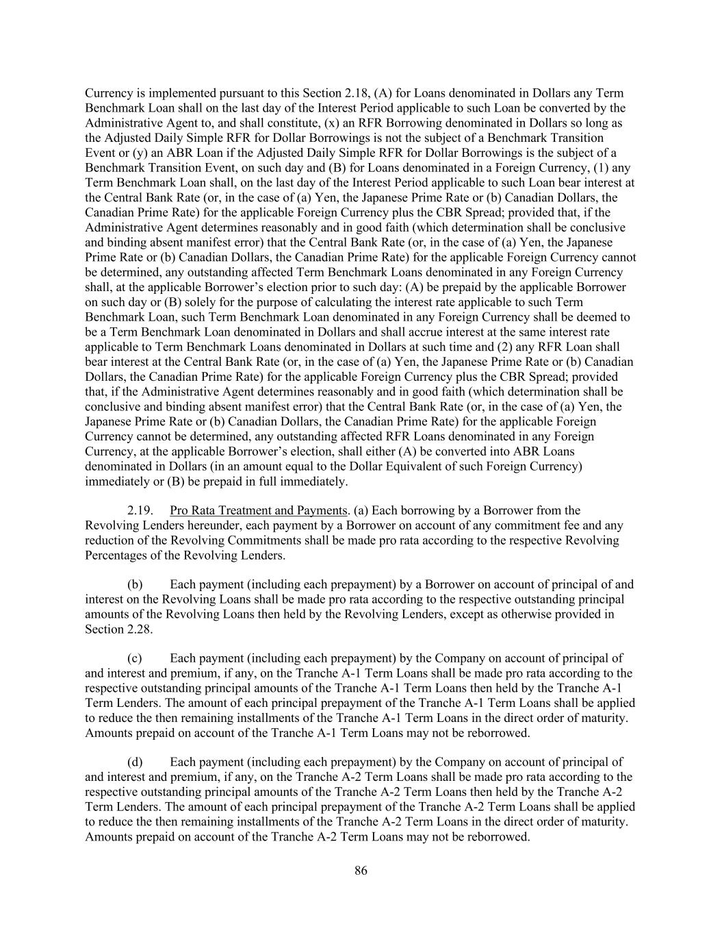 86 Currency is implemented pursuant to this Section 2.18, (A) for Loans denominated in Dollars any Term Benchmark Loan shall on the last day of the Interest Period applicable to such Loan be converted by the Administrative Agent to, and shall constitute, (x) an RFR Borrowing denominated in Dollars so long as the Adjusted Daily Simple RFR for Dollar Borrowings is not the subject of a Benchmark Transition Event or (y) an ABR Loan if the Adjusted Daily Simple RFR for Dollar Borrowings is the subject of a Benchmark Transition Event, on such day and (B) for Loans denominated in a Foreign Currency, (1) any Term Benchmark Loan shall, on the last day of the Interest Period applicable to such Loan bear interest at the Central Bank Rate (or, in the case of (a) Yen, the Japanese Prime Rate or (b) Canadian Dollars, the Canadian Prime Rate) for the applicable Foreign Currency plus the CBR Spread; provided that, if the Administrative Agent determines reasonably and in good faith (which determination shall be conclusive and binding absent manifest error) that the Central Bank Rate (or, in the case of (a) Yen, the Japanese Prime Rate or (b) Canadian Dollars, the Canadian Prime Rate) for the applicable Foreign Currency cannot be determined, any outstanding affected Term Benchmark Loans denominated in any Foreign Currency shall, at the applicable Borrower’s election prior to such day: (A) be prepaid by the applicable Borrower on such day or (B) solely for the purpose of calculating the interest rate applicable to such Term Benchmark Loan, such Term Benchmark Loan denominated in any Foreign Currency shall be deemed to be a Term Benchmark Loan denominated in Dollars and shall accrue interest at the same interest rate applicable to Term Benchmark Loans denominated in Dollars at such time and (2) any RFR Loan shall bear interest at the Central Bank Rate (or, in the case of (a) Yen, the Japanese Prime Rate or (b) Canadian Dollars, the Canadian Prime Rate) for the applicable Foreign Currency plus the CBR Spread; provided that, if the Administrative Agent determines reasonably and in good faith (which determination shall be conclusive and binding absent manifest error) that the Central Bank Rate (or, in the case of (a) Yen, the Japanese Prime Rate or (b) Canadian Dollars, the Canadian Prime Rate) for the applicable Foreign Currency cannot be determined, any outstanding affected RFR Loans denominated in any Foreign Currency, at the applicable Borrower’s election, shall either (A) be converted into ABR Loans denominated in Dollars (in an amount equal to the Dollar Equivalent of such Foreign Currency) immediately or (B) be prepaid in full immediately. 2.19. Pro Rata Treatment and Payments. (a) Each borrowing by a Borrower from the Revolving Lenders hereunder, each payment by a Borrower on account of any commitment fee and any reduction of the Revolving Commitments shall be made pro rata according to the respective Revolving Percentages of the Revolving Lenders. (b) Each payment (including each prepayment) by a Borrower on account of principal of and interest on the Revolving Loans shall be made pro rata according to the respective outstanding principal amounts of the Revolving Loans then held by the Revolving Lenders, except as otherwise provided in Section 2.28. (c) Each payment (including each prepayment) by the Company on account of principal of and interest and premium, if any, on the Tranche A-1 Term Loans shall be made pro rata according to the respective outstanding principal amounts of the Tranche A-1 Term Loans then held by the Tranche A-1 Term Lenders. The amount of each principal prepayment of the Tranche A-1 Term Loans shall be applied to reduce the then remaining installments of the Tranche A-1 Term Loans in the direct order of maturity. Amounts prepaid on account of the Tranche A-1 Term Loans may not be reborrowed. (d) Each payment (including each prepayment) by the Company on account of principal of and interest and premium, if any, on the Tranche A-2 Term Loans shall be made pro rata according to the respective outstanding principal amounts of the Tranche A-2 Term Loans then held by the Tranche A-2 Term Lenders. The amount of each principal prepayment of the Tranche A-2 Term Loans shall be applied to reduce the then remaining installments of the Tranche A-2 Term Loans in the direct order of maturity. Amounts prepaid on account of the Tranche A-2 Term Loans may not be reborrowed.