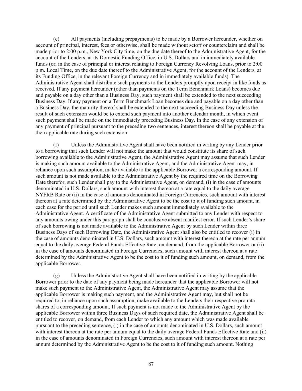 87 (e) All payments (including prepayments) to be made by a Borrower hereunder, whether on account of principal, interest, fees or otherwise, shall be made without setoff or counterclaim and shall be made prior to 2:00 p.m., New York City time, on the due date thereof to the Administrative Agent, for the account of the Lenders, at its Domestic Funding Office, in U.S. Dollars and in immediately available funds (or, in the case of principal or interest relating to Foreign Currency Revolving Loans, prior to 2:00 p.m. Local Time, on the due date thereof to the Administrative Agent, for the account of the Lenders, at its Funding Office, in the relevant Foreign Currency and in immediately available funds). The Administrative Agent shall distribute such payments to the Lenders promptly upon receipt in like funds as received. If any payment hereunder (other than payments on the Term Benchmark Loans) becomes due and payable on a day other than a Business Day, such payment shall be extended to the next succeeding Business Day. If any payment on a Term Benchmark Loan becomes due and payable on a day other than a Business Day, the maturity thereof shall be extended to the next succeeding Business Day unless the result of such extension would be to extend such payment into another calendar month, in which event such payment shall be made on the immediately preceding Business Day. In the case of any extension of any payment of principal pursuant to the preceding two sentences, interest thereon shall be payable at the then applicable rate during such extension. (f) Unless the Administrative Agent shall have been notified in writing by any Lender prior to a borrowing that such Lender will not make the amount that would constitute its share of such borrowing available to the Administrative Agent, the Administrative Agent may assume that such Lender is making such amount available to the Administrative Agent, and the Administrative Agent may, in reliance upon such assumption, make available to the applicable Borrower a corresponding amount. If such amount is not made available to the Administrative Agent by the required time on the Borrowing Date therefor, such Lender shall pay to the Administrative Agent, on demand, (i) in the case of amounts denominated in U.S. Dollars, such amount with interest thereon at a rate equal to the daily average NYFRB Rate or (ii) in the case of amounts denominated in Foreign Currencies, such amount with interest thereon at a rate determined by the Administrative Agent to be the cost to it of funding such amount, in each case for the period until such Lender makes such amount immediately available to the Administrative Agent. A certificate of the Administrative Agent submitted to any Lender with respect to any amounts owing under this paragraph shall be conclusive absent manifest error. If such Lender’s share of such borrowing is not made available to the Administrative Agent by such Lender within three Business Days of such Borrowing Date, the Administrative Agent shall also be entitled to recover (i) in the case of amounts denominated in U.S. Dollars, such amount with interest thereon at the rate per annum equal to the daily average Federal Funds Effective Rate, on demand, from the applicable Borrower or (ii) in the case of amounts denominated in Foreign Currencies, such amount with interest thereon at a rate determined by the Administrative Agent to be the cost to it of funding such amount, on demand, from the applicable Borrower. (g) Unless the Administrative Agent shall have been notified in writing by the applicable Borrower prior to the date of any payment being made hereunder that the applicable Borrower will not make such payment to the Administrative Agent, the Administrative Agent may assume that the applicable Borrower is making such payment, and the Administrative Agent may, but shall not be required to, in reliance upon such assumption, make available to the Lenders their respective pro rata shares of a corresponding amount. If such payment is not made to the Administrative Agent by the applicable Borrower within three Business Days of such required date, the Administrative Agent shall be entitled to recover, on demand, from each Lender to which any amount which was made available pursuant to the preceding sentence, (i) in the case of amounts denominated in U.S. Dollars, such amount with interest thereon at the rate per annum equal to the daily average Federal Funds Effective Rate and (ii) in the case of amounts denominated in Foreign Currencies, such amount with interest thereon at a rate per annum determined by the Administrative Agent to be the cost to it of funding such amount. Nothing