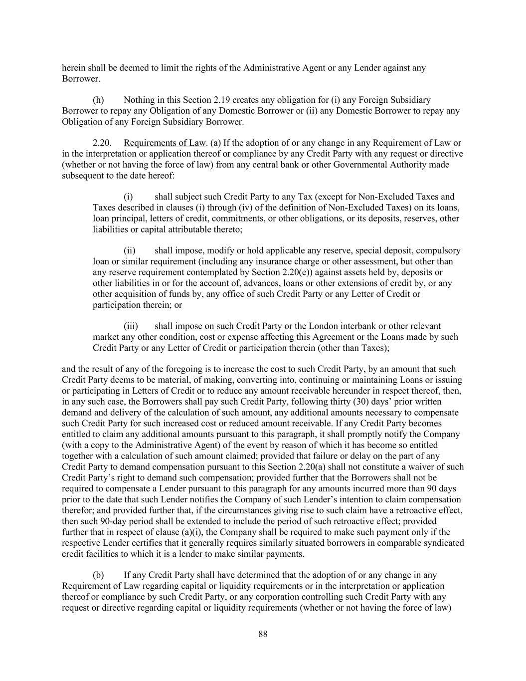 88 herein shall be deemed to limit the rights of the Administrative Agent or any Lender against any Borrower. (h) Nothing in this Section 2.19 creates any obligation for (i) any Foreign Subsidiary Borrower to repay any Obligation of any Domestic Borrower or (ii) any Domestic Borrower to repay any Obligation of any Foreign Subsidiary Borrower. 2.20. Requirements of Law. (a) If the adoption of or any change in any Requirement of Law or in the interpretation or application thereof or compliance by any Credit Party with any request or directive (whether or not having the force of law) from any central bank or other Governmental Authority made subsequent to the date hereof: (i) shall subject such Credit Party to any Tax (except for Non-Excluded Taxes and Taxes described in clauses (i) through (iv) of the definition of Non-Excluded Taxes) on its loans, loan principal, letters of credit, commitments, or other obligations, or its deposits, reserves, other liabilities or capital attributable thereto; (ii) shall impose, modify or hold applicable any reserve, special deposit, compulsory loan or similar requirement (including any insurance charge or other assessment, but other than any reserve requirement contemplated by Section 2.20(e)) against assets held by, deposits or other liabilities in or for the account of, advances, loans or other extensions of credit by, or any other acquisition of funds by, any office of such Credit Party or any Letter of Credit or participation therein; or (iii) shall impose on such Credit Party or the London interbank or other relevant market any other condition, cost or expense affecting this Agreement or the Loans made by such Credit Party or any Letter of Credit or participation therein (other than Taxes); and the result of any of the foregoing is to increase the cost to such Credit Party, by an amount that such Credit Party deems to be material, of making, converting into, continuing or maintaining Loans or issuing or participating in Letters of Credit or to reduce any amount receivable hereunder in respect thereof, then, in any such case, the Borrowers shall pay such Credit Party, following thirty (30) days’ prior written demand and delivery of the calculation of such amount, any additional amounts necessary to compensate such Credit Party for such increased cost or reduced amount receivable. If any Credit Party becomes entitled to claim any additional amounts pursuant to this paragraph, it shall promptly notify the Company (with a copy to the Administrative Agent) of the event by reason of which it has become so entitled together with a calculation of such amount claimed; provided that failure or delay on the part of any Credit Party to demand compensation pursuant to this Section 2.20(a) shall not constitute a waiver of such Credit Party’s right to demand such compensation; provided further that the Borrowers shall not be required to compensate a Lender pursuant to this paragraph for any amounts incurred more than 90 days prior to the date that such Lender notifies the Company of such Lender’s intention to claim compensation therefor; and provided further that, if the circumstances giving rise to such claim have a retroactive effect, then such 90-day period shall be extended to include the period of such retroactive effect; provided further that in respect of clause (a)(i), the Company shall be required to make such payment only if the respective Lender certifies that it generally requires similarly situated borrowers in comparable syndicated credit facilities to which it is a lender to make similar payments. (b) If any Credit Party shall have determined that the adoption of or any change in any Requirement of Law regarding capital or liquidity requirements or in the interpretation or application thereof or compliance by such Credit Party, or any corporation controlling such Credit Party with any request or directive regarding capital or liquidity requirements (whether or not having the force of law)