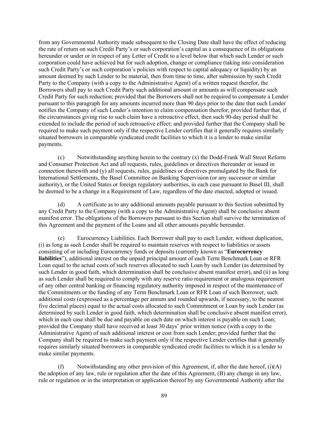 89 from any Governmental Authority made subsequent to the Closing Date shall have the effect of reducing the rate of return on such Credit Party’s or such corporation’s capital as a consequence of its obligations hereunder or under or in respect of any Letter of Credit to a level below that which such Lender or such corporation could have achieved but for such adoption, change or compliance (taking into consideration such Credit Party’s or such corporation’s policies with respect to capital adequacy or liquidity) by an amount deemed by such Lender to be material, then from time to time, after submission by such Credit Party to the Company (with a copy to the Administrative Agent) of a written request therefor, the Borrowers shall pay to such Credit Party such additional amount or amounts as will compensate such Credit Party for such reduction; provided that the Borrowers shall not be required to compensate a Lender pursuant to this paragraph for any amounts incurred more than 90 days prior to the date that such Lender notifies the Company of such Lender’s intention to claim compensation therefor; provided further that, if the circumstances giving rise to such claim have a retroactive effect, then such 90-day period shall be extended to include the period of such retroactive effect; and provided further that the Company shall be required to make such payment only if the respective Lender certifies that it generally requires similarly situated borrowers in comparable syndicated credit facilities to which it is a lender to make similar payments. (c) Notwithstanding anything herein to the contrary (x) the Dodd-Frank Wall Street Reform and Consumer Protection Act and all requests, rules, guidelines or directives thereunder or issued in connection therewith and (y) all requests, rules, guidelines or directives promulgated by the Bank for International Settlements, the Basel Committee on Banking Supervision (or any successor or similar authority), or the United States or foreign regulatory authorities, in each case pursuant to Basel III, shall be deemed to be a change in a Requirement of Law, regardless of the date enacted, adopted or issued. (d) A certificate as to any additional amounts payable pursuant to this Section submitted by any Credit Party to the Company (with a copy to the Administrative Agent) shall be conclusive absent manifest error. The obligations of the Borrowers pursuant to this Section shall survive the termination of this Agreement and the payment of the Loans and all other amounts payable hereunder. (e) Eurocurrency Liabilities. Each Borrower shall pay to each Lender, without duplication, (i) as long as such Lender shall be required to maintain reserves with respect to liabilities or assets consisting of or including Eurocurrency funds or deposits (currently known as “Eurocurrency liabilities”), additional interest on the unpaid principal amount of each Term Benchmark Loan or RFR Loan equal to the actual costs of such reserves allocated to such Loan by such Lender (as determined by such Lender in good faith, which determination shall be conclusive absent manifest error), and (ii) as long as such Lender shall be required to comply with any reserve ratio requirement or analogous requirement of any other central banking or financing regulatory authority imposed in respect of the maintenance of the Commitments or the funding of any Term Benchmark Loan or RFR Loan of such Borrower, such additional costs (expressed as a percentage per annum and rounded upwards, if necessary, to the nearest five decimal places) equal to the actual costs allocated to such Commitment or Loan by such Lender (as determined by such Lender in good faith, which determination shall be conclusive absent manifest error), which in each case shall be due and payable on each date on which interest is payable on such Loan; provided the Company shall have received at least 30 days’ prior written notice (with a copy to the Administrative Agent) of such additional interest or cost from such Lender; provided further that the Company shall be required to make such payment only if the respective Lender certifies that it generally requires similarly situated borrowers in comparable syndicated credit facilities to which it is a lender to make similar payments. (f) Notwithstanding any other provision of this Agreement, if, after the date hereof, (i)(A) the adoption of any law, rule or regulation after the date of this Agreement, (B) any change in any law, rule or regulation or in the interpretation or application thereof by any Governmental Authority after the
