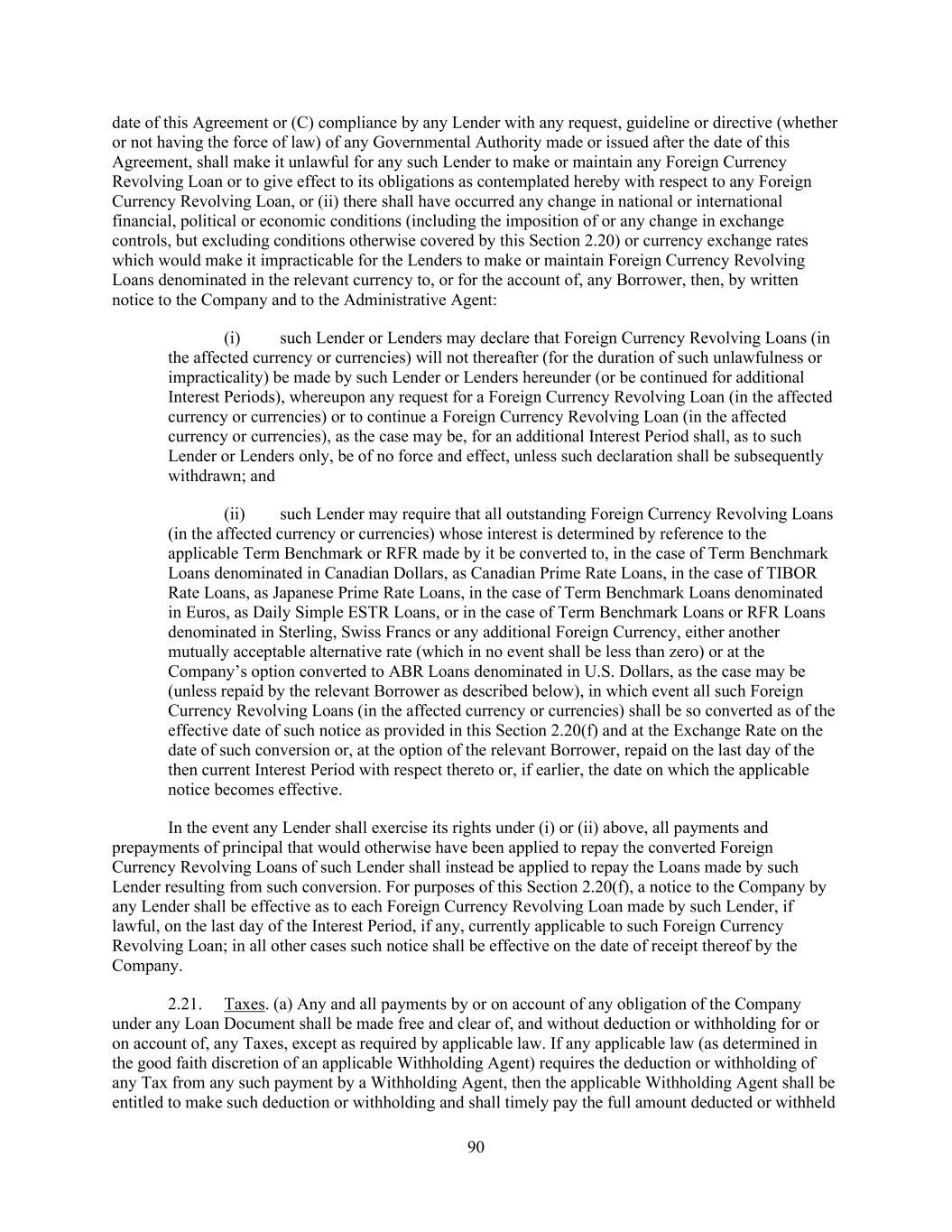 90 date of this Agreement or (C) compliance by any Lender with any request, guideline or directive (whether or not having the force of law) of any Governmental Authority made or issued after the date of this Agreement, shall make it unlawful for any such Lender to make or maintain any Foreign Currency Revolving Loan or to give effect to its obligations as contemplated hereby with respect to any Foreign Currency Revolving Loan, or (ii) there shall have occurred any change in national or international financial, political or economic conditions (including the imposition of or any change in exchange controls, but excluding conditions otherwise covered by this Section 2.20) or currency exchange rates which would make it impracticable for the Lenders to make or maintain Foreign Currency Revolving Loans denominated in the relevant currency to, or for the account of, any Borrower, then, by written notice to the Company and to the Administrative Agent: (i) such Lender or Lenders may declare that Foreign Currency Revolving Loans (in the affected currency or currencies) will not thereafter (for the duration of such unlawfulness or impracticality) be made by such Lender or Lenders hereunder (or be continued for additional Interest Periods), whereupon any request for a Foreign Currency Revolving Loan (in the affected currency or currencies) or to continue a Foreign Currency Revolving Loan (in the affected currency or currencies), as the case may be, for an additional Interest Period shall, as to such Lender or Lenders only, be of no force and effect, unless such declaration shall be subsequently withdrawn; and (ii) such Lender may require that all outstanding Foreign Currency Revolving Loans (in the affected currency or currencies) whose interest is determined by reference to the applicable Term Benchmark or RFR made by it be converted to, in the case of Term Benchmark Loans denominated in Canadian Dollars, as Canadian Prime Rate Loans, in the case of TIBOR Rate Loans, as Japanese Prime Rate Loans, in the case of Term Benchmark Loans denominated in Euros, as Daily Simple ESTR Loans, or in the case of Term Benchmark Loans or RFR Loans denominated in Sterling, Swiss Francs or any additional Foreign Currency, either another mutually acceptable alternative rate (which in no event shall be less than zero) or at the Company’s option converted to ABR Loans denominated in U.S. Dollars, as the case may be (unless repaid by the relevant Borrower as described below), in which event all such Foreign Currency Revolving Loans (in the affected currency or currencies) shall be so converted as of the effective date of such notice as provided in this Section 2.20(f) and at the Exchange Rate on the date of such conversion or, at the option of the relevant Borrower, repaid on the last day of the then current Interest Period with respect thereto or, if earlier, the date on which the applicable notice becomes effective. In the event any Lender shall exercise its rights under (i) or (ii) above, all payments and prepayments of principal that would otherwise have been applied to repay the converted Foreign Currency Revolving Loans of such Lender shall instead be applied to repay the Loans made by such Lender resulting from such conversion. For purposes of this Section 2.20(f), a notice to the Company by any Lender shall be effective as to each Foreign Currency Revolving Loan made by such Lender, if lawful, on the last day of the Interest Period, if any, currently applicable to such Foreign Currency Revolving Loan; in all other cases such notice shall be effective on the date of receipt thereof by the Company. 2.21. Taxes. (a) Any and all payments by or on account of any obligation of the Company under any Loan Document shall be made free and clear of, and without deduction or withholding for or on account of, any Taxes, except as required by applicable law. If any applicable law (as determined in the good faith discretion of an applicable Withholding Agent) requires the deduction or withholding of any Tax from any such payment by a Withholding Agent, then the applicable Withholding Agent shall be entitled to make such deduction or withholding and shall timely pay the full amount deducted or withheld