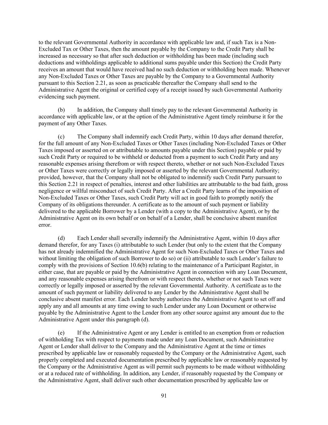 91 to the relevant Governmental Authority in accordance with applicable law and, if such Tax is a Non- Excluded Tax or Other Taxes, then the amount payable by the Company to the Credit Party shall be increased as necessary so that after such deduction or withholding has been made (including such deductions and withholdings applicable to additional sums payable under this Section) the Credit Party receives an amount that would have received had no such deduction or withholding been made. Whenever any Non-Excluded Taxes or Other Taxes are payable by the Company to a Governmental Authority pursuant to this Section 2.21, as soon as practicable thereafter the Company shall send to the Administrative Agent the original or certified copy of a receipt issued by such Governmental Authority evidencing such payment. (b) In addition, the Company shall timely pay to the relevant Governmental Authority in accordance with applicable law, or at the option of the Administrative Agent timely reimburse it for the payment of any Other Taxes. (c) The Company shall indemnify each Credit Party, within 10 days after demand therefor, for the full amount of any Non-Excluded Taxes or Other Taxes (including Non-Excluded Taxes or Other Taxes imposed or asserted on or attributable to amounts payable under this Section) payable or paid by such Credit Party or required to be withheld or deducted from a payment to such Credit Party and any reasonable expenses arising therefrom or with respect thereto, whether or not such Non-Excluded Taxes or Other Taxes were correctly or legally imposed or asserted by the relevant Governmental Authority; provided, however, that the Company shall not be obligated to indemnify such Credit Party pursuant to this Section 2.21 in respect of penalties, interest and other liabilities are attributable to the bad faith, gross negligence or willful misconduct of such Credit Party. After a Credit Party learns of the imposition of Non-Excluded Taxes or Other Taxes, such Credit Party will act in good faith to promptly notify the Company of its obligations thereunder. A certificate as to the amount of such payment or liability delivered to the applicable Borrower by a Lender (with a copy to the Administrative Agent), or by the Administrative Agent on its own behalf or on behalf of a Lender, shall be conclusive absent manifest error. (d) Each Lender shall severally indemnify the Administrative Agent, within 10 days after demand therefor, for any Taxes (i) attributable to such Lender (but only to the extent that the Company has not already indemnified the Administrative Agent for such Non-Excluded Taxes or Other Taxes and without limiting the obligation of such Borrower to do so) or (ii) attributable to such Lender’s failure to comply with the provisions of Section 10.6(b) relating to the maintenance of a Participant Register, in either case, that are payable or paid by the Administrative Agent in connection with any Loan Document, and any reasonable expenses arising therefrom or with respect thereto, whether or not such Taxes were correctly or legally imposed or asserted by the relevant Governmental Authority. A certificate as to the amount of such payment or liability delivered to any Lender by the Administrative Agent shall be conclusive absent manifest error. Each Lender hereby authorizes the Administrative Agent to set off and apply any and all amounts at any time owing to such Lender under any Loan Document or otherwise payable by the Administrative Agent to the Lender from any other source against any amount due to the Administrative Agent under this paragraph (d). (e) If the Administrative Agent or any Lender is entitled to an exemption from or reduction of withholding Tax with respect to payments made under any Loan Document, such Administrative Agent or Lender shall deliver to the Company and the Administrative Agent at the time or times prescribed by applicable law or reasonably requested by the Company or the Administrative Agent, such properly completed and executed documentation prescribed by applicable law or reasonably requested by the Company or the Administrative Agent as will permit such payments to be made without withholding or at a reduced rate of withholding. In addition, any Lender, if reasonably requested by the Company or the Administrative Agent, shall deliver such other documentation prescribed by applicable law or
