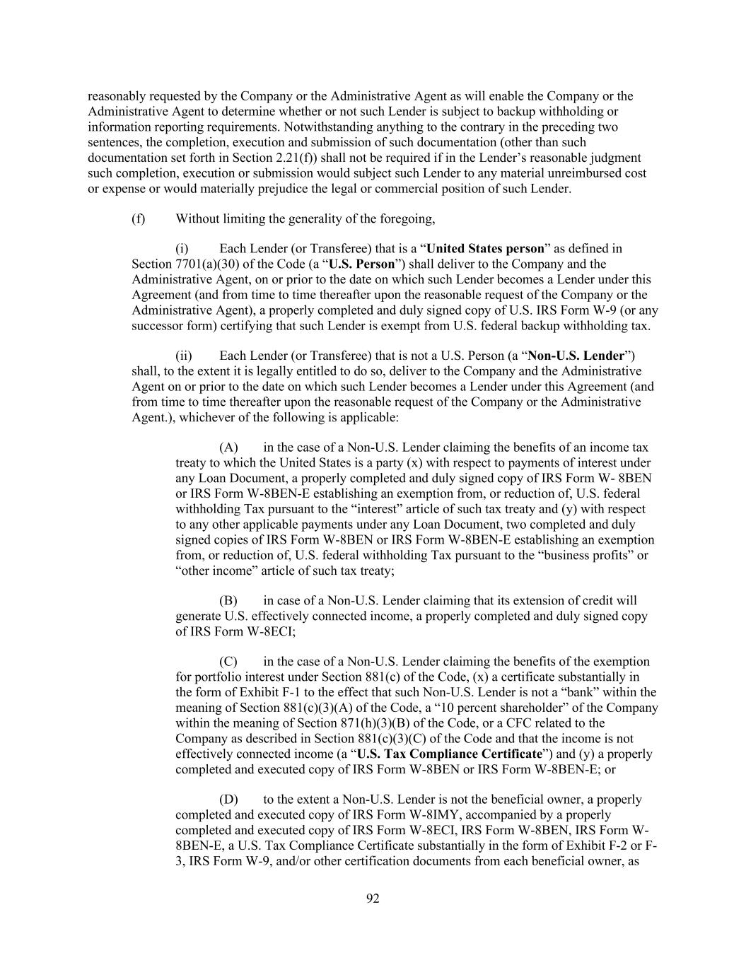 92 reasonably requested by the Company or the Administrative Agent as will enable the Company or the Administrative Agent to determine whether or not such Lender is subject to backup withholding or information reporting requirements. Notwithstanding anything to the contrary in the preceding two sentences, the completion, execution and submission of such documentation (other than such documentation set forth in Section 2.21(f)) shall not be required if in the Lender’s reasonable judgment such completion, execution or submission would subject such Lender to any material unreimbursed cost or expense or would materially prejudice the legal or commercial position of such Lender. (f) Without limiting the generality of the foregoing, (i) Each Lender (or Transferee) that is a “United States person” as defined in Section 7701(a)(30) of the Code (a “U.S. Person”) shall deliver to the Company and the Administrative Agent, on or prior to the date on which such Lender becomes a Lender under this Agreement (and from time to time thereafter upon the reasonable request of the Company or the Administrative Agent), a properly completed and duly signed copy of U.S. IRS Form W-9 (or any successor form) certifying that such Lender is exempt from U.S. federal backup withholding tax. (ii) Each Lender (or Transferee) that is not a U.S. Person (a “Non-U.S. Lender”) shall, to the extent it is legally entitled to do so, deliver to the Company and the Administrative Agent on or prior to the date on which such Lender becomes a Lender under this Agreement (and from time to time thereafter upon the reasonable request of the Company or the Administrative Agent.), whichever of the following is applicable: (A) in the case of a Non-U.S. Lender claiming the benefits of an income tax treaty to which the United States is a party (x) with respect to payments of interest under any Loan Document, a properly completed and duly signed copy of IRS Form W- 8BEN or IRS Form W-8BEN-E establishing an exemption from, or reduction of, U.S. federal withholding Tax pursuant to the “interest” article of such tax treaty and (y) with respect to any other applicable payments under any Loan Document, two completed and duly signed copies of IRS Form W-8BEN or IRS Form W-8BEN-E establishing an exemption from, or reduction of, U.S. federal withholding Tax pursuant to the “business profits” or “other income” article of such tax treaty; (B) in case of a Non-U.S. Lender claiming that its extension of credit will generate U.S. effectively connected income, a properly completed and duly signed copy of IRS Form W-8ECI; (C) in the case of a Non-U.S. Lender claiming the benefits of the exemption for portfolio interest under Section 881(c) of the Code, (x) a certificate substantially in the form of Exhibit F-1 to the effect that such Non-U.S. Lender is not a “bank” within the meaning of Section 881(c)(3)(A) of the Code, a “10 percent shareholder” of the Company within the meaning of Section 871(h)(3)(B) of the Code, or a CFC related to the Company as described in Section 881(c)(3)(C) of the Code and that the income is not effectively connected income (a “U.S. Tax Compliance Certificate”) and (y) a properly completed and executed copy of IRS Form W-8BEN or IRS Form W-8BEN-E; or (D) to the extent a Non-U.S. Lender is not the beneficial owner, a properly completed and executed copy of IRS Form W-8IMY, accompanied by a properly completed and executed copy of IRS Form W-8ECI, IRS Form W-8BEN, IRS Form W- 8BEN-E, a U.S. Tax Compliance Certificate substantially in the form of Exhibit F-2 or F- 3, IRS Form W-9, and/or other certification documents from each beneficial owner, as