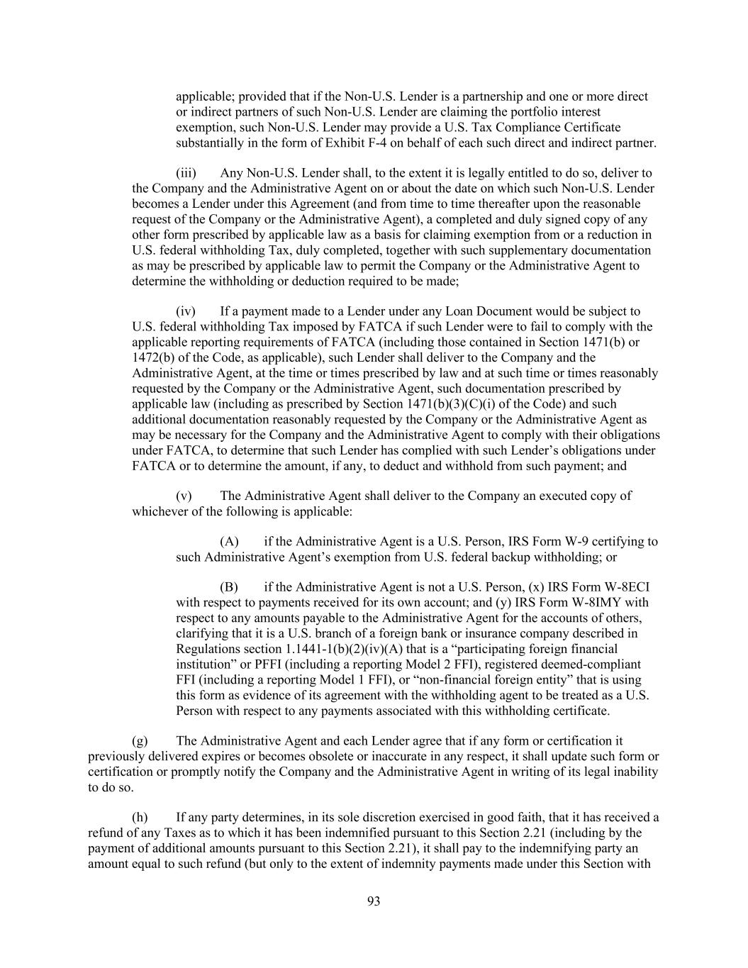 93 applicable; provided that if the Non-U.S. Lender is a partnership and one or more direct or indirect partners of such Non-U.S. Lender are claiming the portfolio interest exemption, such Non-U.S. Lender may provide a U.S. Tax Compliance Certificate substantially in the form of Exhibit F-4 on behalf of each such direct and indirect partner. (iii) Any Non-U.S. Lender shall, to the extent it is legally entitled to do so, deliver to the Company and the Administrative Agent on or about the date on which such Non-U.S. Lender becomes a Lender under this Agreement (and from time to time thereafter upon the reasonable request of the Company or the Administrative Agent), a completed and duly signed copy of any other form prescribed by applicable law as a basis for claiming exemption from or a reduction in U.S. federal withholding Tax, duly completed, together with such supplementary documentation as may be prescribed by applicable law to permit the Company or the Administrative Agent to determine the withholding or deduction required to be made; (iv) If a payment made to a Lender under any Loan Document would be subject to U.S. federal withholding Tax imposed by FATCA if such Lender were to fail to comply with the applicable reporting requirements of FATCA (including those contained in Section 1471(b) or 1472(b) of the Code, as applicable), such Lender shall deliver to the Company and the Administrative Agent, at the time or times prescribed by law and at such time or times reasonably requested by the Company or the Administrative Agent, such documentation prescribed by applicable law (including as prescribed by Section 1471(b)(3)(C)(i) of the Code) and such additional documentation reasonably requested by the Company or the Administrative Agent as may be necessary for the Company and the Administrative Agent to comply with their obligations under FATCA, to determine that such Lender has complied with such Lender’s obligations under FATCA or to determine the amount, if any, to deduct and withhold from such payment; and (v) The Administrative Agent shall deliver to the Company an executed copy of whichever of the following is applicable: (A) if the Administrative Agent is a U.S. Person, IRS Form W-9 certifying to such Administrative Agent’s exemption from U.S. federal backup withholding; or (B) if the Administrative Agent is not a U.S. Person, (x) IRS Form W-8ECI with respect to payments received for its own account; and (y) IRS Form W-8IMY with respect to any amounts payable to the Administrative Agent for the accounts of others, clarifying that it is a U.S. branch of a foreign bank or insurance company described in Regulations section 1.1441-1(b)(2)(iv)(A) that is a “participating foreign financial institution” or PFFI (including a reporting Model 2 FFI), registered deemed-compliant FFI (including a reporting Model 1 FFI), or “non-financial foreign entity” that is using this form as evidence of its agreement with the withholding agent to be treated as a U.S. Person with respect to any payments associated with this withholding certificate. (g) The Administrative Agent and each Lender agree that if any form or certification it previously delivered expires or becomes obsolete or inaccurate in any respect, it shall update such form or certification or promptly notify the Company and the Administrative Agent in writing of its legal inability to do so. (h) If any party determines, in its sole discretion exercised in good faith, that it has received a refund of any Taxes as to which it has been indemnified pursuant to this Section 2.21 (including by the payment of additional amounts pursuant to this Section 2.21), it shall pay to the indemnifying party an amount equal to such refund (but only to the extent of indemnity payments made under this Section with