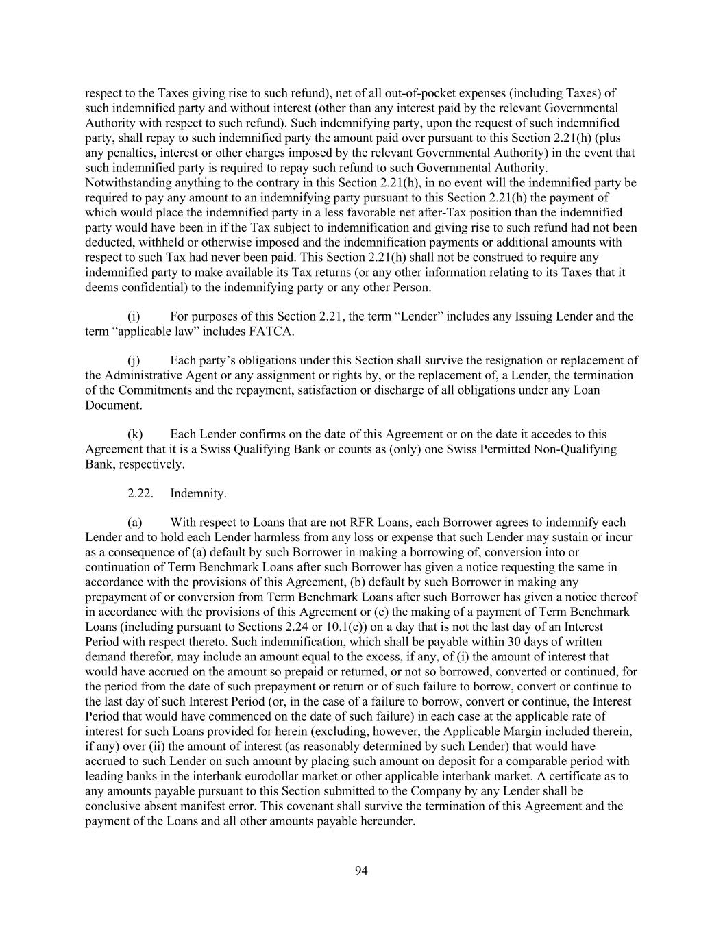 94 respect to the Taxes giving rise to such refund), net of all out-of-pocket expenses (including Taxes) of such indemnified party and without interest (other than any interest paid by the relevant Governmental Authority with respect to such refund). Such indemnifying party, upon the request of such indemnified party, shall repay to such indemnified party the amount paid over pursuant to this Section 2.21(h) (plus any penalties, interest or other charges imposed by the relevant Governmental Authority) in the event that such indemnified party is required to repay such refund to such Governmental Authority. Notwithstanding anything to the contrary in this Section 2.21(h), in no event will the indemnified party be required to pay any amount to an indemnifying party pursuant to this Section 2.21(h) the payment of which would place the indemnified party in a less favorable net after-Tax position than the indemnified party would have been in if the Tax subject to indemnification and giving rise to such refund had not been deducted, withheld or otherwise imposed and the indemnification payments or additional amounts with respect to such Tax had never been paid. This Section 2.21(h) shall not be construed to require any indemnified party to make available its Tax returns (or any other information relating to its Taxes that it deems confidential) to the indemnifying party or any other Person. (i) For purposes of this Section 2.21, the term “Lender” includes any Issuing Lender and the term “applicable law” includes FATCA. (j) Each party’s obligations under this Section shall survive the resignation or replacement of the Administrative Agent or any assignment or rights by, or the replacement of, a Lender, the termination of the Commitments and the repayment, satisfaction or discharge of all obligations under any Loan Document. (k) Each Lender confirms on the date of this Agreement or on the date it accedes to this Agreement that it is a Swiss Qualifying Bank or counts as (only) one Swiss Permitted Non-Qualifying Bank, respectively. 2.22. Indemnity. (a) With respect to Loans that are not RFR Loans, each Borrower agrees to indemnify each Lender and to hold each Lender harmless from any loss or expense that such Lender may sustain or incur as a consequence of (a) default by such Borrower in making a borrowing of, conversion into or continuation of Term Benchmark Loans after such Borrower has given a notice requesting the same in accordance with the provisions of this Agreement, (b) default by such Borrower in making any prepayment of or conversion from Term Benchmark Loans after such Borrower has given a notice thereof in accordance with the provisions of this Agreement or (c) the making of a payment of Term Benchmark Loans (including pursuant to Sections 2.24 or 10.1(c)) on a day that is not the last day of an Interest Period with respect thereto. Such indemnification, which shall be payable within 30 days of written demand therefor, may include an amount equal to the excess, if any, of (i) the amount of interest that would have accrued on the amount so prepaid or returned, or not so borrowed, converted or continued, for the period from the date of such prepayment or return or of such failure to borrow, convert or continue to the last day of such Interest Period (or, in the case of a failure to borrow, convert or continue, the Interest Period that would have commenced on the date of such failure) in each case at the applicable rate of interest for such Loans provided for herein (excluding, however, the Applicable Margin included therein, if any) over (ii) the amount of interest (as reasonably determined by such Lender) that would have accrued to such Lender on such amount by placing such amount on deposit for a comparable period with leading banks in the interbank eurodollar market or other applicable interbank market. A certificate as to any amounts payable pursuant to this Section submitted to the Company by any Lender shall be conclusive absent manifest error. This covenant shall survive the termination of this Agreement and the payment of the Loans and all other amounts payable hereunder.