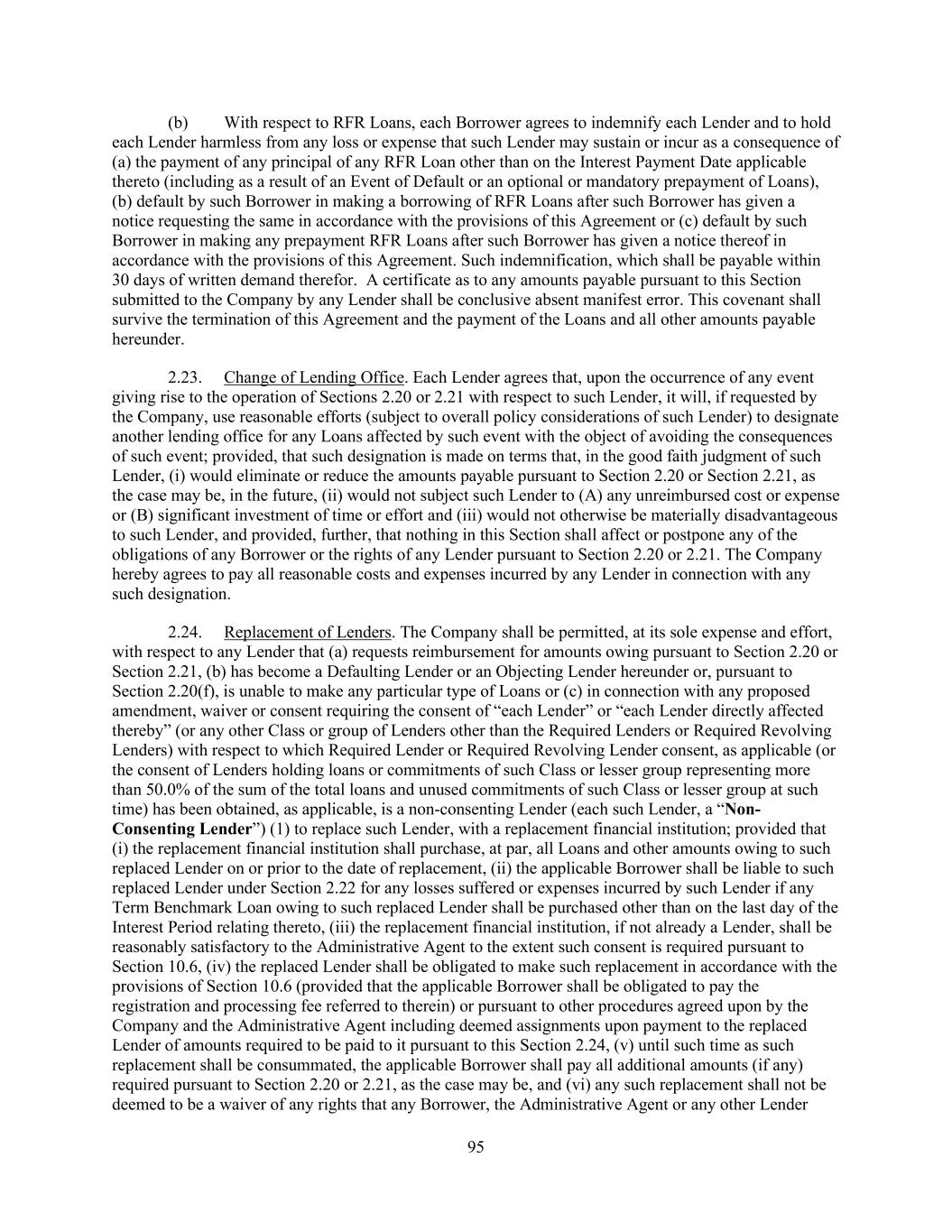 95 (b) With respect to RFR Loans, each Borrower agrees to indemnify each Lender and to hold each Lender harmless from any loss or expense that such Lender may sustain or incur as a consequence of (a) the payment of any principal of any RFR Loan other than on the Interest Payment Date applicable thereto (including as a result of an Event of Default or an optional or mandatory prepayment of Loans), (b) default by such Borrower in making a borrowing of RFR Loans after such Borrower has given a notice requesting the same in accordance with the provisions of this Agreement or (c) default by such Borrower in making any prepayment RFR Loans after such Borrower has given a notice thereof in accordance with the provisions of this Agreement. Such indemnification, which shall be payable within 30 days of written demand therefor. A certificate as to any amounts payable pursuant to this Section submitted to the Company by any Lender shall be conclusive absent manifest error. This covenant shall survive the termination of this Agreement and the payment of the Loans and all other amounts payable hereunder. 2.23. Change of Lending Office. Each Lender agrees that, upon the occurrence of any event giving rise to the operation of Sections 2.20 or 2.21 with respect to such Lender, it will, if requested by the Company, use reasonable efforts (subject to overall policy considerations of such Lender) to designate another lending office for any Loans affected by such event with the object of avoiding the consequences of such event; provided, that such designation is made on terms that, in the good faith judgment of such Lender, (i) would eliminate or reduce the amounts payable pursuant to Section 2.20 or Section 2.21, as the case may be, in the future, (ii) would not subject such Lender to (A) any unreimbursed cost or expense or (B) significant investment of time or effort and (iii) would not otherwise be materially disadvantageous to such Lender, and provided, further, that nothing in this Section shall affect or postpone any of the obligations of any Borrower or the rights of any Lender pursuant to Section 2.20 or 2.21. The Company hereby agrees to pay all reasonable costs and expenses incurred by any Lender in connection with any such designation. 2.24. Replacement of Lenders. The Company shall be permitted, at its sole expense and effort, with respect to any Lender that (a) requests reimbursement for amounts owing pursuant to Section 2.20 or Section 2.21, (b) has become a Defaulting Lender or an Objecting Lender hereunder or, pursuant to Section 2.20(f), is unable to make any particular type of Loans or (c) in connection with any proposed amendment, waiver or consent requiring the consent of “each Lender” or “each Lender directly affected thereby” (or any other Class or group of Lenders other than the Required Lenders or Required Revolving Lenders) with respect to which Required Lender or Required Revolving Lender consent, as applicable (or the consent of Lenders holding loans or commitments of such Class or lesser group representing more than 50.0% of the sum of the total loans and unused commitments of such Class or lesser group at such time) has been obtained, as applicable, is a non-consenting Lender (each such Lender, a “Non- Consenting Lender”) (1) to replace such Lender, with a replacement financial institution; provided that (i) the replacement financial institution shall purchase, at par, all Loans and other amounts owing to such replaced Lender on or prior to the date of replacement, (ii) the applicable Borrower shall be liable to such replaced Lender under Section 2.22 for any losses suffered or expenses incurred by such Lender if any Term Benchmark Loan owing to such replaced Lender shall be purchased other than on the last day of the Interest Period relating thereto, (iii) the replacement financial institution, if not already a Lender, shall be reasonably satisfactory to the Administrative Agent to the extent such consent is required pursuant to Section 10.6, (iv) the replaced Lender shall be obligated to make such replacement in accordance with the provisions of Section 10.6 (provided that the applicable Borrower shall be obligated to pay the registration and processing fee referred to therein) or pursuant to other procedures agreed upon by the Company and the Administrative Agent including deemed assignments upon payment to the replaced Lender of amounts required to be paid to it pursuant to this Section 2.24, (v) until such time as such replacement shall be consummated, the applicable Borrower shall pay all additional amounts (if any) required pursuant to Section 2.20 or 2.21, as the case may be, and (vi) any such replacement shall not be deemed to be a waiver of any rights that any Borrower, the Administrative Agent or any other Lender