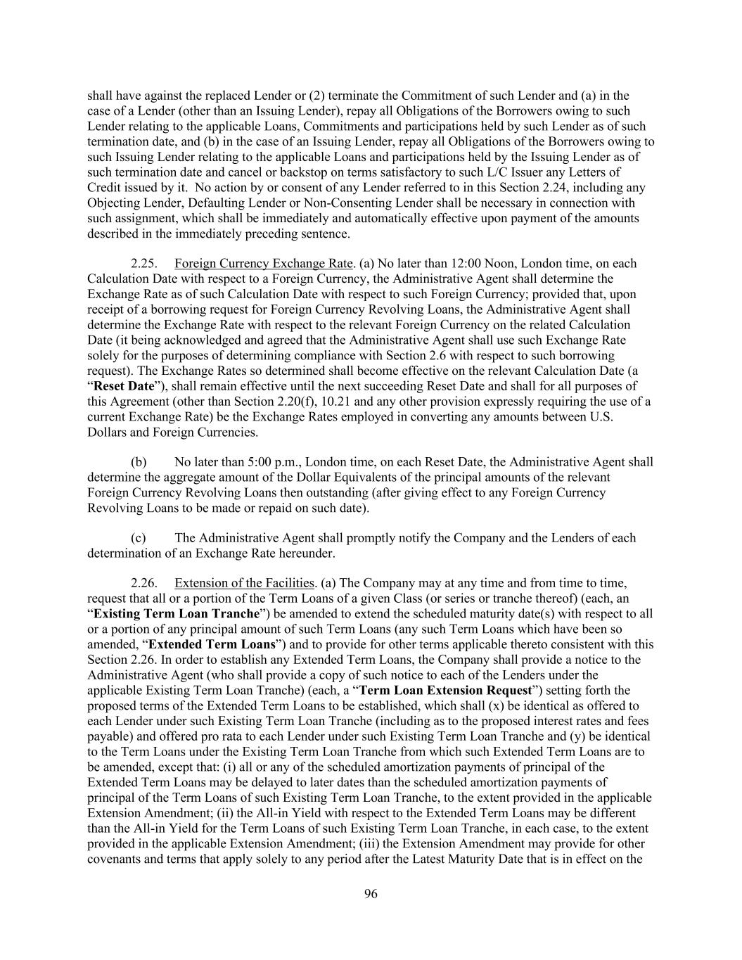 96 shall have against the replaced Lender or (2) terminate the Commitment of such Lender and (a) in the case of a Lender (other than an Issuing Lender), repay all Obligations of the Borrowers owing to such Lender relating to the applicable Loans, Commitments and participations held by such Lender as of such termination date, and (b) in the case of an Issuing Lender, repay all Obligations of the Borrowers owing to such Issuing Lender relating to the applicable Loans and participations held by the Issuing Lender as of such termination date and cancel or backstop on terms satisfactory to such L/C Issuer any Letters of Credit issued by it. No action by or consent of any Lender referred to in this Section 2.24, including any Objecting Lender, Defaulting Lender or Non-Consenting Lender shall be necessary in connection with such assignment, which shall be immediately and automatically effective upon payment of the amounts described in the immediately preceding sentence. 2.25. Foreign Currency Exchange Rate. (a) No later than 12:00 Noon, London time, on each Calculation Date with respect to a Foreign Currency, the Administrative Agent shall determine the Exchange Rate as of such Calculation Date with respect to such Foreign Currency; provided that, upon receipt of a borrowing request for Foreign Currency Revolving Loans, the Administrative Agent shall determine the Exchange Rate with respect to the relevant Foreign Currency on the related Calculation Date (it being acknowledged and agreed that the Administrative Agent shall use such Exchange Rate solely for the purposes of determining compliance with Section 2.6 with respect to such borrowing request). The Exchange Rates so determined shall become effective on the relevant Calculation Date (a “Reset Date”), shall remain effective until the next succeeding Reset Date and shall for all purposes of this Agreement (other than Section 2.20(f), 10.21 and any other provision expressly requiring the use of a current Exchange Rate) be the Exchange Rates employed in converting any amounts between U.S. Dollars and Foreign Currencies. (b) No later than 5:00 p.m., London time, on each Reset Date, the Administrative Agent shall determine the aggregate amount of the Dollar Equivalents of the principal amounts of the relevant Foreign Currency Revolving Loans then outstanding (after giving effect to any Foreign Currency Revolving Loans to be made or repaid on such date). (c) The Administrative Agent shall promptly notify the Company and the Lenders of each determination of an Exchange Rate hereunder. 2.26. Extension of the Facilities. (a) The Company may at any time and from time to time, request that all or a portion of the Term Loans of a given Class (or series or tranche thereof) (each, an “Existing Term Loan Tranche”) be amended to extend the scheduled maturity date(s) with respect to all or a portion of any principal amount of such Term Loans (any such Term Loans which have been so amended, “Extended Term Loans”) and to provide for other terms applicable thereto consistent with this Section 2.26. In order to establish any Extended Term Loans, the Company shall provide a notice to the Administrative Agent (who shall provide a copy of such notice to each of the Lenders under the applicable Existing Term Loan Tranche) (each, a “Term Loan Extension Request”) setting forth the proposed terms of the Extended Term Loans to be established, which shall (x) be identical as offered to each Lender under such Existing Term Loan Tranche (including as to the proposed interest rates and fees payable) and offered pro rata to each Lender under such Existing Term Loan Tranche and (y) be identical to the Term Loans under the Existing Term Loan Tranche from which such Extended Term Loans are to be amended, except that: (i) all or any of the scheduled amortization payments of principal of the Extended Term Loans may be delayed to later dates than the scheduled amortization payments of principal of the Term Loans of such Existing Term Loan Tranche, to the extent provided in the applicable Extension Amendment; (ii) the All-in Yield with respect to the Extended Term Loans may be different than the All-in Yield for the Term Loans of such Existing Term Loan Tranche, in each case, to the extent provided in the applicable Extension Amendment; (iii) the Extension Amendment may provide for other covenants and terms that apply solely to any period after the Latest Maturity Date that is in effect on the