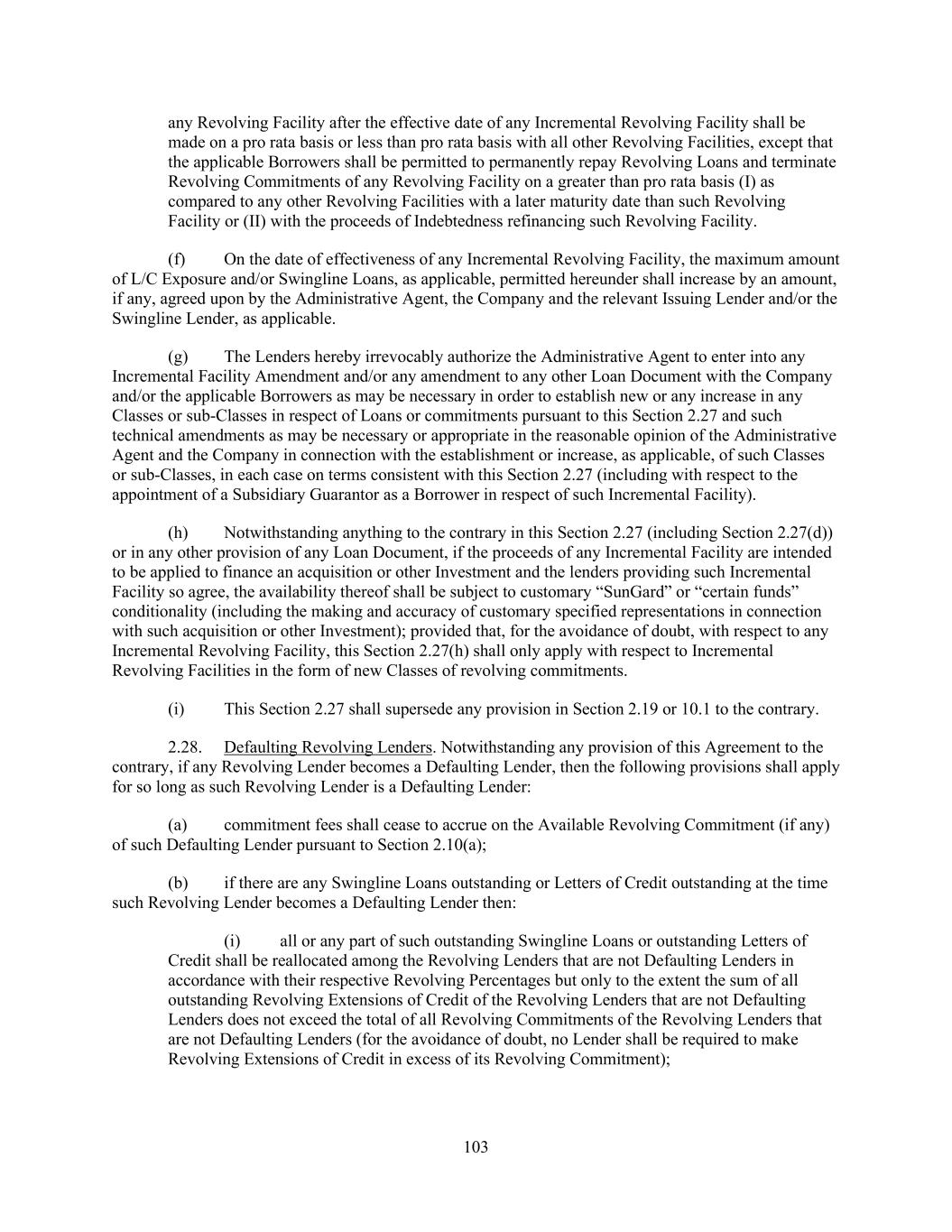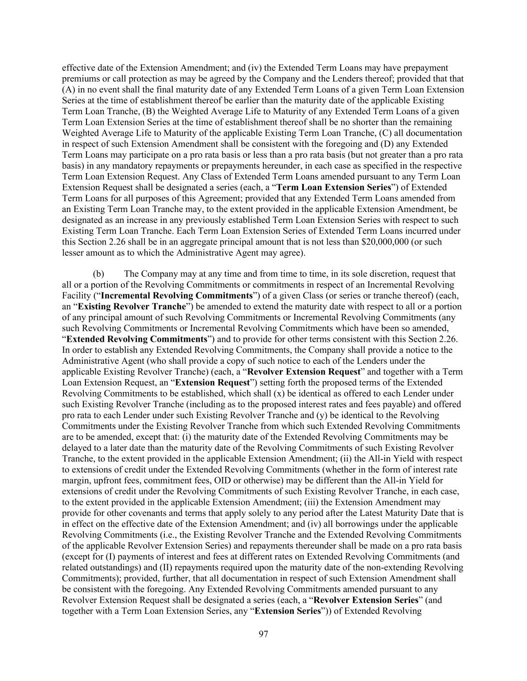 97 effective date of the Extension Amendment; and (iv) the Extended Term Loans may have prepayment premiums or call protection as may be agreed by the Company and the Lenders thereof; provided that that (A) in no event shall the final maturity date of any Extended Term Loans of a given Term Loan Extension Series at the time of establishment thereof be earlier than the maturity date of the applicable Existing Term Loan Tranche, (B) the Weighted Average Life to Maturity of any Extended Term Loans of a given Term Loan Extension Series at the time of establishment thereof shall be no shorter than the remaining Weighted Average Life to Maturity of the applicable Existing Term Loan Tranche, (C) all documentation in respect of such Extension Amendment shall be consistent with the foregoing and (D) any Extended Term Loans may participate on a pro rata basis or less than a pro rata basis (but not greater than a pro rata basis) in any mandatory repayments or prepayments hereunder, in each case as specified in the respective Term Loan Extension Request. Any Class of Extended Term Loans amended pursuant to any Term Loan Extension Request shall be designated a series (each, a “Term Loan Extension Series”) of Extended Term Loans for all purposes of this Agreement; provided that any Extended Term Loans amended from an Existing Term Loan Tranche may, to the extent provided in the applicable Extension Amendment, be designated as an increase in any previously established Term Loan Extension Series with respect to such Existing Term Loan Tranche. Each Term Loan Extension Series of Extended Term Loans incurred under this Section 2.26 shall be in an aggregate principal amount that is not less than $20,000,000 (or such lesser amount as to which the Administrative Agent may agree). (b) The Company may at any time and from time to time, in its sole discretion, request that all or a portion of the Revolving Commitments or commitments in respect of an Incremental Revolving Facility (“Incremental Revolving Commitments”) of a given Class (or series or tranche thereof) (each, an “Existing Revolver Tranche”) be amended to extend the maturity date with respect to all or a portion of any principal amount of such Revolving Commitments or Incremental Revolving Commitments (any such Revolving Commitments or Incremental Revolving Commitments which have been so amended, “Extended Revolving Commitments”) and to provide for other terms consistent with this Section 2.26. In order to establish any Extended Revolving Commitments, the Company shall provide a notice to the Administrative Agent (who shall provide a copy of such notice to each of the Lenders under the applicable Existing Revolver Tranche) (each, a “Revolver Extension Request” and together with a Term Loan Extension Request, an “Extension Request”) setting forth the proposed terms of the Extended Revolving Commitments to be established, which shall (x) be identical as offered to each Lender under such Existing Revolver Tranche (including as to the proposed interest rates and fees payable) and offered pro rata to each Lender under such Existing Revolver Tranche and (y) be identical to the Revolving Commitments under the Existing Revolver Tranche from which such Extended Revolving Commitments are to be amended, except that: (i) the maturity date of the Extended Revolving Commitments may be delayed to a later date than the maturity date of the Revolving Commitments of such Existing Revolver Tranche, to the extent provided in the applicable Extension Amendment; (ii) the All-in Yield with respect to extensions of credit under the Extended Revolving Commitments (whether in the form of interest rate margin, upfront fees, commitment fees, OID or otherwise) may be different than the All-in Yield for extensions of credit under the Revolving Commitments of such Existing Revolver Tranche, in each case, to the extent provided in the applicable Extension Amendment; (iii) the Extension Amendment may provide for other covenants and terms that apply solely to any period after the Latest Maturity Date that is in effect on the effective date of the Extension Amendment; and (iv) all borrowings under the applicable Revolving Commitments (i.e., the Existing Revolver Tranche and the Extended Revolving Commitments of the applicable Revolver Extension Series) and repayments thereunder shall be made on a pro rata basis (except for (I) payments of interest and fees at different rates on Extended Revolving Commitments (and related outstandings) and (II) repayments required upon the maturity date of the non-extending Revolving Commitments); provided, further, that all documentation in respect of such Extension Amendment shall be consistent with the foregoing. Any Extended Revolving Commitments amended pursuant to any Revolver Extension Request shall be designated a series (each, a “Revolver Extension Series” (and together with a Term Loan Extension Series, any “Extension Series”)) of Extended Revolving