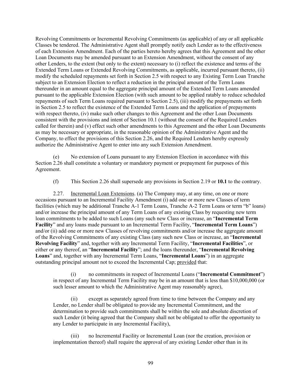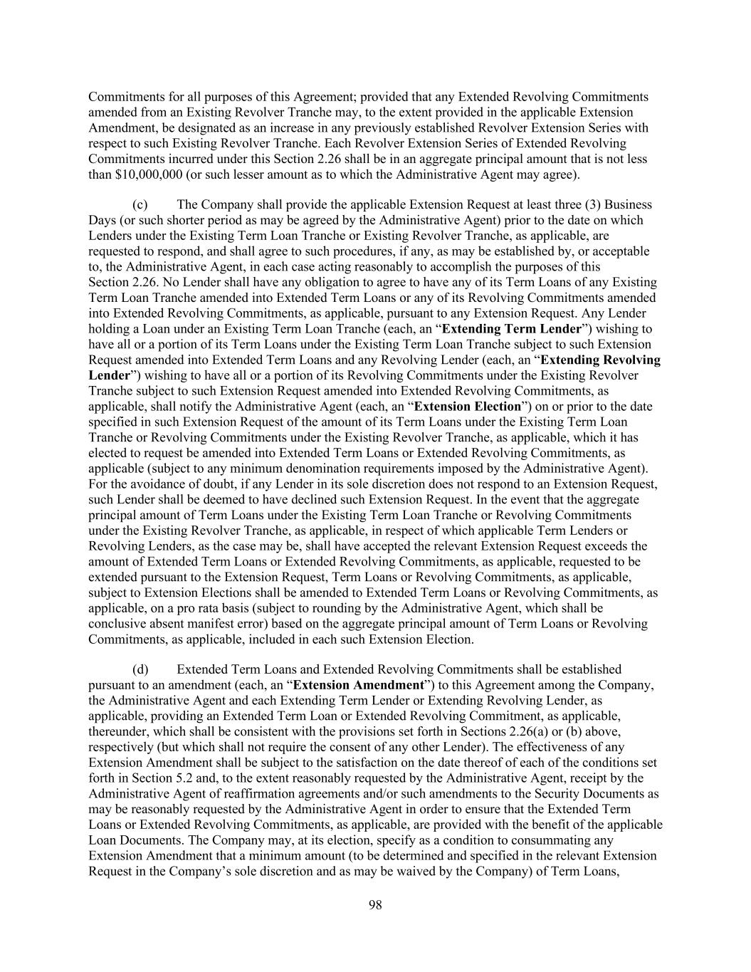 98 Commitments for all purposes of this Agreement; provided that any Extended Revolving Commitments amended from an Existing Revolver Tranche may, to the extent provided in the applicable Extension Amendment, be designated as an increase in any previously established Revolver Extension Series with respect to such Existing Revolver Tranche. Each Revolver Extension Series of Extended Revolving Commitments incurred under this Section 2.26 shall be in an aggregate principal amount that is not less than $10,000,000 (or such lesser amount as to which the Administrative Agent may agree). (c) The Company shall provide the applicable Extension Request at least three (3) Business Days (or such shorter period as may be agreed by the Administrative Agent) prior to the date on which Lenders under the Existing Term Loan Tranche or Existing Revolver Tranche, as applicable, are requested to respond, and shall agree to such procedures, if any, as may be established by, or acceptable to, the Administrative Agent, in each case acting reasonably to accomplish the purposes of this Section 2.26. No Lender shall have any obligation to agree to have any of its Term Loans of any Existing Term Loan Tranche amended into Extended Term Loans or any of its Revolving Commitments amended into Extended Revolving Commitments, as applicable, pursuant to any Extension Request. Any Lender holding a Loan under an Existing Term Loan Tranche (each, an “Extending Term Lender”) wishing to have all or a portion of its Term Loans under the Existing Term Loan Tranche subject to such Extension Request amended into Extended Term Loans and any Revolving Lender (each, an “Extending Revolving Lender”) wishing to have all or a portion of its Revolving Commitments under the Existing Revolver Tranche subject to such Extension Request amended into Extended Revolving Commitments, as applicable, shall notify the Administrative Agent (each, an “Extension Election”) on or prior to the date specified in such Extension Request of the amount of its Term Loans under the Existing Term Loan Tranche or Revolving Commitments under the Existing Revolver Tranche, as applicable, which it has elected to request be amended into Extended Term Loans or Extended Revolving Commitments, as applicable (subject to any minimum denomination requirements imposed by the Administrative Agent). For the avoidance of doubt, if any Lender in its sole discretion does not respond to an Extension Request, such Lender shall be deemed to have declined such Extension Request. In the event that the aggregate principal amount of Term Loans under the Existing Term Loan Tranche or Revolving Commitments under the Existing Revolver Tranche, as applicable, in respect of which applicable Term Lenders or Revolving Lenders, as the case may be, shall have accepted the relevant Extension Request exceeds the amount of Extended Term Loans or Extended Revolving Commitments, as applicable, requested to be extended pursuant to the Extension Request, Term Loans or Revolving Commitments, as applicable, subject to Extension Elections shall be amended to Extended Term Loans or Revolving Commitments, as applicable, on a pro rata basis (subject to rounding by the Administrative Agent, which shall be conclusive absent manifest error) based on the aggregate principal amount of Term Loans or Revolving Commitments, as applicable, included in each such Extension Election. (d) Extended Term Loans and Extended Revolving Commitments shall be established pursuant to an amendment (each, an “Extension Amendment”) to this Agreement among the Company, the Administrative Agent and each Extending Term Lender or Extending Revolving Lender, as applicable, providing an Extended Term Loan or Extended Revolving Commitment, as applicable, thereunder, which shall be consistent with the provisions set forth in Sections 2.26(a) or (b) above, respectively (but which shall not require the consent of any other Lender). The effectiveness of any Extension Amendment shall be subject to the satisfaction on the date thereof of each of the conditions set forth in Section 5.2 and, to the extent reasonably requested by the Administrative Agent, receipt by the Administrative Agent of reaffirmation agreements and/or such amendments to the Security Documents as may be reasonably requested by the Administrative Agent in order to ensure that the Extended Term Loans or Extended Revolving Commitments, as applicable, are provided with the benefit of the applicable Loan Documents. The Company may, at its election, specify as a condition to consummating any Extension Amendment that a minimum amount (to be determined and specified in the relevant Extension Request in the Company’s sole discretion and as may be waived by the Company) of Term Loans,