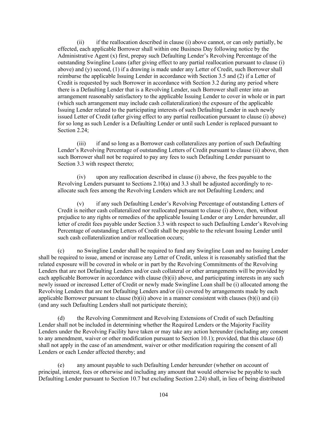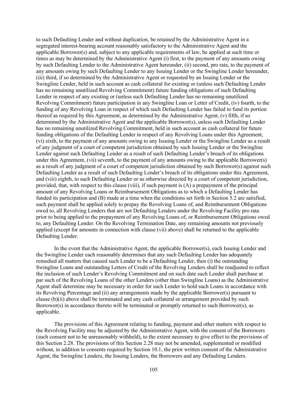 105 to such Defaulting Lender and without duplication, be retained by the Administrative Agent in a segregated interest-bearing account reasonably satisfactory to the Administrative Agent and the applicable Borrower(s) and, subject to any applicable requirements of law, be applied at such time or times as may be determined by the Administrative Agent (i) first, to the payment of any amounts owing by such Defaulting Lender to the Administrative Agent hereunder, (ii) second, pro rata, to the payment of any amounts owing by such Defaulting Lender to any Issuing Lender or the Swingline Lender hereunder, (iii) third, if so determined by the Administrative Agent or requested by an Issuing Lender or the Swingline Lender, held in such account as cash collateral for existing or (unless such Defaulting Lender has no remaining unutilized Revolving Commitment) future funding obligations of such Defaulting Lender in respect of any existing or (unless such Defaulting Lender has no remaining unutilized Revolving Commitment) future participation in any Swingline Loan or Letter of Credit, (iv) fourth, to the funding of any Revolving Loan in respect of which such Defaulting Lender has failed to fund its portion thereof as required by this Agreement, as determined by the Administrative Agent, (v) fifth, if so determined by the Administrative Agent and the applicable Borrower(s), unless such Defaulting Lender has no remaining unutilized Revolving Commitment, held in such account as cash collateral for future funding obligations of the Defaulting Lender in respect of any Revolving Loans under this Agreement, (vi) sixth, to the payment of any amounts owing to any Issuing Lender or the Swingline Lender as a result of any judgment of a court of competent jurisdiction obtained by such Issuing Lender or the Swingline Lender against such Defaulting Lender as a result of such Defaulting Lender’s breach of its obligations under this Agreement, (vii) seventh, to the payment of any amounts owing to the applicable Borrower(s) as a result of any judgment of a court of competent jurisdiction obtained by such Borrower(s) against such Defaulting Lender as a result of such Defaulting Lender’s breach of its obligations under this Agreement, and (viii) eighth, to such Defaulting Lender or as otherwise directed by a court of competent jurisdiction, provided, that, with respect to this clause (viii), if such payment is (A) a prepayment of the principal amount of any Revolving Loans or Reimbursement Obligations as to which a Defaulting Lender has funded its participation and (B) made at a time when the conditions set forth in Section 5.2 are satisfied, such payment shall be applied solely to prepay the Revolving Loans of, and Reimbursement Obligations owed to, all Revolving Lenders that are not Defaulting Lenders under the Revolving Facility pro rata prior to being applied to the prepayment of any Revolving Loans of, or Reimbursement Obligations owed to, any Defaulting Lender. On the Revolving Termination Date, any remaining amounts not previously applied (except for amounts in connection with clause (vii) above) shall be returned to the applicable Defaulting Lender. In the event that the Administrative Agent, the applicable Borrower(s), each Issuing Lender and the Swingline Lender each reasonably determines that any such Defaulting Lender has adequately remedied all matters that caused such Lender to be a Defaulting Lender, then (i) the outstanding Swingline Loans and outstanding Letters of Credit of the Revolving Lenders shall be readjusted to reflect the inclusion of such Lender’s Revolving Commitment and on such date such Lender shall purchase at par such of the Revolving Loans of the other Lenders (other than Swingline Loans) as the Administrative Agent shall determine may be necessary in order for such Lender to hold such Loans in accordance with its Revolving Percentage and (ii) any arrangements made by the applicable Borrower(s) pursuant to clause (b)(ii) above shall be terminated and any cash collateral or arrangement provided by such Borrower(s) in accordance thereto will be terminated or promptly returned to such Borrower(s), as applicable. The provisions of this Agreement relating to funding, payment and other matters with respect to the Revolving Facility may be adjusted by the Administrative Agent, with the consent of the Borrowers (such consent not to be unreasonably withheld), to the extent necessary to give effect to the provisions of this Section 2.28. The provisions of this Section 2.28 may not be amended, supplemented or modified without, in addition to consents required by Section 10.1, the prior written consent of the Administrative Agent, the Swingline Lenders, the Issuing Lenders, the Borrowers and any Defaulting Lenders.