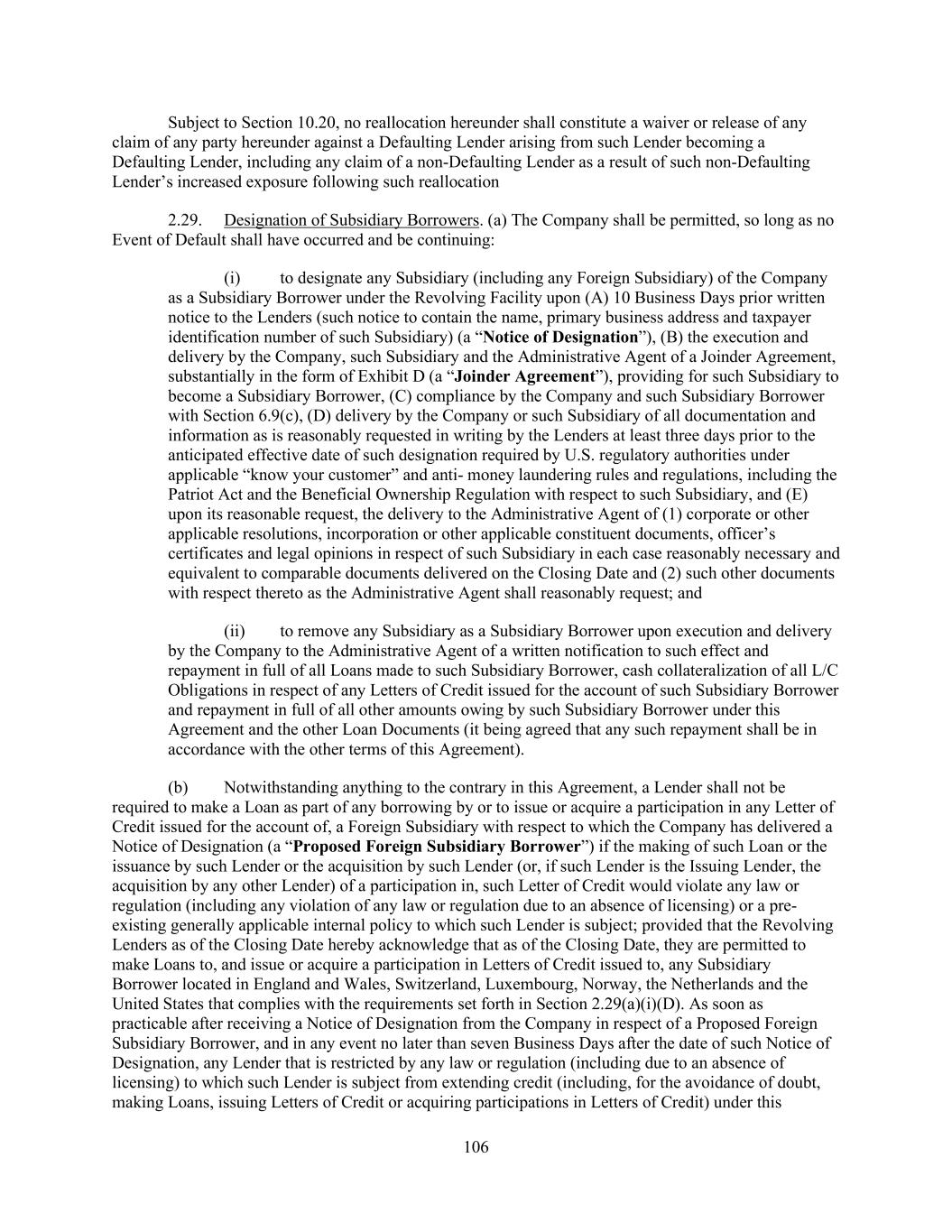 106 Subject to Section 10.20, no reallocation hereunder shall constitute a waiver or release of any claim of any party hereunder against a Defaulting Lender arising from such Lender becoming a Defaulting Lender, including any claim of a non-Defaulting Lender as a result of such non-Defaulting Lender’s increased exposure following such reallocation 2.29. Designation of Subsidiary Borrowers. (a) The Company shall be permitted, so long as no Event of Default shall have occurred and be continuing: (i) to designate any Subsidiary (including any Foreign Subsidiary) of the Company as a Subsidiary Borrower under the Revolving Facility upon (A) 10 Business Days prior written notice to the Lenders (such notice to contain the name, primary business address and taxpayer identification number of such Subsidiary) (a “Notice of Designation”), (B) the execution and delivery by the Company, such Subsidiary and the Administrative Agent of a Joinder Agreement, substantially in the form of Exhibit D (a “Joinder Agreement”), providing for such Subsidiary to become a Subsidiary Borrower, (C) compliance by the Company and such Subsidiary Borrower with Section 6.9(c), (D) delivery by the Company or such Subsidiary of all documentation and information as is reasonably requested in writing by the Lenders at least three days prior to the anticipated effective date of such designation required by U.S. regulatory authorities under applicable “know your customer” and anti- money laundering rules and regulations, including the Patriot Act and the Beneficial Ownership Regulation with respect to such Subsidiary, and (E) upon its reasonable request, the delivery to the Administrative Agent of (1) corporate or other applicable resolutions, incorporation or other applicable constituent documents, officer’s certificates and legal opinions in respect of such Subsidiary in each case reasonably necessary and equivalent to comparable documents delivered on the Closing Date and (2) such other documents with respect thereto as the Administrative Agent shall reasonably request; and (ii) to remove any Subsidiary as a Subsidiary Borrower upon execution and delivery by the Company to the Administrative Agent of a written notification to such effect and repayment in full of all Loans made to such Subsidiary Borrower, cash collateralization of all L/C Obligations in respect of any Letters of Credit issued for the account of such Subsidiary Borrower and repayment in full of all other amounts owing by such Subsidiary Borrower under this Agreement and the other Loan Documents (it being agreed that any such repayment shall be in accordance with the other terms of this Agreement). (b) Notwithstanding anything to the contrary in this Agreement, a Lender shall not be required to make a Loan as part of any borrowing by or to issue or acquire a participation in any Letter of Credit issued for the account of, a Foreign Subsidiary with respect to which the Company has delivered a Notice of Designation (a “Proposed Foreign Subsidiary Borrower”) if the making of such Loan or the issuance by such Lender or the acquisition by such Lender (or, if such Lender is the Issuing Lender, the acquisition by any other Lender) of a participation in, such Letter of Credit would violate any law or regulation (including any violation of any law or regulation due to an absence of licensing) or a pre- existing generally applicable internal policy to which such Lender is subject; provided that the Revolving Lenders as of the Closing Date hereby acknowledge that as of the Closing Date, they are permitted to make Loans to, and issue or acquire a participation in Letters of Credit issued to, any Subsidiary Borrower located in England and Wales, Switzerland, Luxembourg, Norway, the Netherlands and the United States that complies with the requirements set forth in Section 2.29(a)(i)(D). As soon as practicable after receiving a Notice of Designation from the Company in respect of a Proposed Foreign Subsidiary Borrower, and in any event no later than seven Business Days after the date of such Notice of Designation, any Lender that is restricted by any law or regulation (including due to an absence of licensing) to which such Lender is subject from extending credit (including, for the avoidance of doubt, making Loans, issuing Letters of Credit or acquiring participations in Letters of Credit) under this