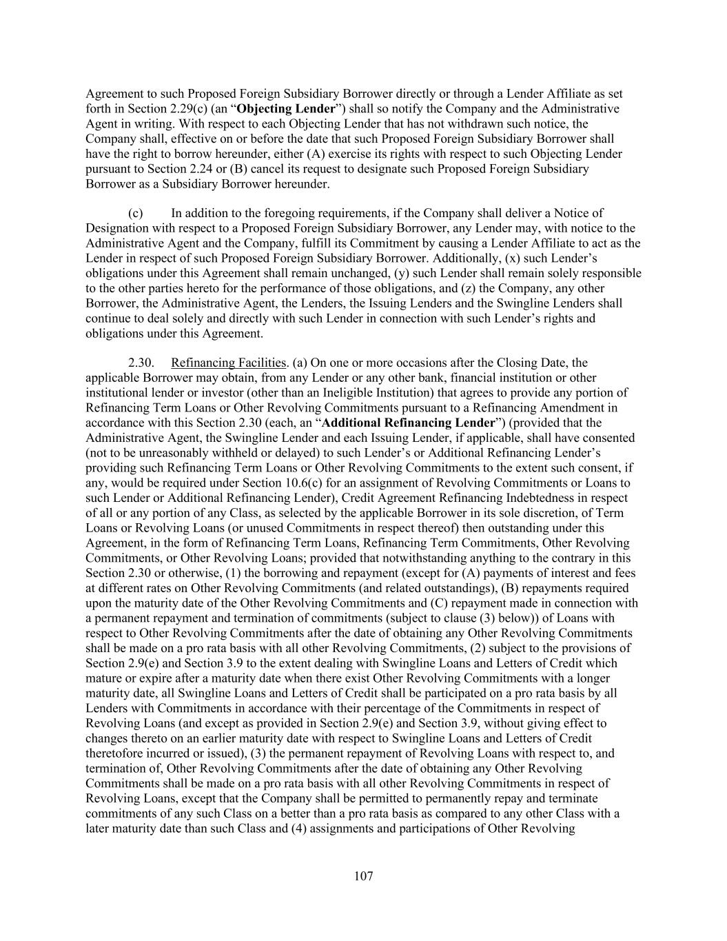107 Agreement to such Proposed Foreign Subsidiary Borrower directly or through a Lender Affiliate as set forth in Section 2.29(c) (an “Objecting Lender”) shall so notify the Company and the Administrative Agent in writing. With respect to each Objecting Lender that has not withdrawn such notice, the Company shall, effective on or before the date that such Proposed Foreign Subsidiary Borrower shall have the right to borrow hereunder, either (A) exercise its rights with respect to such Objecting Lender pursuant to Section 2.24 or (B) cancel its request to designate such Proposed Foreign Subsidiary Borrower as a Subsidiary Borrower hereunder. (c) In addition to the foregoing requirements, if the Company shall deliver a Notice of Designation with respect to a Proposed Foreign Subsidiary Borrower, any Lender may, with notice to the Administrative Agent and the Company, fulfill its Commitment by causing a Lender Affiliate to act as the Lender in respect of such Proposed Foreign Subsidiary Borrower. Additionally, (x) such Lender’s obligations under this Agreement shall remain unchanged, (y) such Lender shall remain solely responsible to the other parties hereto for the performance of those obligations, and (z) the Company, any other Borrower, the Administrative Agent, the Lenders, the Issuing Lenders and the Swingline Lenders shall continue to deal solely and directly with such Lender in connection with such Lender’s rights and obligations under this Agreement. 2.30. Refinancing Facilities. (a) On one or more occasions after the Closing Date, the applicable Borrower may obtain, from any Lender or any other bank, financial institution or other institutional lender or investor (other than an Ineligible Institution) that agrees to provide any portion of Refinancing Term Loans or Other Revolving Commitments pursuant to a Refinancing Amendment in accordance with this Section 2.30 (each, an “Additional Refinancing Lender”) (provided that the Administrative Agent, the Swingline Lender and each Issuing Lender, if applicable, shall have consented (not to be unreasonably withheld or delayed) to such Lender’s or Additional Refinancing Lender’s providing such Refinancing Term Loans or Other Revolving Commitments to the extent such consent, if any, would be required under Section 10.6(c) for an assignment of Revolving Commitments or Loans to such Lender or Additional Refinancing Lender), Credit Agreement Refinancing Indebtedness in respect of all or any portion of any Class, as selected by the applicable Borrower in its sole discretion, of Term Loans or Revolving Loans (or unused Commitments in respect thereof) then outstanding under this Agreement, in the form of Refinancing Term Loans, Refinancing Term Commitments, Other Revolving Commitments, or Other Revolving Loans; provided that notwithstanding anything to the contrary in this Section 2.30 or otherwise, (1) the borrowing and repayment (except for (A) payments of interest and fees at different rates on Other Revolving Commitments (and related outstandings), (B) repayments required upon the maturity date of the Other Revolving Commitments and (C) repayment made in connection with a permanent repayment and termination of commitments (subject to clause (3) below)) of Loans with respect to Other Revolving Commitments after the date of obtaining any Other Revolving Commitments shall be made on a pro rata basis with all other Revolving Commitments, (2) subject to the provisions of Section 2.9(e) and Section 3.9 to the extent dealing with Swingline Loans and Letters of Credit which mature or expire after a maturity date when there exist Other Revolving Commitments with a longer maturity date, all Swingline Loans and Letters of Credit shall be participated on a pro rata basis by all Lenders with Commitments in accordance with their percentage of the Commitments in respect of Revolving Loans (and except as provided in Section 2.9(e) and Section 3.9, without giving effect to changes thereto on an earlier maturity date with respect to Swingline Loans and Letters of Credit theretofore incurred or issued), (3) the permanent repayment of Revolving Loans with respect to, and termination of, Other Revolving Commitments after the date of obtaining any Other Revolving Commitments shall be made on a pro rata basis with all other Revolving Commitments in respect of Revolving Loans, except that the Company shall be permitted to permanently repay and terminate commitments of any such Class on a better than a pro rata basis as compared to any other Class with a later maturity date than such Class and (4) assignments and participations of Other Revolving
