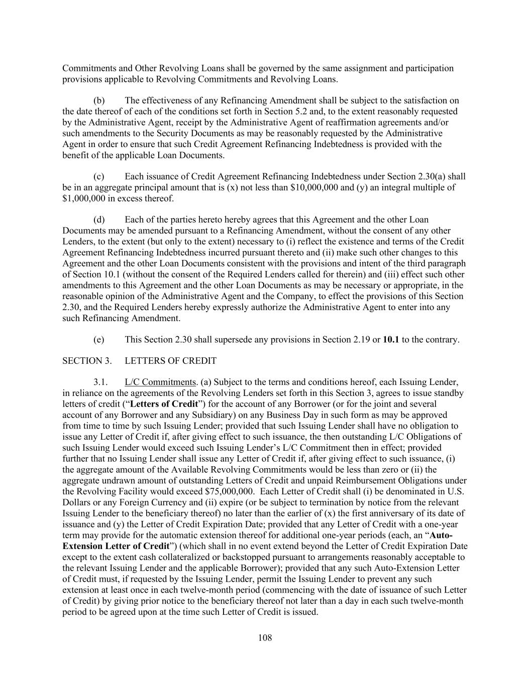 108 Commitments and Other Revolving Loans shall be governed by the same assignment and participation provisions applicable to Revolving Commitments and Revolving Loans. (b) The effectiveness of any Refinancing Amendment shall be subject to the satisfaction on the date thereof of each of the conditions set forth in Section 5.2 and, to the extent reasonably requested by the Administrative Agent, receipt by the Administrative Agent of reaffirmation agreements and/or such amendments to the Security Documents as may be reasonably requested by the Administrative Agent in order to ensure that such Credit Agreement Refinancing Indebtedness is provided with the benefit of the applicable Loan Documents. (c) Each issuance of Credit Agreement Refinancing Indebtedness under Section 2.30(a) shall be in an aggregate principal amount that is (x) not less than $10,000,000 and (y) an integral multiple of $1,000,000 in excess thereof. (d) Each of the parties hereto hereby agrees that this Agreement and the other Loan Documents may be amended pursuant to a Refinancing Amendment, without the consent of any other Lenders, to the extent (but only to the extent) necessary to (i) reflect the existence and terms of the Credit Agreement Refinancing Indebtedness incurred pursuant thereto and (ii) make such other changes to this Agreement and the other Loan Documents consistent with the provisions and intent of the third paragraph of Section 10.1 (without the consent of the Required Lenders called for therein) and (iii) effect such other amendments to this Agreement and the other Loan Documents as may be necessary or appropriate, in the reasonable opinion of the Administrative Agent and the Company, to effect the provisions of this Section 2.30, and the Required Lenders hereby expressly authorize the Administrative Agent to enter into any such Refinancing Amendment. (e) This Section 2.30 shall supersede any provisions in Section 2.19 or 10.1 to the contrary. SECTION 3. LETTERS OF CREDIT 3.1. L/C Commitments. (a) Subject to the terms and conditions hereof, each Issuing Lender, in reliance on the agreements of the Revolving Lenders set forth in this Section 3, agrees to issue standby letters of credit (“Letters of Credit”) for the account of any Borrower (or for the joint and several account of any Borrower and any Subsidiary) on any Business Day in such form as may be approved from time to time by such Issuing Lender; provided that such Issuing Lender shall have no obligation to issue any Letter of Credit if, after giving effect to such issuance, the then outstanding L/C Obligations of such Issuing Lender would exceed such Issuing Lender’s L/C Commitment then in effect; provided further that no Issuing Lender shall issue any Letter of Credit if, after giving effect to such issuance, (i) the aggregate amount of the Available Revolving Commitments would be less than zero or (ii) the aggregate undrawn amount of outstanding Letters of Credit and unpaid Reimbursement Obligations under the Revolving Facility would exceed $75,000,000. Each Letter of Credit shall (i) be denominated in U.S. Dollars or any Foreign Currency and (ii) expire (or be subject to termination by notice from the relevant Issuing Lender to the beneficiary thereof) no later than the earlier of (x) the first anniversary of its date of issuance and (y) the Letter of Credit Expiration Date; provided that any Letter of Credit with a one-year term may provide for the automatic extension thereof for additional one-year periods (each, an “Auto- Extension Letter of Credit”) (which shall in no event extend beyond the Letter of Credit Expiration Date except to the extent cash collateralized or backstopped pursuant to arrangements reasonably acceptable to the relevant Issuing Lender and the applicable Borrower); provided that any such Auto-Extension Letter of Credit must, if requested by the Issuing Lender, permit the Issuing Lender to prevent any such extension at least once in each twelve-month period (commencing with the date of issuance of such Letter of Credit) by giving prior notice to the beneficiary thereof not later than a day in each such twelve-month period to be agreed upon at the time such Letter of Credit is issued.