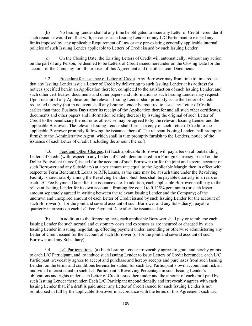 109 (b) No Issuing Lender shall at any time be obligated to issue any Letter of Credit hereunder if such issuance would conflict with, or cause such Issuing Lender or any L/C Participant to exceed any limits imposed by, any applicable Requirement of Law or any pre-existing generally applicable internal policies of such Issuing Lender applicable to Letters of Credit issued by such Issuing Lender. (c) On the Closing Date, the Existing Letters of Credit will automatically, without any action on the part of any Person, be deemed to be Letters of Credit issued hereunder on the Closing Date for the account of the Company for all purposes of this Agreement and the other Loan Documents. 3.2. Procedure for Issuance of Letter of Credit. Any Borrower may from time to time request that any Issuing Lender issue a Letter of Credit by delivering to such Issuing Lender at its address for notices specified herein an Application therefor, completed to the satisfaction of such Issuing Lender, and such other certificates, documents and other papers and information as such Issuing Lender may request. Upon receipt of any Application, the relevant Issuing Lender shall promptly issue the Letter of Credit requested thereby (but in no event shall any Issuing Lender be required to issue any Letter of Credit earlier than three Business Days after its receipt of the Application therefor and all such other certificates, documents and other papers and information relating thereto) by issuing the original of such Letter of Credit to the beneficiary thereof or as otherwise may be agreed to by the relevant Issuing Lender and the applicable Borrower. The relevant Issuing Lender shall furnish a copy of such Letter of Credit to the applicable Borrower promptly following the issuance thereof. The relevant Issuing Lender shall promptly furnish to the Administrative Agent, which shall in turn promptly furnish to the Lenders, notice of the issuance of each Letter of Credit (including the amount thereof). 3.3. Fees and Other Charges. (a) Each applicable Borrower will pay a fee on all outstanding Letters of Credit (with respect to any Letters of Credit denominated in a Foreign Currency, based on the Dollar Equivalent thereof) issued for the account of such Borrower (or for the joint and several account of such Borrower and any Subsidiary) at a per annum rate equal to the Applicable Margin then in effect with respect to Term Benchmark Loans or RFR Loans, as the case may be, at such time under the Revolving Facility, shared ratably among the Revolving Lenders. Such fees shall be payable quarterly in arrears on each L/C Fee Payment Date after the issuance date. In addition, each applicable Borrower shall pay to the relevant Issuing Lender for its own account a fronting fee equal to 0.125% per annum (or such lesser amount separately agreed in writing between the relevant Issuing Lender and the Company) of the undrawn and unexpired amount of each Letter of Credit issued by such Issuing Lender for the account of such Borrower (or for the joint and several account of such Borrower and any Subsidiary), payable quarterly in arrears on each L/C Fee Payment Date after the issuance date. (b) In addition to the foregoing fees, each applicable Borrower shall pay or reimburse each Issuing Lender for such normal and customary costs and expenses as are incurred or charged by such Issuing Lender in issuing, negotiating, effecting payment under, amending or otherwise administering any Letter of Credit issued for the account of such Borrower (or for the joint and several account of such Borrower and any Subsidiary). 3.4. L/C Participations. (a) Each Issuing Lender irrevocably agrees to grant and hereby grants to each L/C Participant, and, to induce such Issuing Lender to issue Letters of Credit hereunder, each L/C Participant irrevocably agrees to accept and purchase and hereby accepts and purchases from such Issuing Lender, on the terms and conditions hereinafter stated, for such L/C Participant’s own account and risk an undivided interest equal to such L/C Participant’s Revolving Percentage in such Issuing Lender’s obligations and rights under each Letter of Credit issued hereunder and the amount of each draft paid by such Issuing Lender thereunder. Each L/C Participant unconditionally and irrevocably agrees with each Issuing Lender that, if a draft is paid under any Letter of Credit issued for such Issuing Lender is not reimbursed in full by the applicable Borrower in accordance with the terms of this Agreement such L/C