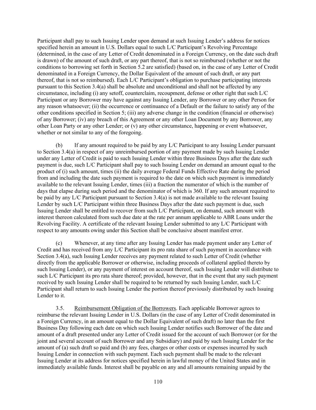 110 Participant shall pay to such Issuing Lender upon demand at such Issuing Lender’s address for notices specified herein an amount in U.S. Dollars equal to such L/C Participant’s Revolving Percentage (determined, in the case of any Letter of Credit denominated in a Foreign Currency, on the date such draft is drawn) of the amount of such draft, or any part thereof, that is not so reimbursed (whether or not the conditions to borrowing set forth in Section 5.2 are satisfied) (based on, in the case of any Letter of Credit denominated in a Foreign Currency, the Dollar Equivalent of the amount of such draft, or any part thereof, that is not so reimbursed). Each L/C Participant’s obligation to purchase participating interests pursuant to this Section 3.4(a) shall be absolute and unconditional and shall not be affected by any circumstance, including (i) any setoff, counterclaim, recoupment, defense or other right that such L/C Participant or any Borrower may have against any Issuing Lender, any Borrower or any other Person for any reason whatsoever; (ii) the occurrence or continuance of a Default or the failure to satisfy any of the other conditions specified in Section 5; (iii) any adverse change in the condition (financial or otherwise) of any Borrower; (iv) any breach of this Agreement or any other Loan Document by any Borrower, any other Loan Party or any other Lender; or (v) any other circumstance, happening or event whatsoever, whether or not similar to any of the foregoing. (b) If any amount required to be paid by any L/C Participant to any Issuing Lender pursuant to Section 3.4(a) in respect of any unreimbursed portion of any payment made by such Issuing Lender under any Letter of Credit is paid to such Issuing Lender within three Business Days after the date such payment is due, such L/C Participant shall pay to such Issuing Lender on demand an amount equal to the product of (i) such amount, times (ii) the daily average Federal Funds Effective Rate during the period from and including the date such payment is required to the date on which such payment is immediately available to the relevant Issuing Lender, times (iii) a fraction the numerator of which is the number of days that elapse during such period and the denominator of which is 360. If any such amount required to be paid by any L/C Participant pursuant to Section 3.4(a) is not made available to the relevant Issuing Lender by such L/C Participant within three Business Days after the date such payment is due, such Issuing Lender shall be entitled to recover from such L/C Participant, on demand, such amount with interest thereon calculated from such due date at the rate per annum applicable to ABR Loans under the Revolving Facility. A certificate of the relevant Issuing Lender submitted to any L/C Participant with respect to any amounts owing under this Section shall be conclusive absent manifest error. (c) Whenever, at any time after any Issuing Lender has made payment under any Letter of Credit and has received from any L/C Participant its pro rata share of such payment in accordance with Section 3.4(a), such Issuing Lender receives any payment related to such Letter of Credit (whether directly from the applicable Borrower or otherwise, including proceeds of collateral applied thereto by such Issuing Lender), or any payment of interest on account thereof, such Issuing Lender will distribute to such L/C Participant its pro rata share thereof; provided, however, that in the event that any such payment received by such Issuing Lender shall be required to be returned by such Issuing Lender, such L/C Participant shall return to such Issuing Lender the portion thereof previously distributed by such Issuing Lender to it. 3.5. Reimbursement Obligation of the Borrowers. Each applicable Borrower agrees to reimburse the relevant Issuing Lender in U.S. Dollars (in the case of any Letter of Credit denominated in a Foreign Currency, in an amount equal to the Dollar Equivalent of such draft) no later than the first Business Day following each date on which such Issuing Lender notifies such Borrower of the date and amount of a draft presented under any Letter of Credit issued for the account of such Borrower (or for the joint and several account of such Borrower and any Subsidiary) and paid by such Issuing Lender for the amount of (a) such draft so paid and (b) any fees, charges or other costs or expenses incurred by such Issuing Lender in connection with such payment. Each such payment shall be made to the relevant Issuing Lender at its address for notices specified herein in lawful money of the United States and in immediately available funds. Interest shall be payable on any and all amounts remaining unpaid by the