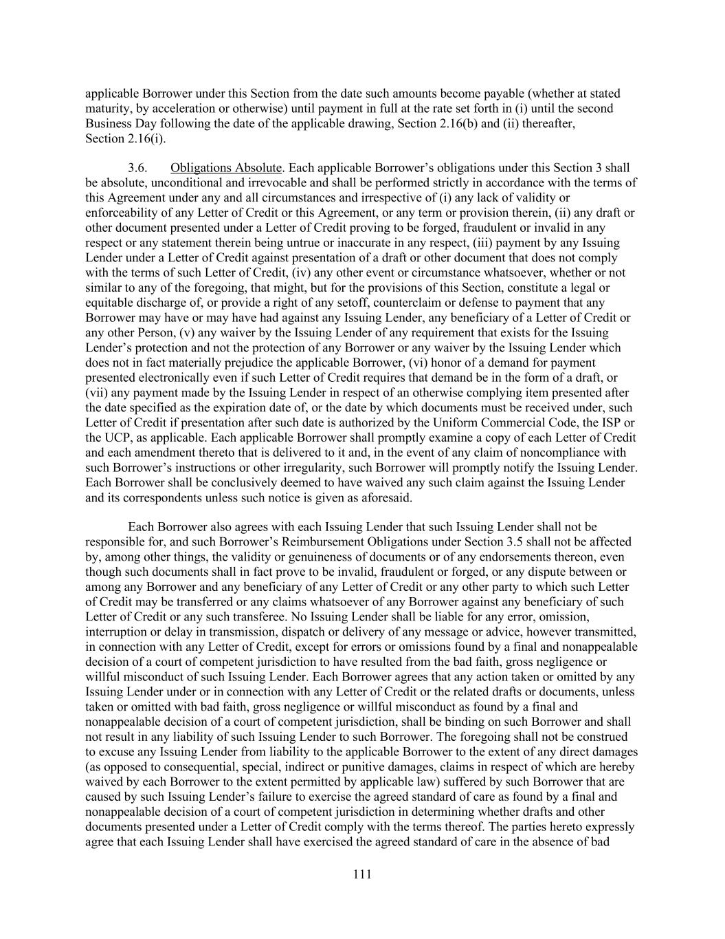 111 applicable Borrower under this Section from the date such amounts become payable (whether at stated maturity, by acceleration or otherwise) until payment in full at the rate set forth in (i) until the second Business Day following the date of the applicable drawing, Section 2.16(b) and (ii) thereafter, Section 2.16(i). 3.6. Obligations Absolute. Each applicable Borrower’s obligations under this Section 3 shall be absolute, unconditional and irrevocable and shall be performed strictly in accordance with the terms of this Agreement under any and all circumstances and irrespective of (i) any lack of validity or enforceability of any Letter of Credit or this Agreement, or any term or provision therein, (ii) any draft or other document presented under a Letter of Credit proving to be forged, fraudulent or invalid in any respect or any statement therein being untrue or inaccurate in any respect, (iii) payment by any Issuing Lender under a Letter of Credit against presentation of a draft or other document that does not comply with the terms of such Letter of Credit, (iv) any other event or circumstance whatsoever, whether or not similar to any of the foregoing, that might, but for the provisions of this Section, constitute a legal or equitable discharge of, or provide a right of any setoff, counterclaim or defense to payment that any Borrower may have or may have had against any Issuing Lender, any beneficiary of a Letter of Credit or any other Person, (v) any waiver by the Issuing Lender of any requirement that exists for the Issuing Lender’s protection and not the protection of any Borrower or any waiver by the Issuing Lender which does not in fact materially prejudice the applicable Borrower, (vi) honor of a demand for payment presented electronically even if such Letter of Credit requires that demand be in the form of a draft, or (vii) any payment made by the Issuing Lender in respect of an otherwise complying item presented after the date specified as the expiration date of, or the date by which documents must be received under, such Letter of Credit if presentation after such date is authorized by the Uniform Commercial Code, the ISP or the UCP, as applicable. Each applicable Borrower shall promptly examine a copy of each Letter of Credit and each amendment thereto that is delivered to it and, in the event of any claim of noncompliance with such Borrower’s instructions or other irregularity, such Borrower will promptly notify the Issuing Lender. Each Borrower shall be conclusively deemed to have waived any such claim against the Issuing Lender and its correspondents unless such notice is given as aforesaid. Each Borrower also agrees with each Issuing Lender that such Issuing Lender shall not be responsible for, and such Borrower’s Reimbursement Obligations under Section 3.5 shall not be affected by, among other things, the validity or genuineness of documents or of any endorsements thereon, even though such documents shall in fact prove to be invalid, fraudulent or forged, or any dispute between or among any Borrower and any beneficiary of any Letter of Credit or any other party to which such Letter of Credit may be transferred or any claims whatsoever of any Borrower against any beneficiary of such Letter of Credit or any such transferee. No Issuing Lender shall be liable for any error, omission, interruption or delay in transmission, dispatch or delivery of any message or advice, however transmitted, in connection with any Letter of Credit, except for errors or omissions found by a final and nonappealable decision of a court of competent jurisdiction to have resulted from the bad faith, gross negligence or willful misconduct of such Issuing Lender. Each Borrower agrees that any action taken or omitted by any Issuing Lender under or in connection with any Letter of Credit or the related drafts or documents, unless taken or omitted with bad faith, gross negligence or willful misconduct as found by a final and nonappealable decision of a court of competent jurisdiction, shall be binding on such Borrower and shall not result in any liability of such Issuing Lender to such Borrower. The foregoing shall not be construed to excuse any Issuing Lender from liability to the applicable Borrower to the extent of any direct damages (as opposed to consequential, special, indirect or punitive damages, claims in respect of which are hereby waived by each Borrower to the extent permitted by applicable law) suffered by such Borrower that are caused by such Issuing Lender’s failure to exercise the agreed standard of care as found by a final and nonappealable decision of a court of competent jurisdiction in determining whether drafts and other documents presented under a Letter of Credit comply with the terms thereof. The parties hereto expressly agree that each Issuing Lender shall have exercised the agreed standard of care in the absence of bad