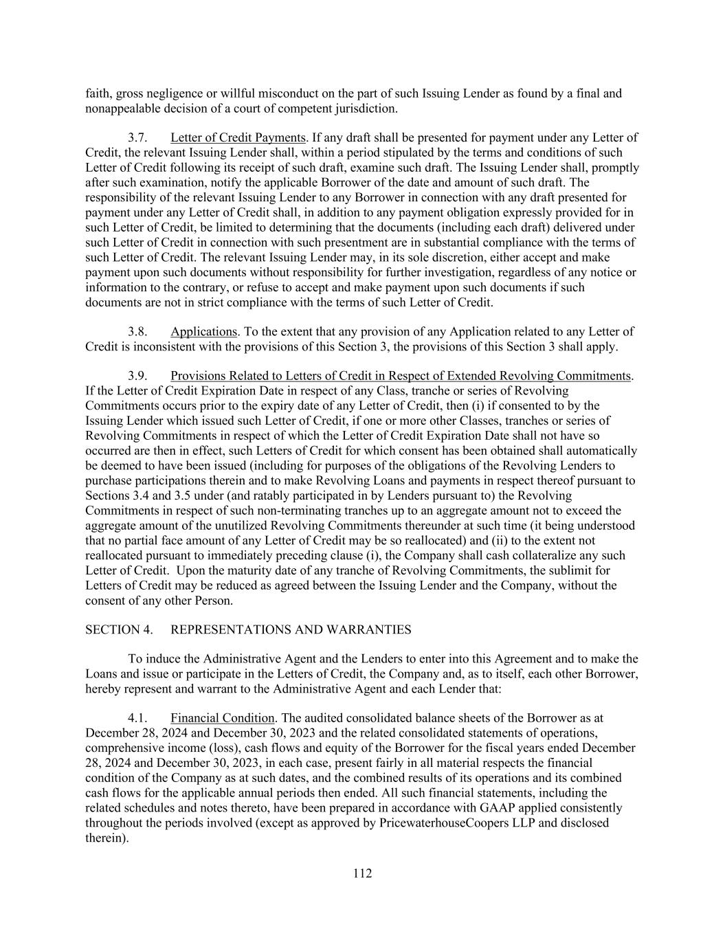 112 faith, gross negligence or willful misconduct on the part of such Issuing Lender as found by a final and nonappealable decision of a court of competent jurisdiction. 3.7. Letter of Credit Payments. If any draft shall be presented for payment under any Letter of Credit, the relevant Issuing Lender shall, within a period stipulated by the terms and conditions of such Letter of Credit following its receipt of such draft, examine such draft. The Issuing Lender shall, promptly after such examination, notify the applicable Borrower of the date and amount of such draft. The responsibility of the relevant Issuing Lender to any Borrower in connection with any draft presented for payment under any Letter of Credit shall, in addition to any payment obligation expressly provided for in such Letter of Credit, be limited to determining that the documents (including each draft) delivered under such Letter of Credit in connection with such presentment are in substantial compliance with the terms of such Letter of Credit. The relevant Issuing Lender may, in its sole discretion, either accept and make payment upon such documents without responsibility for further investigation, regardless of any notice or information to the contrary, or refuse to accept and make payment upon such documents if such documents are not in strict compliance with the terms of such Letter of Credit. 3.8. Applications. To the extent that any provision of any Application related to any Letter of Credit is inconsistent with the provisions of this Section 3, the provisions of this Section 3 shall apply. 3.9. Provisions Related to Letters of Credit in Respect of Extended Revolving Commitments. If the Letter of Credit Expiration Date in respect of any Class, tranche or series of Revolving Commitments occurs prior to the expiry date of any Letter of Credit, then (i) if consented to by the Issuing Lender which issued such Letter of Credit, if one or more other Classes, tranches or series of Revolving Commitments in respect of which the Letter of Credit Expiration Date shall not have so occurred are then in effect, such Letters of Credit for which consent has been obtained shall automatically be deemed to have been issued (including for purposes of the obligations of the Revolving Lenders to purchase participations therein and to make Revolving Loans and payments in respect thereof pursuant to Sections 3.4 and 3.5 under (and ratably participated in by Lenders pursuant to) the Revolving Commitments in respect of such non-terminating tranches up to an aggregate amount not to exceed the aggregate amount of the unutilized Revolving Commitments thereunder at such time (it being understood that no partial face amount of any Letter of Credit may be so reallocated) and (ii) to the extent not reallocated pursuant to immediately preceding clause (i), the Company shall cash collateralize any such Letter of Credit. Upon the maturity date of any tranche of Revolving Commitments, the sublimit for Letters of Credit may be reduced as agreed between the Issuing Lender and the Company, without the consent of any other Person. SECTION 4. REPRESENTATIONS AND WARRANTIES To induce the Administrative Agent and the Lenders to enter into this Agreement and to make the Loans and issue or participate in the Letters of Credit, the Company and, as to itself, each other Borrower, hereby represent and warrant to the Administrative Agent and each Lender that: 4.1. Financial Condition. The audited consolidated balance sheets of the Borrower as at December 28, 2024 and December 30, 2023 and the related consolidated statements of operations, comprehensive income (loss), cash flows and equity of the Borrower for the fiscal years ended December 28, 2024 and December 30, 2023, in each case, present fairly in all material respects the financial condition of the Company as at such dates, and the combined results of its operations and its combined cash flows for the applicable annual periods then ended. All such financial statements, including the related schedules and notes thereto, have been prepared in accordance with GAAP applied consistently throughout the periods involved (except as approved by PricewaterhouseCoopers LLP and disclosed therein).