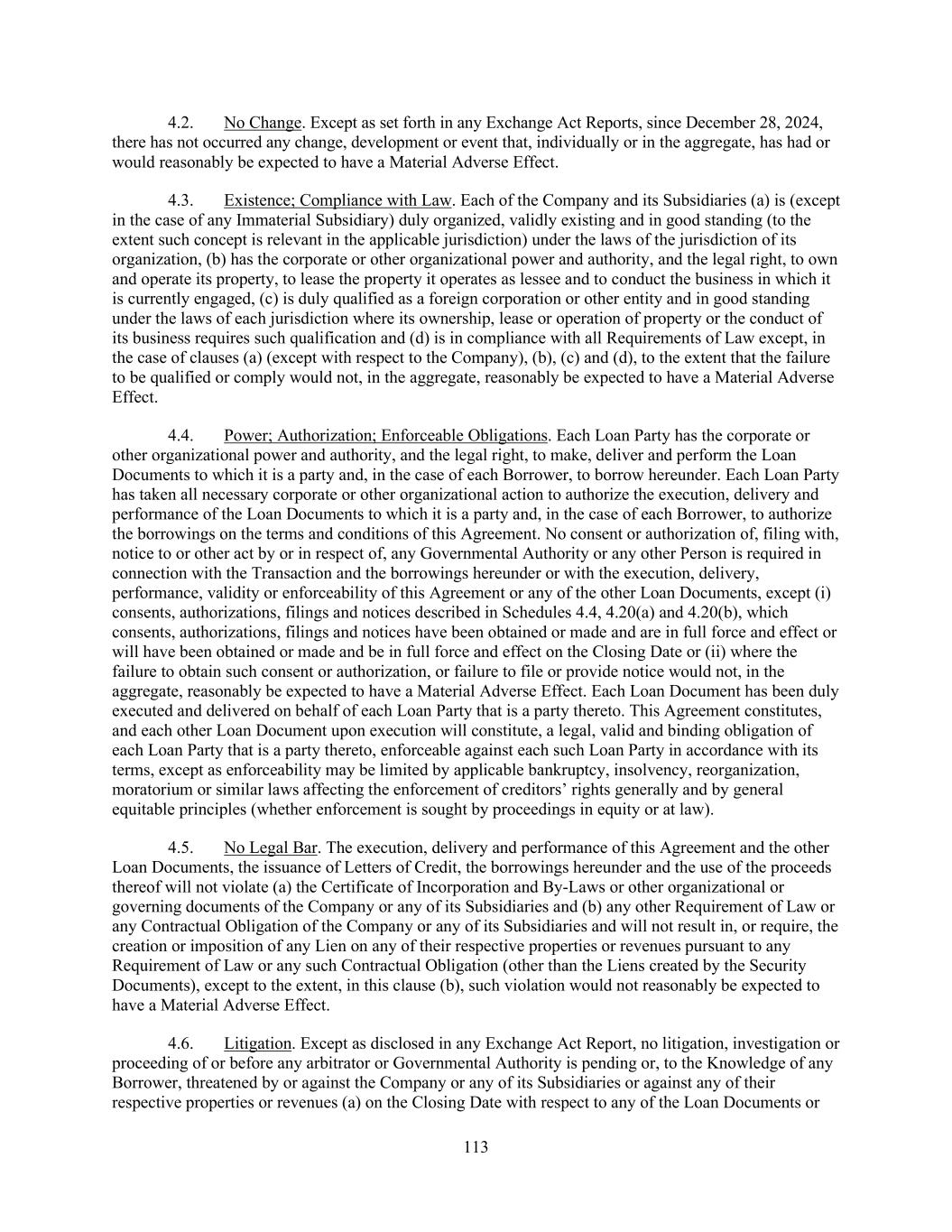 113 4.2. No Change. Except as set forth in any Exchange Act Reports, since December 28, 2024, there has not occurred any change, development or event that, individually or in the aggregate, has had or would reasonably be expected to have a Material Adverse Effect. 4.3. Existence; Compliance with Law. Each of the Company and its Subsidiaries (a) is (except in the case of any Immaterial Subsidiary) duly organized, validly existing and in good standing (to the extent such concept is relevant in the applicable jurisdiction) under the laws of the jurisdiction of its organization, (b) has the corporate or other organizational power and authority, and the legal right, to own and operate its property, to lease the property it operates as lessee and to conduct the business in which it is currently engaged, (c) is duly qualified as a foreign corporation or other entity and in good standing under the laws of each jurisdiction where its ownership, lease or operation of property or the conduct of its business requires such qualification and (d) is in compliance with all Requirements of Law except, in the case of clauses (a) (except with respect to the Company), (b), (c) and (d), to the extent that the failure to be qualified or comply would not, in the aggregate, reasonably be expected to have a Material Adverse Effect. 4.4. Power; Authorization; Enforceable Obligations. Each Loan Party has the corporate or other organizational power and authority, and the legal right, to make, deliver and perform the Loan Documents to which it is a party and, in the case of each Borrower, to borrow hereunder. Each Loan Party has taken all necessary corporate or other organizational action to authorize the execution, delivery and performance of the Loan Documents to which it is a party and, in the case of each Borrower, to authorize the borrowings on the terms and conditions of this Agreement. No consent or authorization of, filing with, notice to or other act by or in respect of, any Governmental Authority or any other Person is required in connection with the Transaction and the borrowings hereunder or with the execution, delivery, performance, validity or enforceability of this Agreement or any of the other Loan Documents, except (i) consents, authorizations, filings and notices described in Schedules 4.4, 4.20(a) and 4.20(b), which consents, authorizations, filings and notices have been obtained or made and are in full force and effect or will have been obtained or made and be in full force and effect on the Closing Date or (ii) where the failure to obtain such consent or authorization, or failure to file or provide notice would not, in the aggregate, reasonably be expected to have a Material Adverse Effect. Each Loan Document has been duly executed and delivered on behalf of each Loan Party that is a party thereto. This Agreement constitutes, and each other Loan Document upon execution will constitute, a legal, valid and binding obligation of each Loan Party that is a party thereto, enforceable against each such Loan Party in accordance with its terms, except as enforceability may be limited by applicable bankruptcy, insolvency, reorganization, moratorium or similar laws affecting the enforcement of creditors’ rights generally and by general equitable principles (whether enforcement is sought by proceedings in equity or at law). 4.5. No Legal Bar. The execution, delivery and performance of this Agreement and the other Loan Documents, the issuance of Letters of Credit, the borrowings hereunder and the use of the proceeds thereof will not violate (a) the Certificate of Incorporation and By-Laws or other organizational or governing documents of the Company or any of its Subsidiaries and (b) any other Requirement of Law or any Contractual Obligation of the Company or any of its Subsidiaries and will not result in, or require, the creation or imposition of any Lien on any of their respective properties or revenues pursuant to any Requirement of Law or any such Contractual Obligation (other than the Liens created by the Security Documents), except to the extent, in this clause (b), such violation would not reasonably be expected to have a Material Adverse Effect. 4.6. Litigation. Except as disclosed in any Exchange Act Report, no litigation, investigation or proceeding of or before any arbitrator or Governmental Authority is pending or, to the Knowledge of any Borrower, threatened by or against the Company or any of its Subsidiaries or against any of their respective properties or revenues (a) on the Closing Date with respect to any of the Loan Documents or