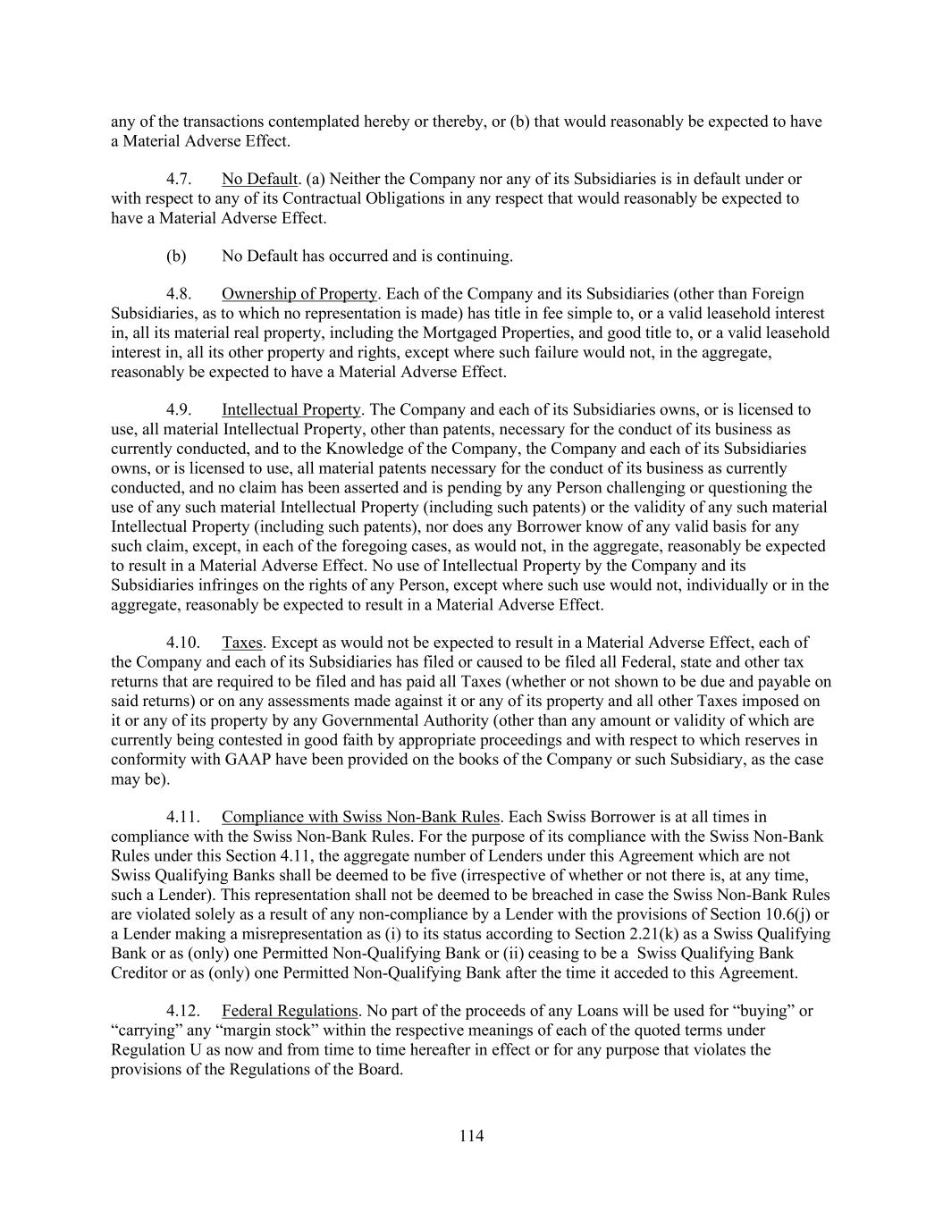 114 any of the transactions contemplated hereby or thereby, or (b) that would reasonably be expected to have a Material Adverse Effect. 4.7. No Default. (a) Neither the Company nor any of its Subsidiaries is in default under or with respect to any of its Contractual Obligations in any respect that would reasonably be expected to have a Material Adverse Effect. (b) No Default has occurred and is continuing. 4.8. Ownership of Property. Each of the Company and its Subsidiaries (other than Foreign Subsidiaries, as to which no representation is made) has title in fee simple to, or a valid leasehold interest in, all its material real property, including the Mortgaged Properties, and good title to, or a valid leasehold interest in, all its other property and rights, except where such failure would not, in the aggregate, reasonably be expected to have a Material Adverse Effect. 4.9. Intellectual Property. The Company and each of its Subsidiaries owns, or is licensed to use, all material Intellectual Property, other than patents, necessary for the conduct of its business as currently conducted, and to the Knowledge of the Company, the Company and each of its Subsidiaries owns, or is licensed to use, all material patents necessary for the conduct of its business as currently conducted, and no claim has been asserted and is pending by any Person challenging or questioning the use of any such material Intellectual Property (including such patents) or the validity of any such material Intellectual Property (including such patents), nor does any Borrower know of any valid basis for any such claim, except, in each of the foregoing cases, as would not, in the aggregate, reasonably be expected to result in a Material Adverse Effect. No use of Intellectual Property by the Company and its Subsidiaries infringes on the rights of any Person, except where such use would not, individually or in the aggregate, reasonably be expected to result in a Material Adverse Effect. 4.10. Taxes. Except as would not be expected to result in a Material Adverse Effect, each of the Company and each of its Subsidiaries has filed or caused to be filed all Federal, state and other tax returns that are required to be filed and has paid all Taxes (whether or not shown to be due and payable on said returns) or on any assessments made against it or any of its property and all other Taxes imposed on it or any of its property by any Governmental Authority (other than any amount or validity of which are currently being contested in good faith by appropriate proceedings and with respect to which reserves in conformity with GAAP have been provided on the books of the Company or such Subsidiary, as the case may be). 4.11. Compliance with Swiss Non-Bank Rules. Each Swiss Borrower is at all times in compliance with the Swiss Non-Bank Rules. For the purpose of its compliance with the Swiss Non-Bank Rules under this Section 4.11, the aggregate number of Lenders under this Agreement which are not Swiss Qualifying Banks shall be deemed to be five (irrespective of whether or not there is, at any time, such a Lender). This representation shall not be deemed to be breached in case the Swiss Non-Bank Rules are violated solely as a result of any non-compliance by a Lender with the provisions of Section 10.6(j) or a Lender making a misrepresentation as (i) to its status according to Section 2.21(k) as a Swiss Qualifying Bank or as (only) one Permitted Non-Qualifying Bank or (ii) ceasing to be a Swiss Qualifying Bank Creditor or as (only) one Permitted Non-Qualifying Bank after the time it acceded to this Agreement. 4.12. Federal Regulations. No part of the proceeds of any Loans will be used for “buying” or “carrying” any “margin stock” within the respective meanings of each of the quoted terms under Regulation U as now and from time to time hereafter in effect or for any purpose that violates the provisions of the Regulations of the Board.