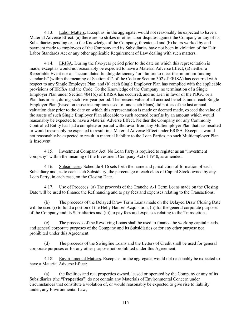 115 4.13. Labor Matters. Except as, in the aggregate, would not reasonably be expected to have a Material Adverse Effect: (a) there are no strikes or other labor disputes against the Company or any of its Subsidiaries pending or, to the Knowledge of the Company, threatened and (b) hours worked by and payment made to employees of the Company and its Subsidiaries have not been in violation of the Fair Labor Standards Act or any other applicable Requirement of Law dealing with such matters. 4.14. ERISA. During the five-year period prior to the date on which this representation is made, except as would not reasonably be expected to have a Material Adverse Effect, (a) neither a Reportable Event nor an “accumulated funding deficiency” or “failure to meet the minimum funding standards” (within the meaning of Section 412 of the Code or Section 302 of ERISA) has occurred with respect to any Single Employer Plan, and (b) each Single Employer Plan has complied with the applicable provisions of ERISA and the Code. To the Knowledge of the Company, no termination of a Single Employer Plan under Section 4041(c) of ERISA has occurred, and no Lien in favor of the PBGC or a Plan has arisen, during such five-year period. The present value of all accrued benefits under each Single Employer Plan (based on those assumptions used to fund such Plans) did not, as of the last annual valuation date prior to the date on which this representation is made or deemed made, exceed the value of the assets of such Single Employer Plan allocable to such accrued benefits by an amount which would reasonably be expected to have a Material Adverse Effect. Neither the Company nor any Commonly Controlled Entity has had a complete or partial withdrawal from any Multiemployer Plan that has resulted or would reasonably be expected to result in a Material Adverse Effect under ERISA. Except as would not reasonably be expected to result in material liability to the Loan Parties, no such Multiemployer Plan is Insolvent. 4.15. Investment Company Act. No Loan Party is required to register as an “investment company” within the meaning of the Investment Company Act of 1940, as amended. 4.16. Subsidiaries. Schedule 4.16 sets forth the name and jurisdiction of formation of each Subsidiary and, as to each such Subsidiary, the percentage of each class of Capital Stock owned by any Loan Party, in each case, on the Closing Date. 4.17. Use of Proceeds. (a) The proceeds of the Tranche A-1 Term Loans made on the Closing Date will be used to finance the Refinancing and to pay fees and expenses relating to the Transactions. (b) The proceeds of the Delayed Draw Term Loans made on the Delayed Draw Closing Date will be used (i) to fund a portion of the Helly Hansen Acquisition, (ii) for the general corporate purposes of the Company and its Subsidiaries and (iii) to pay fees and expenses relating to the Transactions. (c) The proceeds of the Revolving Loans shall be used to finance the working capital needs and general corporate purposes of the Company and its Subsidiaries or for any other purpose not prohibited under this Agreement. (d) The proceeds of the Swingline Loans and the Letters of Credit shall be used for general corporate purposes or for any other purpose not prohibited under this Agreement. 4.18. Environmental Matters. Except as, in the aggregate, would not reasonably be expected to have a Material Adverse Effect: (a) the facilities and real properties owned, leased or operated by the Company or any of its Subsidiaries (the “Properties”) do not contain any Materials of Environmental Concern under circumstances that constitute a violation of, or would reasonably be expected to give rise to liability under, any Environmental Law;