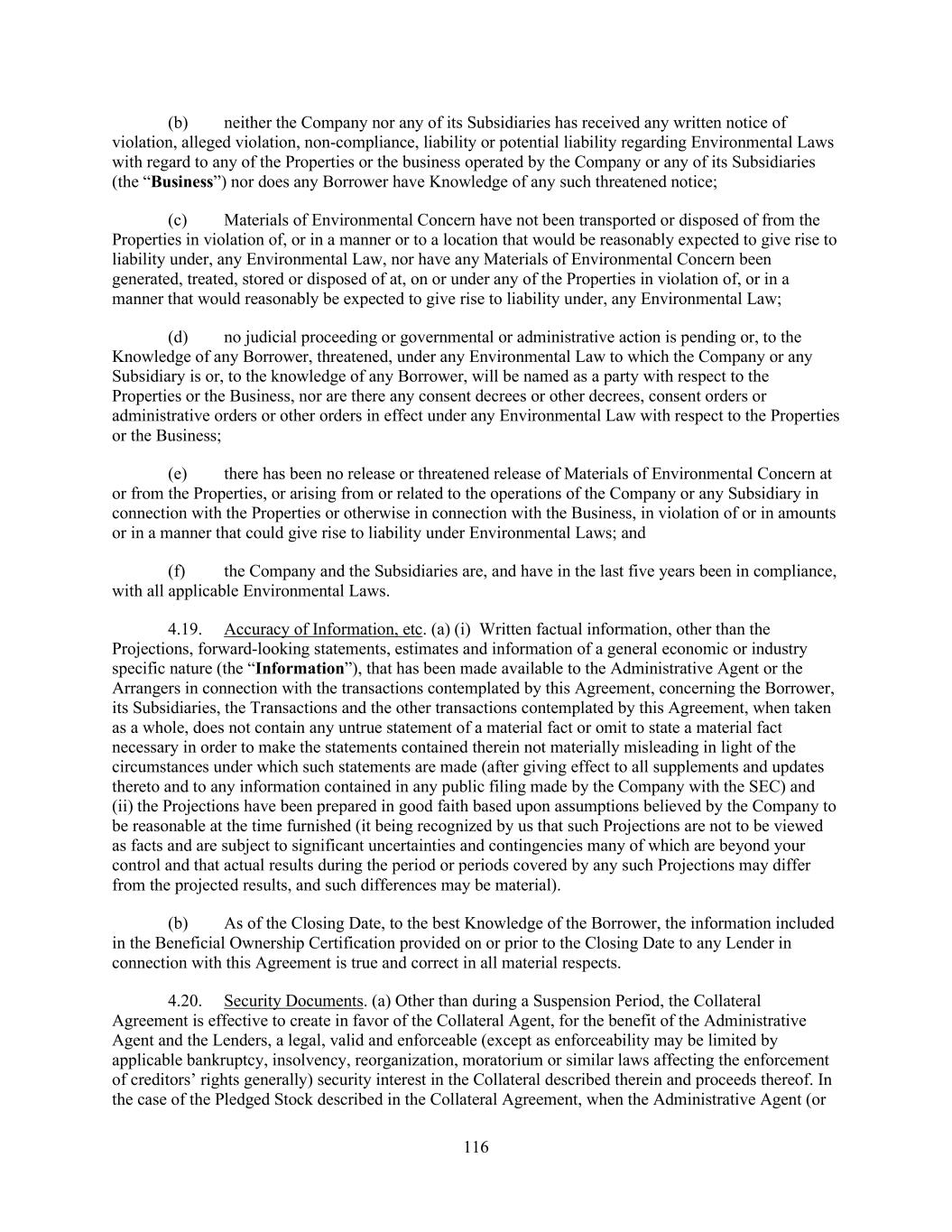 116 (b) neither the Company nor any of its Subsidiaries has received any written notice of violation, alleged violation, non-compliance, liability or potential liability regarding Environmental Laws with regard to any of the Properties or the business operated by the Company or any of its Subsidiaries (the “Business”) nor does any Borrower have Knowledge of any such threatened notice; (c) Materials of Environmental Concern have not been transported or disposed of from the Properties in violation of, or in a manner or to a location that would be reasonably expected to give rise to liability under, any Environmental Law, nor have any Materials of Environmental Concern been generated, treated, stored or disposed of at, on or under any of the Properties in violation of, or in a manner that would reasonably be expected to give rise to liability under, any Environmental Law; (d) no judicial proceeding or governmental or administrative action is pending or, to the Knowledge of any Borrower, threatened, under any Environmental Law to which the Company or any Subsidiary is or, to the knowledge of any Borrower, will be named as a party with respect to the Properties or the Business, nor are there any consent decrees or other decrees, consent orders or administrative orders or other orders in effect under any Environmental Law with respect to the Properties or the Business; (e) there has been no release or threatened release of Materials of Environmental Concern at or from the Properties, or arising from or related to the operations of the Company or any Subsidiary in connection with the Properties or otherwise in connection with the Business, in violation of or in amounts or in a manner that could give rise to liability under Environmental Laws; and (f) the Company and the Subsidiaries are, and have in the last five years been in compliance, with all applicable Environmental Laws. 4.19. Accuracy of Information, etc. (a) (i) Written factual information, other than the Projections, forward-looking statements, estimates and information of a general economic or industry specific nature (the “Information”), that has been made available to the Administrative Agent or the Arrangers in connection with the transactions contemplated by this Agreement, concerning the Borrower, its Subsidiaries, the Transactions and the other transactions contemplated by this Agreement, when taken as a whole, does not contain any untrue statement of a material fact or omit to state a material fact necessary in order to make the statements contained therein not materially misleading in light of the circumstances under which such statements are made (after giving effect to all supplements and updates thereto and to any information contained in any public filing made by the Company with the SEC) and (ii) the Projections have been prepared in good faith based upon assumptions believed by the Company to be reasonable at the time furnished (it being recognized by us that such Projections are not to be viewed as facts and are subject to significant uncertainties and contingencies many of which are beyond your control and that actual results during the period or periods covered by any such Projections may differ from the projected results, and such differences may be material). (b) As of the Closing Date, to the best Knowledge of the Borrower, the information included in the Beneficial Ownership Certification provided on or prior to the Closing Date to any Lender in connection with this Agreement is true and correct in all material respects. 4.20. Security Documents. (a) Other than during a Suspension Period, the Collateral Agreement is effective to create in favor of the Collateral Agent, for the benefit of the Administrative Agent and the Lenders, a legal, valid and enforceable (except as enforceability may be limited by applicable bankruptcy, insolvency, reorganization, moratorium or similar laws affecting the enforcement of creditors’ rights generally) security interest in the Collateral described therein and proceeds thereof. In the case of the Pledged Stock described in the Collateral Agreement, when the Administrative Agent (or
