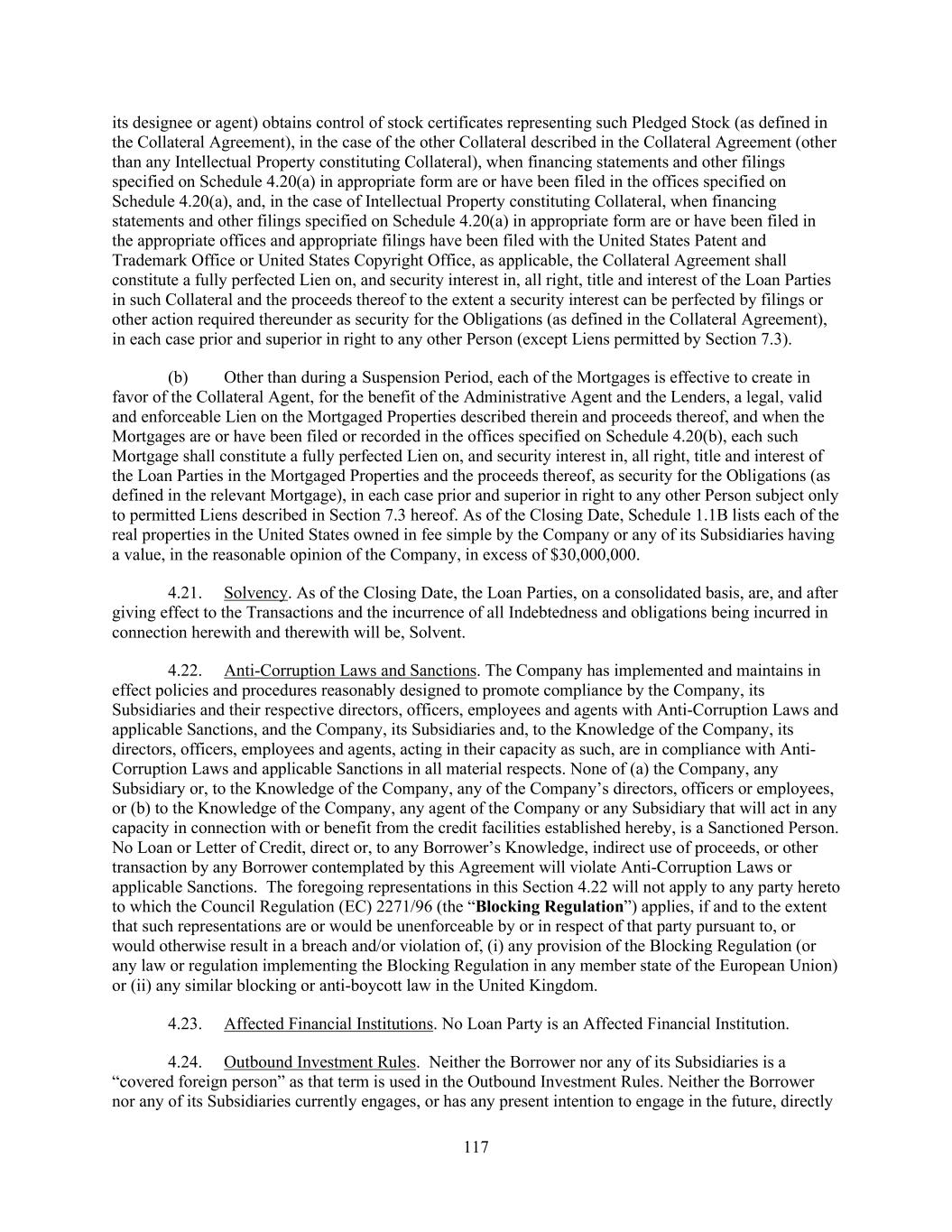 117 its designee or agent) obtains control of stock certificates representing such Pledged Stock (as defined in the Collateral Agreement), in the case of the other Collateral described in the Collateral Agreement (other than any Intellectual Property constituting Collateral), when financing statements and other filings specified on Schedule 4.20(a) in appropriate form are or have been filed in the offices specified on Schedule 4.20(a), and, in the case of Intellectual Property constituting Collateral, when financing statements and other filings specified on Schedule 4.20(a) in appropriate form are or have been filed in the appropriate offices and appropriate filings have been filed with the United States Patent and Trademark Office or United States Copyright Office, as applicable, the Collateral Agreement shall constitute a fully perfected Lien on, and security interest in, all right, title and interest of the Loan Parties in such Collateral and the proceeds thereof to the extent a security interest can be perfected by filings or other action required thereunder as security for the Obligations (as defined in the Collateral Agreement), in each case prior and superior in right to any other Person (except Liens permitted by Section 7.3). (b) Other than during a Suspension Period, each of the Mortgages is effective to create in favor of the Collateral Agent, for the benefit of the Administrative Agent and the Lenders, a legal, valid and enforceable Lien on the Mortgaged Properties described therein and proceeds thereof, and when the Mortgages are or have been filed or recorded in the offices specified on Schedule 4.20(b), each such Mortgage shall constitute a fully perfected Lien on, and security interest in, all right, title and interest of the Loan Parties in the Mortgaged Properties and the proceeds thereof, as security for the Obligations (as defined in the relevant Mortgage), in each case prior and superior in right to any other Person subject only to permitted Liens described in Section 7.3 hereof. As of the Closing Date, Schedule 1.1B lists each of the real properties in the United States owned in fee simple by the Company or any of its Subsidiaries having a value, in the reasonable opinion of the Company, in excess of $30,000,000. 4.21. Solvency. As of the Closing Date, the Loan Parties, on a consolidated basis, are, and after giving effect to the Transactions and the incurrence of all Indebtedness and obligations being incurred in connection herewith and therewith will be, Solvent. 4.22. Anti-Corruption Laws and Sanctions. The Company has implemented and maintains in effect policies and procedures reasonably designed to promote compliance by the Company, its Subsidiaries and their respective directors, officers, employees and agents with Anti-Corruption Laws and applicable Sanctions, and the Company, its Subsidiaries and, to the Knowledge of the Company, its directors, officers, employees and agents, acting in their capacity as such, are in compliance with Anti- Corruption Laws and applicable Sanctions in all material respects. None of (a) the Company, any Subsidiary or, to the Knowledge of the Company, any of the Company’s directors, officers or employees, or (b) to the Knowledge of the Company, any agent of the Company or any Subsidiary that will act in any capacity in connection with or benefit from the credit facilities established hereby, is a Sanctioned Person. No Loan or Letter of Credit, direct or, to any Borrower’s Knowledge, indirect use of proceeds, or other transaction by any Borrower contemplated by this Agreement will violate Anti-Corruption Laws or applicable Sanctions. The foregoing representations in this Section 4.22 will not apply to any party hereto to which the Council Regulation (EC) 2271/96 (the “Blocking Regulation”) applies, if and to the extent that such representations are or would be unenforceable by or in respect of that party pursuant to, or would otherwise result in a breach and/or violation of, (i) any provision of the Blocking Regulation (or any law or regulation implementing the Blocking Regulation in any member state of the European Union) or (ii) any similar blocking or anti-boycott law in the United Kingdom. 4.23. Affected Financial Institutions. No Loan Party is an Affected Financial Institution. 4.24. Outbound Investment Rules. Neither the Borrower nor any of its Subsidiaries is a “covered foreign person” as that term is used in the Outbound Investment Rules. Neither the Borrower nor any of its Subsidiaries currently engages, or has any present intention to engage in the future, directly