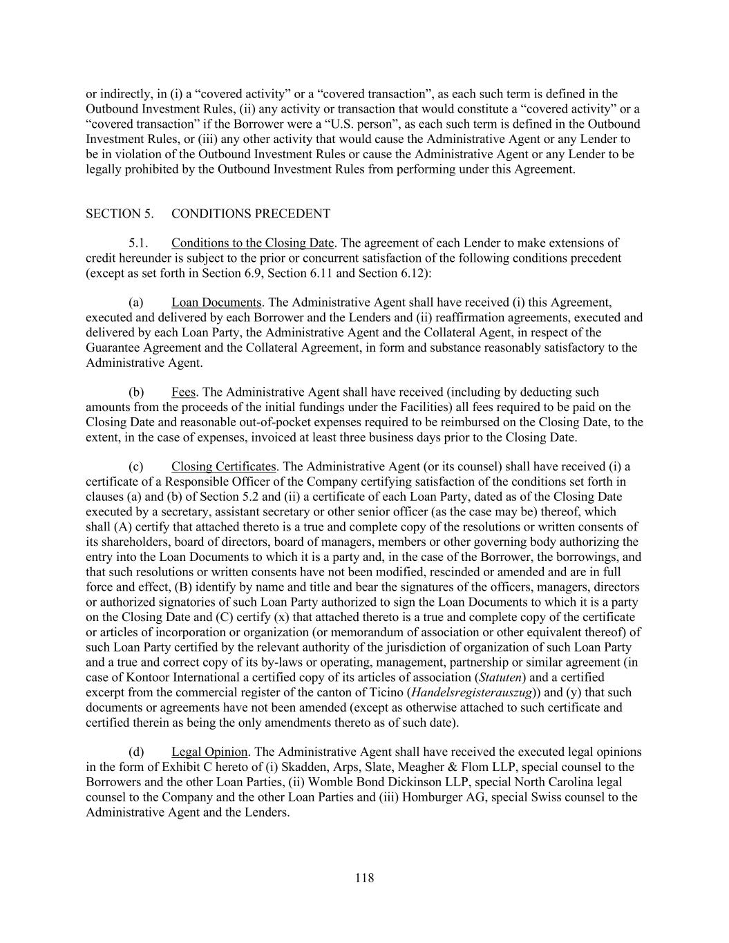 118 or indirectly, in (i) a “covered activity” or a “covered transaction”, as each such term is defined in the Outbound Investment Rules, (ii) any activity or transaction that would constitute a “covered activity” or a “covered transaction” if the Borrower were a “U.S. person”, as each such term is defined in the Outbound Investment Rules, or (iii) any other activity that would cause the Administrative Agent or any Lender to be in violation of the Outbound Investment Rules or cause the Administrative Agent or any Lender to be legally prohibited by the Outbound Investment Rules from performing under this Agreement. SECTION 5. CONDITIONS PRECEDENT 5.1. Conditions to the Closing Date. The agreement of each Lender to make extensions of credit hereunder is subject to the prior or concurrent satisfaction of the following conditions precedent (except as set forth in Section 6.9, Section 6.11 and Section 6.12): (a) Loan Documents. The Administrative Agent shall have received (i) this Agreement, executed and delivered by each Borrower and the Lenders and (ii) reaffirmation agreements, executed and delivered by each Loan Party, the Administrative Agent and the Collateral Agent, in respect of the Guarantee Agreement and the Collateral Agreement, in form and substance reasonably satisfactory to the Administrative Agent. (b) Fees. The Administrative Agent shall have received (including by deducting such amounts from the proceeds of the initial fundings under the Facilities) all fees required to be paid on the Closing Date and reasonable out-of-pocket expenses required to be reimbursed on the Closing Date, to the extent, in the case of expenses, invoiced at least three business days prior to the Closing Date. (c) Closing Certificates. The Administrative Agent (or its counsel) shall have received (i) a certificate of a Responsible Officer of the Company certifying satisfaction of the conditions set forth in clauses (a) and (b) of Section 5.2 and (ii) a certificate of each Loan Party, dated as of the Closing Date executed by a secretary, assistant secretary or other senior officer (as the case may be) thereof, which shall (A) certify that attached thereto is a true and complete copy of the resolutions or written consents of its shareholders, board of directors, board of managers, members or other governing body authorizing the entry into the Loan Documents to which it is a party and, in the case of the Borrower, the borrowings, and that such resolutions or written consents have not been modified, rescinded or amended and are in full force and effect, (B) identify by name and title and bear the signatures of the officers, managers, directors or authorized signatories of such Loan Party authorized to sign the Loan Documents to which it is a party on the Closing Date and (C) certify (x) that attached thereto is a true and complete copy of the certificate or articles of incorporation or organization (or memorandum of association or other equivalent thereof) of such Loan Party certified by the relevant authority of the jurisdiction of organization of such Loan Party and a true and correct copy of its by-laws or operating, management, partnership or similar agreement (in case of Kontoor International a certified copy of its articles of association (Statuten) and a certified excerpt from the commercial register of the canton of Ticino (Handelsregisterauszug)) and (y) that such documents or agreements have not been amended (except as otherwise attached to such certificate and certified therein as being the only amendments thereto as of such date). (d) Legal Opinion. The Administrative Agent shall have received the executed legal opinions in the form of Exhibit C hereto of (i) Skadden, Arps, Slate, Meagher & Flom LLP, special counsel to the Borrowers and the other Loan Parties, (ii) Womble Bond Dickinson LLP, special North Carolina legal counsel to the Company and the other Loan Parties and (iii) Homburger AG, special Swiss counsel to the Administrative Agent and the Lenders.