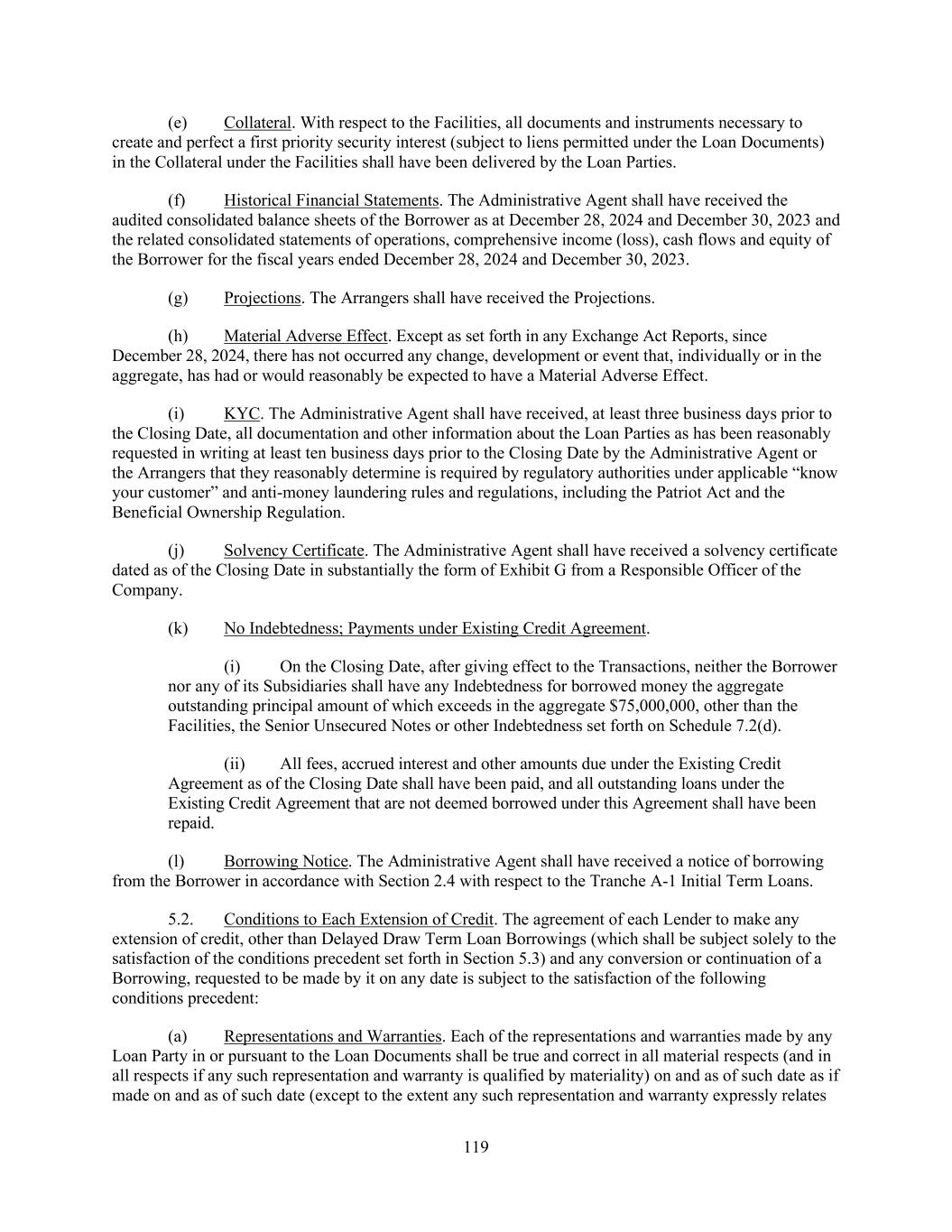119 (e) Collateral. With respect to the Facilities, all documents and instruments necessary to create and perfect a first priority security interest (subject to liens permitted under the Loan Documents) in the Collateral under the Facilities shall have been delivered by the Loan Parties. (f) Historical Financial Statements. The Administrative Agent shall have received the audited consolidated balance sheets of the Borrower as at December 28, 2024 and December 30, 2023 and the related consolidated statements of operations, comprehensive income (loss), cash flows and equity of the Borrower for the fiscal years ended December 28, 2024 and December 30, 2023. (g) Projections. The Arrangers shall have received the Projections. (h) Material Adverse Effect. Except as set forth in any Exchange Act Reports, since December 28, 2024, there has not occurred any change, development or event that, individually or in the aggregate, has had or would reasonably be expected to have a Material Adverse Effect. (i) KYC. The Administrative Agent shall have received, at least three business days prior to the Closing Date, all documentation and other information about the Loan Parties as has been reasonably requested in writing at least ten business days prior to the Closing Date by the Administrative Agent or the Arrangers that they reasonably determine is required by regulatory authorities under applicable “know your customer” and anti-money laundering rules and regulations, including the Patriot Act and the Beneficial Ownership Regulation. (j) Solvency Certificate. The Administrative Agent shall have received a solvency certificate dated as of the Closing Date in substantially the form of Exhibit G from a Responsible Officer of the Company. (k) No Indebtedness; Payments under Existing Credit Agreement. (i) On the Closing Date, after giving effect to the Transactions, neither the Borrower nor any of its Subsidiaries shall have any Indebtedness for borrowed money the aggregate outstanding principal amount of which exceeds in the aggregate $75,000,000, other than the Facilities, the Senior Unsecured Notes or other Indebtedness set forth on Schedule 7.2(d). (ii) All fees, accrued interest and other amounts due under the Existing Credit Agreement as of the Closing Date shall have been paid, and all outstanding loans under the Existing Credit Agreement that are not deemed borrowed under this Agreement shall have been repaid. (l) Borrowing Notice. The Administrative Agent shall have received a notice of borrowing from the Borrower in accordance with Section 2.4 with respect to the Tranche A-1 Initial Term Loans. 5.2. Conditions to Each Extension of Credit. The agreement of each Lender to make any extension of credit, other than Delayed Draw Term Loan Borrowings (which shall be subject solely to the satisfaction of the conditions precedent set forth in Section 5.3) and any conversion or continuation of a Borrowing, requested to be made by it on any date is subject to the satisfaction of the following conditions precedent: (a) Representations and Warranties. Each of the representations and warranties made by any Loan Party in or pursuant to the Loan Documents shall be true and correct in all material respects (and in all respects if any such representation and warranty is qualified by materiality) on and as of such date as if made on and as of such date (except to the extent any such representation and warranty expressly relates