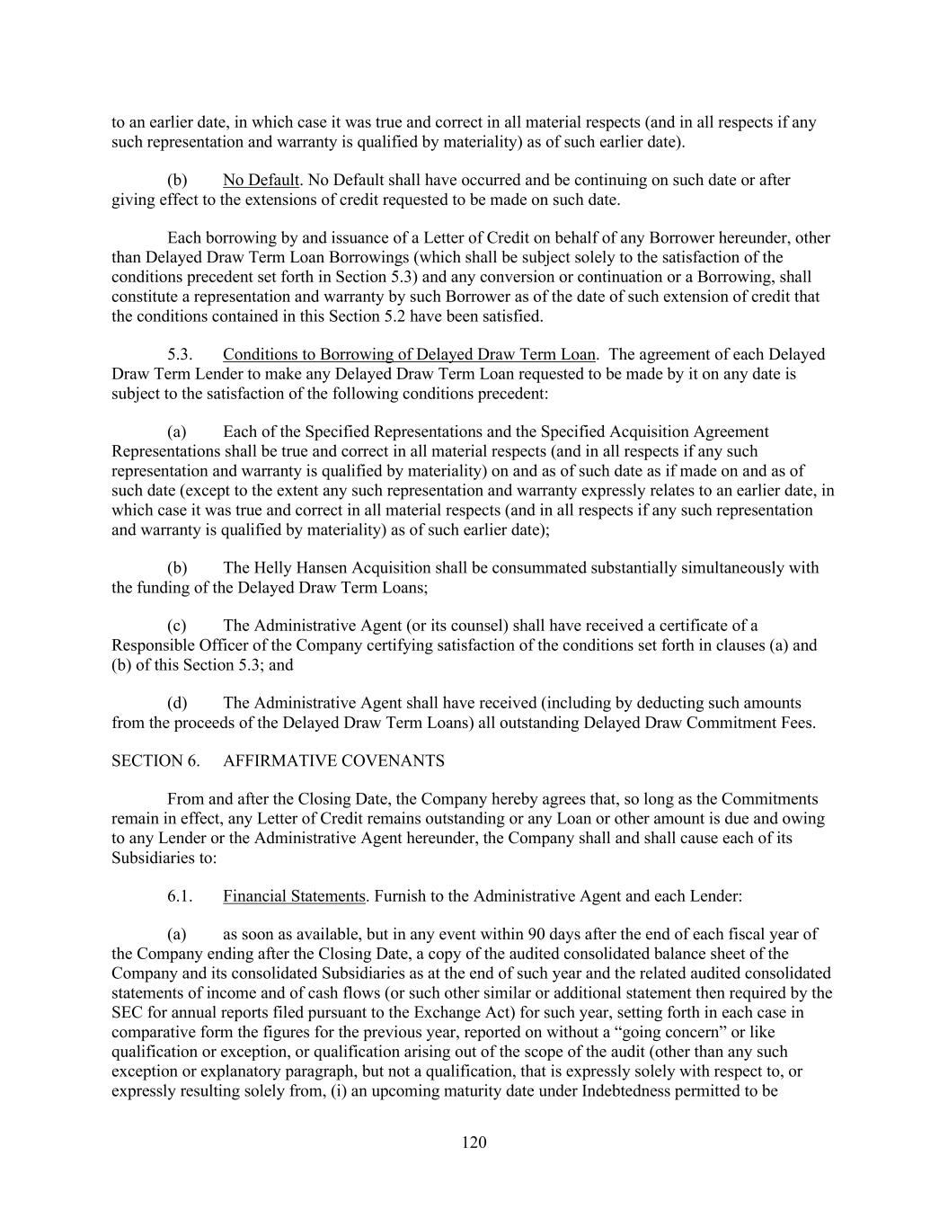 120 to an earlier date, in which case it was true and correct in all material respects (and in all respects if any such representation and warranty is qualified by materiality) as of such earlier date). (b) No Default. No Default shall have occurred and be continuing on such date or after giving effect to the extensions of credit requested to be made on such date. Each borrowing by and issuance of a Letter of Credit on behalf of any Borrower hereunder, other than Delayed Draw Term Loan Borrowings (which shall be subject solely to the satisfaction of the conditions precedent set forth in Section 5.3) and any conversion or continuation or a Borrowing, shall constitute a representation and warranty by such Borrower as of the date of such extension of credit that the conditions contained in this Section 5.2 have been satisfied. 5.3. Conditions to Borrowing of Delayed Draw Term Loan. The agreement of each Delayed Draw Term Lender to make any Delayed Draw Term Loan requested to be made by it on any date is subject to the satisfaction of the following conditions precedent: (a) Each of the Specified Representations and the Specified Acquisition Agreement Representations shall be true and correct in all material respects (and in all respects if any such representation and warranty is qualified by materiality) on and as of such date as if made on and as of such date (except to the extent any such representation and warranty expressly relates to an earlier date, in which case it was true and correct in all material respects (and in all respects if any such representation and warranty is qualified by materiality) as of such earlier date); (b) The Helly Hansen Acquisition shall be consummated substantially simultaneously with the funding of the Delayed Draw Term Loans; (c) The Administrative Agent (or its counsel) shall have received a certificate of a Responsible Officer of the Company certifying satisfaction of the conditions set forth in clauses (a) and (b) of this Section 5.3; and (d) The Administrative Agent shall have received (including by deducting such amounts from the proceeds of the Delayed Draw Term Loans) all outstanding Delayed Draw Commitment Fees. SECTION 6. AFFIRMATIVE COVENANTS From and after the Closing Date, the Company hereby agrees that, so long as the Commitments remain in effect, any Letter of Credit remains outstanding or any Loan or other amount is due and owing to any Lender or the Administrative Agent hereunder, the Company shall and shall cause each of its Subsidiaries to: 6.1. Financial Statements. Furnish to the Administrative Agent and each Lender: (a) as soon as available, but in any event within 90 days after the end of each fiscal year of the Company ending after the Closing Date, a copy of the audited consolidated balance sheet of the Company and its consolidated Subsidiaries as at the end of such year and the related audited consolidated statements of income and of cash flows (or such other similar or additional statement then required by the SEC for annual reports filed pursuant to the Exchange Act) for such year, setting forth in each case in comparative form the figures for the previous year, reported on without a “going concern” or like qualification or exception, or qualification arising out of the scope of the audit (other than any such exception or explanatory paragraph, but not a qualification, that is expressly solely with respect to, or expressly resulting solely from, (i) an upcoming maturity date under Indebtedness permitted to be