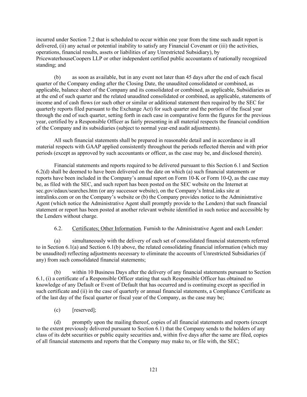 121 incurred under Section 7.2 that is scheduled to occur within one year from the time such audit report is delivered, (ii) any actual or potential inability to satisfy any Financial Covenant or (iii) the activities, operations, financial results, assets or liabilities of any Unrestricted Subsidiary), by PricewaterhouseCoopers LLP or other independent certified public accountants of nationally recognized standing; and (b) as soon as available, but in any event not later than 45 days after the end of each fiscal quarter of the Company ending after the Closing Date, the unaudited consolidated or combined, as applicable, balance sheet of the Company and its consolidated or combined, as applicable, Subsidiaries as at the end of such quarter and the related unaudited consolidated or combined, as applicable, statements of income and of cash flows (or such other or similar or additional statement then required by the SEC for quarterly reports filed pursuant to the Exchange Act) for such quarter and the portion of the fiscal year through the end of such quarter, setting forth in each case in comparative form the figures for the previous year, certified by a Responsible Officer as fairly presenting in all material respects the financial condition of the Company and its subsidiaries (subject to normal year-end audit adjustments). All such financial statements shall be prepared in reasonable detail and in accordance in all material respects with GAAP applied consistently throughout the periods reflected therein and with prior periods (except as approved by such accountants or officer, as the case may be, and disclosed therein). Financial statements and reports required to be delivered pursuant to this Section 6.1 and Section 6.2(d) shall be deemed to have been delivered on the date on which (a) such financial statements or reports have been included in the Company’s annual report on Form 10-K or Form 10-Q, as the case may be, as filed with the SEC, and such report has been posted on the SEC website on the Internet at sec.gov/edaux/searches.htm (or any successor website), on the Company’s IntraLinks site at intralinks.com or on the Company’s website or (b) the Company provides notice to the Administrative Agent (which notice the Administrative Agent shall promptly provide to the Lenders) that such financial statement or report has been posted at another relevant website identified in such notice and accessible by the Lenders without charge. 6.2. Certificates; Other Information. Furnish to the Administrative Agent and each Lender: (a) simultaneously with the delivery of each set of consolidated financial statements referred to in Section 6.1(a) and Section 6.1(b) above, the related consolidating financial information (which may be unaudited) reflecting adjustments necessary to eliminate the accounts of Unrestricted Subsidiaries (if any) from such consolidated financial statements; (b) within 10 Business Days after the delivery of any financial statements pursuant to Section 6.1, (i) a certificate of a Responsible Officer stating that such Responsible Officer has obtained no knowledge of any Default or Event of Default that has occurred and is continuing except as specified in such certificate and (ii) in the case of quarterly or annual financial statements, a Compliance Certificate as of the last day of the fiscal quarter or fiscal year of the Company, as the case may be; (c) [reserved]; (d) promptly upon the mailing thereof, copies of all financial statements and reports (except to the extent previously delivered pursuant to Section 6.1) that the Company sends to the holders of any class of its debt securities or public equity securities and, within five days after the same are filed, copies of all financial statements and reports that the Company may make to, or file with, the SEC;