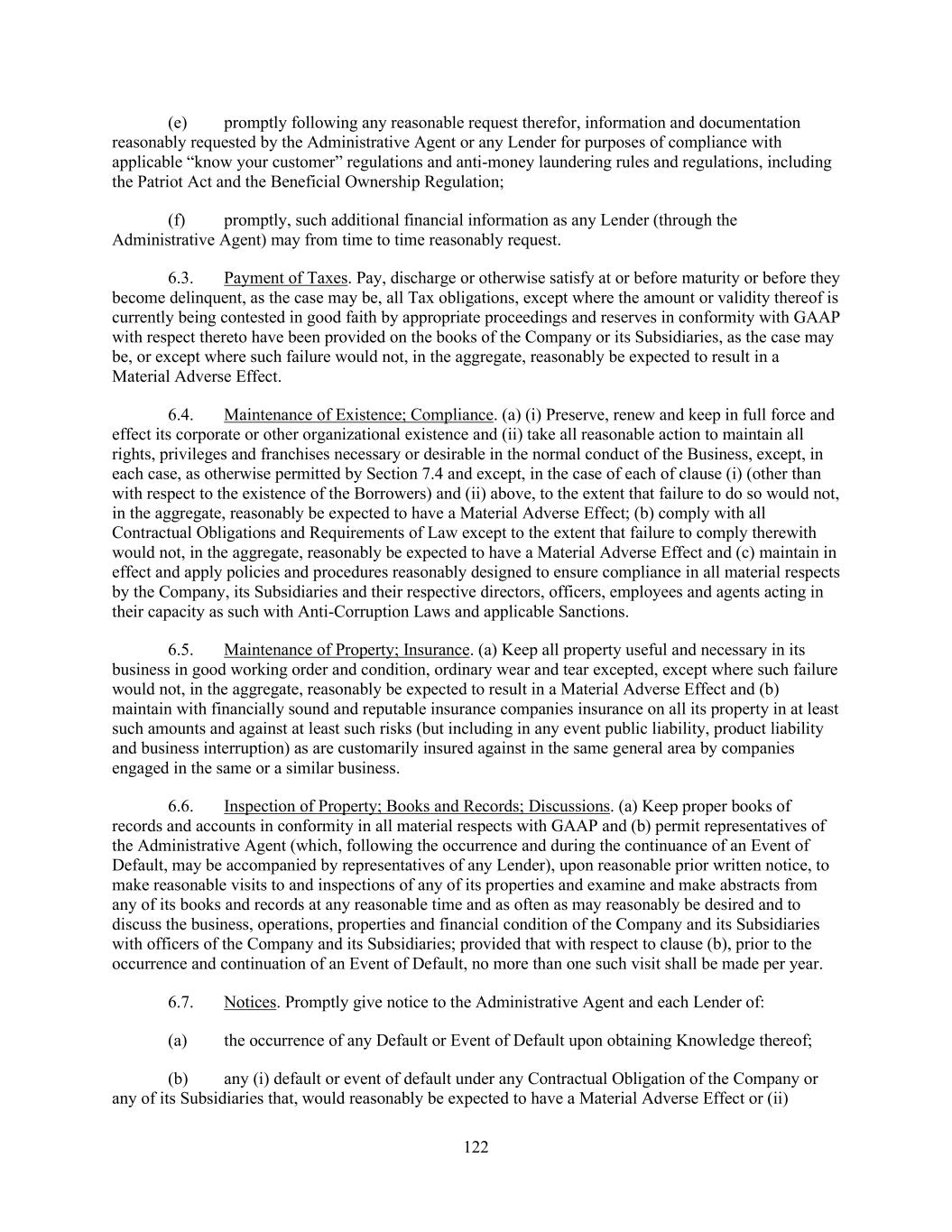 122 (e) promptly following any reasonable request therefor, information and documentation reasonably requested by the Administrative Agent or any Lender for purposes of compliance with applicable “know your customer” regulations and anti-money laundering rules and regulations, including the Patriot Act and the Beneficial Ownership Regulation; (f) promptly, such additional financial information as any Lender (through the Administrative Agent) may from time to time reasonably request. 6.3. Payment of Taxes. Pay, discharge or otherwise satisfy at or before maturity or before they become delinquent, as the case may be, all Tax obligations, except where the amount or validity thereof is currently being contested in good faith by appropriate proceedings and reserves in conformity with GAAP with respect thereto have been provided on the books of the Company or its Subsidiaries, as the case may be, or except where such failure would not, in the aggregate, reasonably be expected to result in a Material Adverse Effect. 6.4. Maintenance of Existence; Compliance. (a) (i) Preserve, renew and keep in full force and effect its corporate or other organizational existence and (ii) take all reasonable action to maintain all rights, privileges and franchises necessary or desirable in the normal conduct of the Business, except, in each case, as otherwise permitted by Section 7.4 and except, in the case of each of clause (i) (other than with respect to the existence of the Borrowers) and (ii) above, to the extent that failure to do so would not, in the aggregate, reasonably be expected to have a Material Adverse Effect; (b) comply with all Contractual Obligations and Requirements of Law except to the extent that failure to comply therewith would not, in the aggregate, reasonably be expected to have a Material Adverse Effect and (c) maintain in effect and apply policies and procedures reasonably designed to ensure compliance in all material respects by the Company, its Subsidiaries and their respective directors, officers, employees and agents acting in their capacity as such with Anti-Corruption Laws and applicable Sanctions. 6.5. Maintenance of Property; Insurance. (a) Keep all property useful and necessary in its business in good working order and condition, ordinary wear and tear excepted, except where such failure would not, in the aggregate, reasonably be expected to result in a Material Adverse Effect and (b) maintain with financially sound and reputable insurance companies insurance on all its property in at least such amounts and against at least such risks (but including in any event public liability, product liability and business interruption) as are customarily insured against in the same general area by companies engaged in the same or a similar business. 6.6. Inspection of Property; Books and Records; Discussions. (a) Keep proper books of records and accounts in conformity in all material respects with GAAP and (b) permit representatives of the Administrative Agent (which, following the occurrence and during the continuance of an Event of Default, may be accompanied by representatives of any Lender), upon reasonable prior written notice, to make reasonable visits to and inspections of any of its properties and examine and make abstracts from any of its books and records at any reasonable time and as often as may reasonably be desired and to discuss the business, operations, properties and financial condition of the Company and its Subsidiaries with officers of the Company and its Subsidiaries; provided that with respect to clause (b), prior to the occurrence and continuation of an Event of Default, no more than one such visit shall be made per year. 6.7. Notices. Promptly give notice to the Administrative Agent and each Lender of: (a) the occurrence of any Default or Event of Default upon obtaining Knowledge thereof; (b) any (i) default or event of default under any Contractual Obligation of the Company or any of its Subsidiaries that, would reasonably be expected to have a Material Adverse Effect or (ii)
