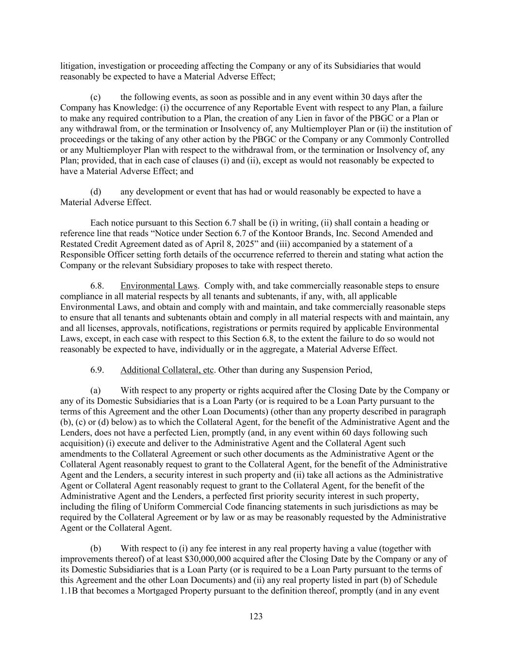 123 litigation, investigation or proceeding affecting the Company or any of its Subsidiaries that would reasonably be expected to have a Material Adverse Effect; (c) the following events, as soon as possible and in any event within 30 days after the Company has Knowledge: (i) the occurrence of any Reportable Event with respect to any Plan, a failure to make any required contribution to a Plan, the creation of any Lien in favor of the PBGC or a Plan or any withdrawal from, or the termination or Insolvency of, any Multiemployer Plan or (ii) the institution of proceedings or the taking of any other action by the PBGC or the Company or any Commonly Controlled or any Multiemployer Plan with respect to the withdrawal from, or the termination or Insolvency of, any Plan; provided, that in each case of clauses (i) and (ii), except as would not reasonably be expected to have a Material Adverse Effect; and (d) any development or event that has had or would reasonably be expected to have a Material Adverse Effect. Each notice pursuant to this Section 6.7 shall be (i) in writing, (ii) shall contain a heading or reference line that reads “Notice under Section 6.7 of the Kontoor Brands, Inc. Second Amended and Restated Credit Agreement dated as of April 8, 2025” and (iii) accompanied by a statement of a Responsible Officer setting forth details of the occurrence referred to therein and stating what action the Company or the relevant Subsidiary proposes to take with respect thereto. 6.8. Environmental Laws. Comply with, and take commercially reasonable steps to ensure compliance in all material respects by all tenants and subtenants, if any, with, all applicable Environmental Laws, and obtain and comply with and maintain, and take commercially reasonable steps to ensure that all tenants and subtenants obtain and comply in all material respects with and maintain, any and all licenses, approvals, notifications, registrations or permits required by applicable Environmental Laws, except, in each case with respect to this Section 6.8, to the extent the failure to do so would not reasonably be expected to have, individually or in the aggregate, a Material Adverse Effect. 6.9. Additional Collateral, etc. Other than during any Suspension Period, (a) With respect to any property or rights acquired after the Closing Date by the Company or any of its Domestic Subsidiaries that is a Loan Party (or is required to be a Loan Party pursuant to the terms of this Agreement and the other Loan Documents) (other than any property described in paragraph (b), (c) or (d) below) as to which the Collateral Agent, for the benefit of the Administrative Agent and the Lenders, does not have a perfected Lien, promptly (and, in any event within 60 days following such acquisition) (i) execute and deliver to the Administrative Agent and the Collateral Agent such amendments to the Collateral Agreement or such other documents as the Administrative Agent or the Collateral Agent reasonably request to grant to the Collateral Agent, for the benefit of the Administrative Agent and the Lenders, a security interest in such property and (ii) take all actions as the Administrative Agent or Collateral Agent reasonably request to grant to the Collateral Agent, for the benefit of the Administrative Agent and the Lenders, a perfected first priority security interest in such property, including the filing of Uniform Commercial Code financing statements in such jurisdictions as may be required by the Collateral Agreement or by law or as may be reasonably requested by the Administrative Agent or the Collateral Agent. (b) With respect to (i) any fee interest in any real property having a value (together with improvements thereof) of at least $30,000,000 acquired after the Closing Date by the Company or any of its Domestic Subsidiaries that is a Loan Party (or is required to be a Loan Party pursuant to the terms of this Agreement and the other Loan Documents) and (ii) any real property listed in part (b) of Schedule 1.1B that becomes a Mortgaged Property pursuant to the definition thereof, promptly (and in any event
