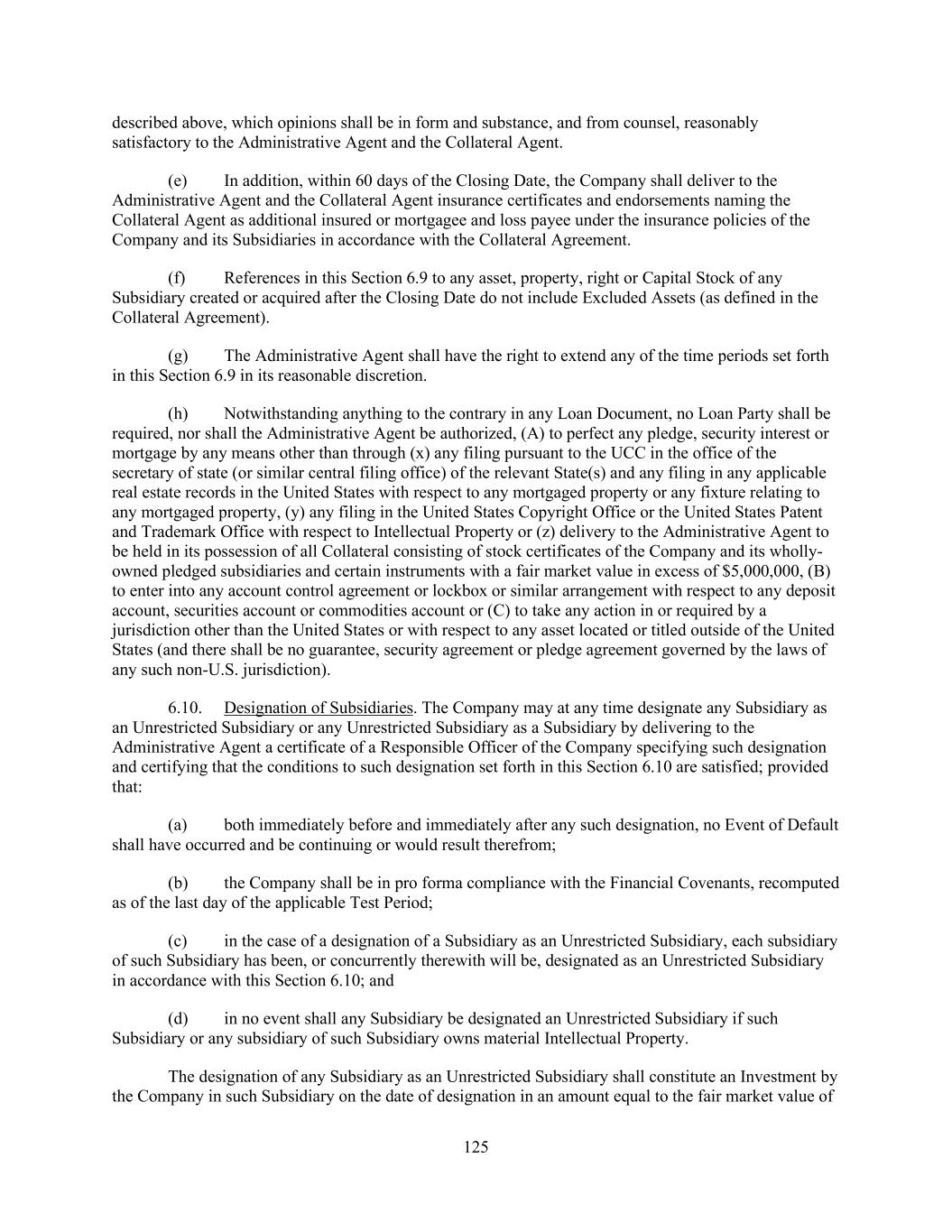 125 described above, which opinions shall be in form and substance, and from counsel, reasonably satisfactory to the Administrative Agent and the Collateral Agent. (e) In addition, within 60 days of the Closing Date, the Company shall deliver to the Administrative Agent and the Collateral Agent insurance certificates and endorsements naming the Collateral Agent as additional insured or mortgagee and loss payee under the insurance policies of the Company and its Subsidiaries in accordance with the Collateral Agreement. (f) References in this Section 6.9 to any asset, property, right or Capital Stock of any Subsidiary created or acquired after the Closing Date do not include Excluded Assets (as defined in the Collateral Agreement). (g) The Administrative Agent shall have the right to extend any of the time periods set forth in this Section 6.9 in its reasonable discretion. (h) Notwithstanding anything to the contrary in any Loan Document, no Loan Party shall be required, nor shall the Administrative Agent be authorized, (A) to perfect any pledge, security interest or mortgage by any means other than through (x) any filing pursuant to the UCC in the office of the secretary of state (or similar central filing office) of the relevant State(s) and any filing in any applicable real estate records in the United States with respect to any mortgaged property or any fixture relating to any mortgaged property, (y) any filing in the United States Copyright Office or the United States Patent and Trademark Office with respect to Intellectual Property or (z) delivery to the Administrative Agent to be held in its possession of all Collateral consisting of stock certificates of the Company and its wholly- owned pledged subsidiaries and certain instruments with a fair market value in excess of $5,000,000, (B) to enter into any account control agreement or lockbox or similar arrangement with respect to any deposit account, securities account or commodities account or (C) to take any action in or required by a jurisdiction other than the United States or with respect to any asset located or titled outside of the United States (and there shall be no guarantee, security agreement or pledge agreement governed by the laws of any such non-U.S. jurisdiction). 6.10. Designation of Subsidiaries. The Company may at any time designate any Subsidiary as an Unrestricted Subsidiary or any Unrestricted Subsidiary as a Subsidiary by delivering to the Administrative Agent a certificate of a Responsible Officer of the Company specifying such designation and certifying that the conditions to such designation set forth in this Section 6.10 are satisfied; provided that: (a) both immediately before and immediately after any such designation, no Event of Default shall have occurred and be continuing or would result therefrom; (b) the Company shall be in pro forma compliance with the Financial Covenants, recomputed as of the last day of the applicable Test Period; (c) in the case of a designation of a Subsidiary as an Unrestricted Subsidiary, each subsidiary of such Subsidiary has been, or concurrently therewith will be, designated as an Unrestricted Subsidiary in accordance with this Section 6.10; and (d) in no event shall any Subsidiary be designated an Unrestricted Subsidiary if such Subsidiary or any subsidiary of such Subsidiary owns material Intellectual Property. The designation of any Subsidiary as an Unrestricted Subsidiary shall constitute an Investment by the Company in such Subsidiary on the date of designation in an amount equal to the fair market value of