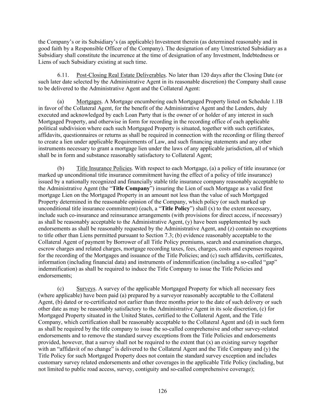 126 the Company’s or its Subsidiary’s (as applicable) Investment therein (as determined reasonably and in good faith by a Responsible Officer of the Company). The designation of any Unrestricted Subsidiary as a Subsidiary shall constitute the incurrence at the time of designation of any Investment, Indebtedness or Liens of such Subsidiary existing at such time. 6.11. Post-Closing Real Estate Deliverables. No later than 120 days after the Closing Date (or such later date selected by the Administrative Agent in its reasonable discretion) the Company shall cause to be delivered to the Administrative Agent and the Collateral Agent: (a) Mortgages. A Mortgage encumbering each Mortgaged Property listed on Schedule 1.1B in favor of the Collateral Agent, for the benefit of the Administrative Agent and the Lenders, duly executed and acknowledged by each Loan Party that is the owner of or holder of any interest in such Mortgaged Property, and otherwise in form for recording in the recording office of each applicable political subdivision where each such Mortgaged Property is situated, together with such certificates, affidavits, questionnaires or returns as shall be required in connection with the recording or filing thereof to create a lien under applicable Requirements of Law, and such financing statements and any other instruments necessary to grant a mortgage lien under the laws of any applicable jurisdiction, all of which shall be in form and substance reasonably satisfactory to Collateral Agent; (b) Title Insurance Policies. With respect to each Mortgage, (a) a policy of title insurance (or marked up unconditional title insurance commitment having the effect of a policy of title insurance) issued by a nationally recognized and financially stable title insurance company reasonably acceptable to the Administrative Agent (the “Title Company”) insuring the Lien of such Mortgage as a valid first mortgage Lien on the Mortgaged Property in an amount not less than the value of such Mortgaged Property determined in the reasonable opinion of the Company, which policy (or such marked up unconditional title insurance commitment) (each, a “Title Policy”) shall (x) to the extent necessary, include such co-insurance and reinsurance arrangements (with provisions for direct access, if necessary) as shall be reasonably acceptable to the Administrative Agent, (y) have been supplemented by such endorsements as shall be reasonably requested by the Administrative Agent, and (z) contain no exceptions to title other than Liens permitted pursuant to Section 7.3; (b) evidence reasonably acceptable to the Collateral Agent of payment by Borrower of all Title Policy premiums, search and examination charges, escrow charges and related charges, mortgage recording taxes, fees, charges, costs and expenses required for the recording of the Mortgages and issuance of the Title Policies; and (c) such affidavits, certificates, information (including financial data) and instruments of indemnification (including a so-called “gap” indemnification) as shall be required to induce the Title Company to issue the Title Policies and endorsements; (c) Surveys. A survey of the applicable Mortgaged Property for which all necessary fees (where applicable) have been paid (a) prepared by a surveyor reasonably acceptable to the Collateral Agent, (b) dated or re-certificated not earlier than three months prior to the date of such delivery or such other date as may be reasonably satisfactory to the Administrative Agent in its sole discretion, (c) for Mortgaged Property situated in the United States, certified to the Collateral Agent, and the Title Company, which certification shall be reasonably acceptable to the Collateral Agent and (d) in such form as shall be required by the title company to issue the so-called comprehensive and other survey-related endorsements and to remove the standard survey exceptions from the Title Policies and endorsements provided, however, that a survey shall not be required to the extent that (x) an existing survey together with an “affidavit of no change” is delivered to the Collateral Agent and the Title Company and (y) the Title Policy for such Mortgaged Property does not contain the standard survey exception and includes customary survey related endorsements and other coverages in the applicable Title Policy (including, but not limited to public road access, survey, contiguity and so-called comprehensive coverage);