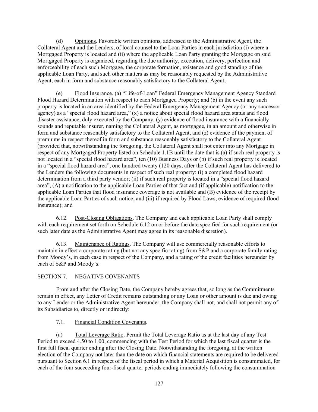 127 (d) Opinions. Favorable written opinions, addressed to the Administrative Agent, the Collateral Agent and the Lenders, of local counsel to the Loan Parties in each jurisdiction (i) where a Mortgaged Property is located and (ii) where the applicable Loan Party granting the Mortgage on said Mortgaged Property is organized, regarding the due authority, execution, delivery, perfection and enforceability of each such Mortgage, the corporate formation, existence and good standing of the applicable Loan Party, and such other matters as may be reasonably requested by the Administrative Agent, each in form and substance reasonably satisfactory to the Collateral Agent; (e) Flood Insurance. (a) “Life-of-Loan” Federal Emergency Management Agency Standard Flood Hazard Determination with respect to each Mortgaged Property; and (b) in the event any such property is located in an area identified by the Federal Emergency Management Agency (or any successor agency) as a “special flood hazard area,” (x) a notice about special flood hazard area status and flood disaster assistance, duly executed by the Company, (y) evidence of flood insurance with a financially sounds and reputable insurer, naming the Collateral Agent, as mortgagee, in an amount and otherwise in form and substance reasonably satisfactory to the Collateral Agent, and (z) evidence of the payment of premiums in respect thereof in form and substance reasonably satisfactory to the Collateral Agent (provided that, notwithstanding the foregoing, the Collateral Agent shall not enter into any Mortgage in respect of any Mortgaged Property listed on Schedule 1.1B until the date that is (a) if such real property is not located in a “special flood hazard area”, ten (10) Business Days or (b) if such real property is located in a “special flood hazard area”, one hundred twenty (120 days, after the Collateral Agent has delivered to the Lenders the following documents in respect of such real property: (i) a completed flood hazard determination from a third party vendor; (ii) if such real property is located in a “special flood hazard area”, (A) a notification to the applicable Loan Parties of that fact and (if applicable) notification to the applicable Loan Parties that flood insurance coverage is not available and (B) evidence of the receipt by the applicable Loan Parties of such notice; and (iii) if required by Flood Laws, evidence of required flood insurance); and 6.12. Post-Closing Obligations. The Company and each applicable Loan Party shall comply with each requirement set forth on Schedule 6.12 on or before the date specified for such requirement (or such later date as the Administrative Agent may agree in its reasonable discretion). 6.13. Maintenance of Ratings. The Company will use commercially reasonable efforts to maintain in effect a corporate rating (but not any specific rating) from S&P and a corporate family rating from Moody’s, in each case in respect of the Company, and a rating of the credit facilities hereunder by each of S&P and Moody’s. SECTION 7. NEGATIVE COVENANTS From and after the Closing Date, the Company hereby agrees that, so long as the Commitments remain in effect, any Letter of Credit remains outstanding or any Loan or other amount is due and owing to any Lender or the Administrative Agent hereunder, the Company shall not, and shall not permit any of its Subsidiaries to, directly or indirectly: 7.1. Financial Condition Covenants. (a) Total Leverage Ratio. Permit the Total Leverage Ratio as at the last day of any Test Period to exceed 4.50 to 1.00, commencing with the Test Period for which the last fiscal quarter is the first full fiscal quarter ending after the Closing Date. Notwithstanding the foregoing, at the written election of the Company not later than the date on which financial statements are required to be delivered pursuant to Section 6.1 in respect of the fiscal period in which a Material Acquisition is consummated, for each of the four succeeding four-fiscal quarter periods ending immediately following the consummation