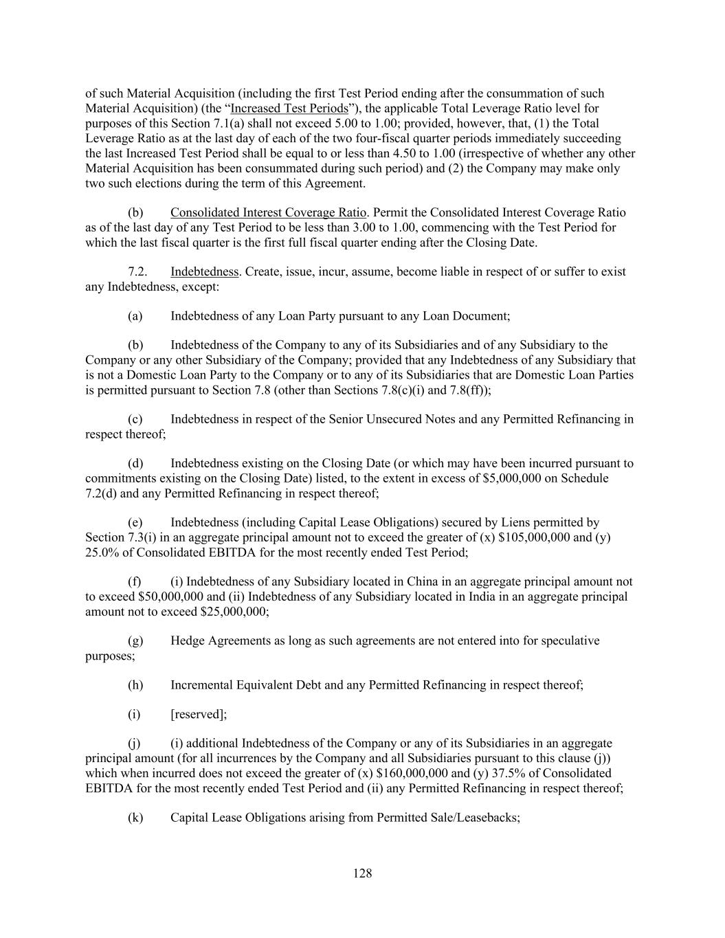 128 of such Material Acquisition (including the first Test Period ending after the consummation of such Material Acquisition) (the “Increased Test Periods”), the applicable Total Leverage Ratio level for purposes of this Section 7.1(a) shall not exceed 5.00 to 1.00; provided, however, that, (1) the Total Leverage Ratio as at the last day of each of the two four-fiscal quarter periods immediately succeeding the last Increased Test Period shall be equal to or less than 4.50 to 1.00 (irrespective of whether any other Material Acquisition has been consummated during such period) and (2) the Company may make only two such elections during the term of this Agreement. (b) Consolidated Interest Coverage Ratio. Permit the Consolidated Interest Coverage Ratio as of the last day of any Test Period to be less than 3.00 to 1.00, commencing with the Test Period for which the last fiscal quarter is the first full fiscal quarter ending after the Closing Date. 7.2. Indebtedness. Create, issue, incur, assume, become liable in respect of or suffer to exist any Indebtedness, except: (a) Indebtedness of any Loan Party pursuant to any Loan Document; (b) Indebtedness of the Company to any of its Subsidiaries and of any Subsidiary to the Company or any other Subsidiary of the Company; provided that any Indebtedness of any Subsidiary that is not a Domestic Loan Party to the Company or to any of its Subsidiaries that are Domestic Loan Parties is permitted pursuant to Section 7.8 (other than Sections 7.8(c)(i) and 7.8(ff)); (c) Indebtedness in respect of the Senior Unsecured Notes and any Permitted Refinancing in respect thereof; (d) Indebtedness existing on the Closing Date (or which may have been incurred pursuant to commitments existing on the Closing Date) listed, to the extent in excess of $5,000,000 on Schedule 7.2(d) and any Permitted Refinancing in respect thereof; (e) Indebtedness (including Capital Lease Obligations) secured by Liens permitted by Section 7.3(i) in an aggregate principal amount not to exceed the greater of (x) $105,000,000 and (y) 25.0% of Consolidated EBITDA for the most recently ended Test Period; (f) (i) Indebtedness of any Subsidiary located in China in an aggregate principal amount not to exceed $50,000,000 and (ii) Indebtedness of any Subsidiary located in India in an aggregate principal amount not to exceed $25,000,000; (g) Hedge Agreements as long as such agreements are not entered into for speculative purposes; (h) Incremental Equivalent Debt and any Permitted Refinancing in respect thereof; (i) [reserved]; (j) (i) additional Indebtedness of the Company or any of its Subsidiaries in an aggregate principal amount (for all incurrences by the Company and all Subsidiaries pursuant to this clause (j)) which when incurred does not exceed the greater of (x) $160,000,000 and (y) 37.5% of Consolidated EBITDA for the most recently ended Test Period and (ii) any Permitted Refinancing in respect thereof; (k) Capital Lease Obligations arising from Permitted Sale/Leasebacks;