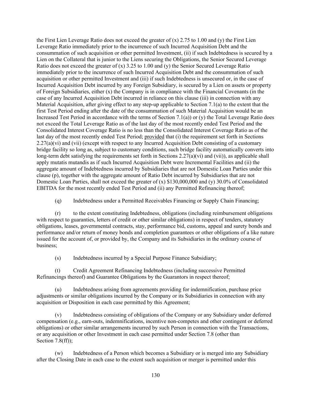 130 the First Lien Leverage Ratio does not exceed the greater of (x) 2.75 to 1.00 and (y) the First Lien Leverage Ratio immediately prior to the incurrence of such Incurred Acquisition Debt and the consummation of such acquisition or other permitted Investment, (ii) if such Indebtedness is secured by a Lien on the Collateral that is junior to the Liens securing the Obligations, the Senior Secured Leverage Ratio does not exceed the greater of (x) 3.25 to 1.00 and (y) the Senior Secured Leverage Ratio immediately prior to the incurrence of such Incurred Acquisition Debt and the consummation of such acquisition or other permitted Investment and (iii) if such Indebtedness is unsecured or, in the case of Incurred Acquisition Debt incurred by any Foreign Subsidiary, is secured by a Lien on assets or property of Foreign Subsidiaries, either (x) the Company is in compliance with the Financial Covenants (in the case of any Incurred Acquisition Debt incurred in reliance on this clause (iii) in connection with any Material Acquisition, after giving effect to any step-up applicable to Section 7.1(a) to the extent that the first Test Period ending after the date of the consummation of such Material Acquisition would be an Increased Test Period in accordance with the terms of Section 7.1(a)) or (y) the Total Leverage Ratio does not exceed the Total Leverage Ratio as of the last day of the most recently ended Test Period and the Consolidated Interest Coverage Ratio is no less than the Consolidated Interest Coverage Ratio as of the last day of the most recently ended Test Period; provided that (i) the requirement set forth in Sections 2.27(a)(vi) and (vii) (except with respect to any Incurred Acquisition Debt consisting of a customary bridge facility so long as, subject to customary conditions, such bridge facility automatically converts into long-term debt satisfying the requirements set forth in Sections 2.27(a)(vi) and (vii)), as applicable shall apply mutatis mutandis as if such Incurred Acquisition Debt were Incremental Facilities and (ii) the aggregate amount of Indebtedness incurred by Subsidiaries that are not Domestic Loan Parties under this clause (p), together with the aggregate amount of Ratio Debt incurred by Subsidiaries that are not Domestic Loan Parties, shall not exceed the greater of (x) $130,000,000 and (y) 30.0% of Consolidated EBITDA for the most recently ended Test Period and (ii) any Permitted Refinancing thereof; (q) Indebtedness under a Permitted Receivables Financing or Supply Chain Financing; (r) to the extent constituting Indebtedness, obligations (including reimbursement obligations with respect to guaranties, letters of credit or other similar obligations) in respect of tenders, statutory obligations, leases, governmental contracts, stay, performance bid, customs, appeal and surety bonds and performance and/or return of money bonds and completion guarantees or other obligations of a like nature issued for the account of, or provided by, the Company and its Subsidiaries in the ordinary course of business; (s) Indebtedness incurred by a Special Purpose Finance Subsidiary; (t) Credit Agreement Refinancing Indebtedness (including successive Permitted Refinancings thereof) and Guarantee Obligations by the Guarantors in respect thereof; (u) Indebtedness arising from agreements providing for indemnification, purchase price adjustments or similar obligations incurred by the Company or its Subsidiaries in connection with any acquisition or Disposition in each case permitted by this Agreement; (v) Indebtedness consisting of obligations of the Company or any Subsidiary under deferred compensation (e.g., earn-outs, indemnifications, incentive non-competes and other contingent or deferred obligations) or other similar arrangements incurred by such Person in connection with the Transactions, or any acquisition or other Investment in each case permitted under Section 7.8 (other than Section 7.8(ff)); (w) Indebtedness of a Person which becomes a Subsidiary or is merged into any Subsidiary after the Closing Date in each case to the extent such acquisition or merger is permitted under this