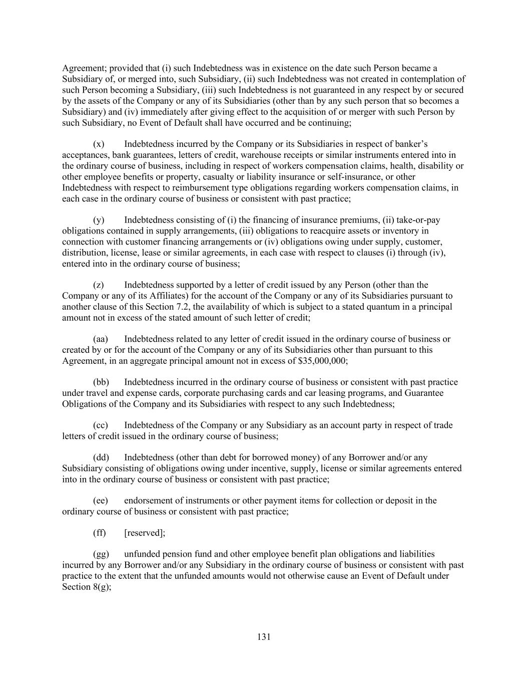131 Agreement; provided that (i) such Indebtedness was in existence on the date such Person became a Subsidiary of, or merged into, such Subsidiary, (ii) such Indebtedness was not created in contemplation of such Person becoming a Subsidiary, (iii) such Indebtedness is not guaranteed in any respect by or secured by the assets of the Company or any of its Subsidiaries (other than by any such person that so becomes a Subsidiary) and (iv) immediately after giving effect to the acquisition of or merger with such Person by such Subsidiary, no Event of Default shall have occurred and be continuing; (x) Indebtedness incurred by the Company or its Subsidiaries in respect of banker’s acceptances, bank guarantees, letters of credit, warehouse receipts or similar instruments entered into in the ordinary course of business, including in respect of workers compensation claims, health, disability or other employee benefits or property, casualty or liability insurance or self-insurance, or other Indebtedness with respect to reimbursement type obligations regarding workers compensation claims, in each case in the ordinary course of business or consistent with past practice; (y) Indebtedness consisting of (i) the financing of insurance premiums, (ii) take-or-pay obligations contained in supply arrangements, (iii) obligations to reacquire assets or inventory in connection with customer financing arrangements or (iv) obligations owing under supply, customer, distribution, license, lease or similar agreements, in each case with respect to clauses (i) through (iv), entered into in the ordinary course of business; (z) Indebtedness supported by a letter of credit issued by any Person (other than the Company or any of its Affiliates) for the account of the Company or any of its Subsidiaries pursuant to another clause of this Section 7.2, the availability of which is subject to a stated quantum in a principal amount not in excess of the stated amount of such letter of credit; (aa) Indebtedness related to any letter of credit issued in the ordinary course of business or created by or for the account of the Company or any of its Subsidiaries other than pursuant to this Agreement, in an aggregate principal amount not in excess of $35,000,000; (bb) Indebtedness incurred in the ordinary course of business or consistent with past practice under travel and expense cards, corporate purchasing cards and car leasing programs, and Guarantee Obligations of the Company and its Subsidiaries with respect to any such Indebtedness; (cc) Indebtedness of the Company or any Subsidiary as an account party in respect of trade letters of credit issued in the ordinary course of business; (dd) Indebtedness (other than debt for borrowed money) of any Borrower and/or any Subsidiary consisting of obligations owing under incentive, supply, license or similar agreements entered into in the ordinary course of business or consistent with past practice; (ee) endorsement of instruments or other payment items for collection or deposit in the ordinary course of business or consistent with past practice; (ff) [reserved]; (gg) unfunded pension fund and other employee benefit plan obligations and liabilities incurred by any Borrower and/or any Subsidiary in the ordinary course of business or consistent with past practice to the extent that the unfunded amounts would not otherwise cause an Event of Default under Section 8(g);