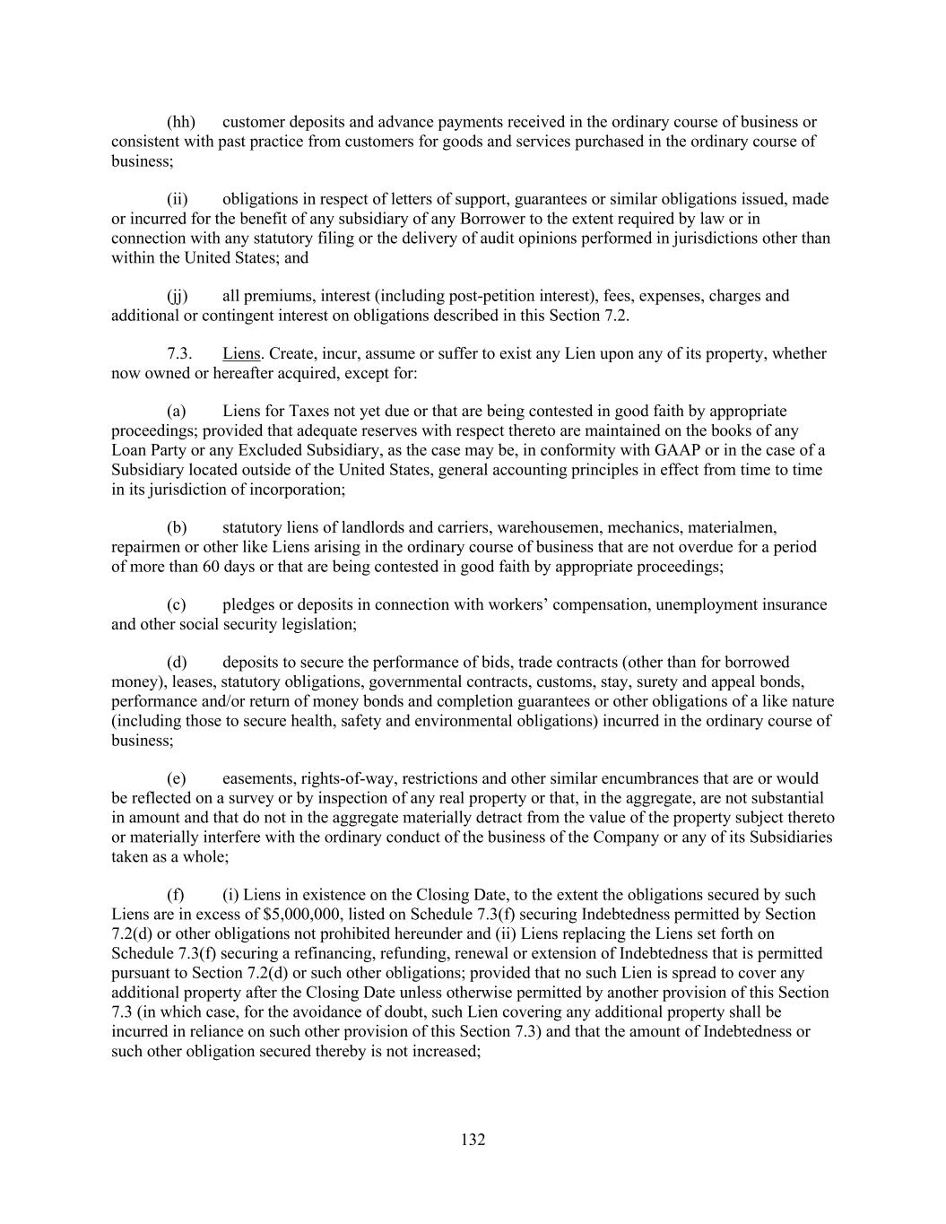 132 (hh) customer deposits and advance payments received in the ordinary course of business or consistent with past practice from customers for goods and services purchased in the ordinary course of business; (ii) obligations in respect of letters of support, guarantees or similar obligations issued, made or incurred for the benefit of any subsidiary of any Borrower to the extent required by law or in connection with any statutory filing or the delivery of audit opinions performed in jurisdictions other than within the United States; and (jj) all premiums, interest (including post-petition interest), fees, expenses, charges and additional or contingent interest on obligations described in this Section 7.2. 7.3. Liens. Create, incur, assume or suffer to exist any Lien upon any of its property, whether now owned or hereafter acquired, except for: (a) Liens for Taxes not yet due or that are being contested in good faith by appropriate proceedings; provided that adequate reserves with respect thereto are maintained on the books of any Loan Party or any Excluded Subsidiary, as the case may be, in conformity with GAAP or in the case of a Subsidiary located outside of the United States, general accounting principles in effect from time to time in its jurisdiction of incorporation; (b) statutory liens of landlords and carriers, warehousemen, mechanics, materialmen, repairmen or other like Liens arising in the ordinary course of business that are not overdue for a period of more than 60 days or that are being contested in good faith by appropriate proceedings; (c) pledges or deposits in connection with workers’ compensation, unemployment insurance and other social security legislation; (d) deposits to secure the performance of bids, trade contracts (other than for borrowed money), leases, statutory obligations, governmental contracts, customs, stay, surety and appeal bonds, performance and/or return of money bonds and completion guarantees or other obligations of a like nature (including those to secure health, safety and environmental obligations) incurred in the ordinary course of business; (e) easements, rights-of-way, restrictions and other similar encumbrances that are or would be reflected on a survey or by inspection of any real property or that, in the aggregate, are not substantial in amount and that do not in the aggregate materially detract from the value of the property subject thereto or materially interfere with the ordinary conduct of the business of the Company or any of its Subsidiaries taken as a whole; (f) (i) Liens in existence on the Closing Date, to the extent the obligations secured by such Liens are in excess of $5,000,000, listed on Schedule 7.3(f) securing Indebtedness permitted by Section 7.2(d) or other obligations not prohibited hereunder and (ii) Liens replacing the Liens set forth on Schedule 7.3(f) securing a refinancing, refunding, renewal or extension of Indebtedness that is permitted pursuant to Section 7.2(d) or such other obligations; provided that no such Lien is spread to cover any additional property after the Closing Date unless otherwise permitted by another provision of this Section 7.3 (in which case, for the avoidance of doubt, such Lien covering any additional property shall be incurred in reliance on such other provision of this Section 7.3) and that the amount of Indebtedness or such other obligation secured thereby is not increased;