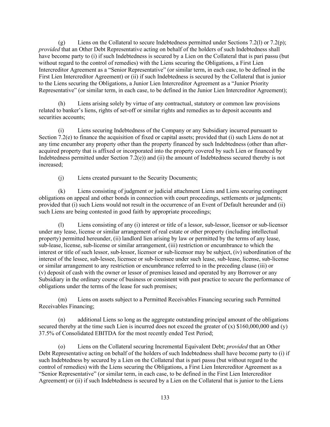 133 (g) Liens on the Collateral to secure Indebtedness permitted under Sections 7.2(l) or 7.2(p); provided that an Other Debt Representative acting on behalf of the holders of such Indebtedness shall have become party to (i) if such Indebtedness is secured by a Lien on the Collateral that is pari passu (but without regard to the control of remedies) with the Liens securing the Obligations, a First Lien Intercreditor Agreement as a “Senior Representative” (or similar term, in each case, to be defined in the First Lien Intercreditor Agreement) or (ii) if such Indebtedness is secured by the Collateral that is junior to the Liens securing the Obligations, a Junior Lien Intercreditor Agreement as a “Junior Priority Representative” (or similar term, in each case, to be defined in the Junior Lien Intercreditor Agreement); (h) Liens arising solely by virtue of any contractual, statutory or common law provisions related to banker’s liens, rights of set-off or similar rights and remedies as to deposit accounts and securities accounts; (i) Liens securing Indebtedness of the Company or any Subsidiary incurred pursuant to Section 7.2(e) to finance the acquisition of fixed or capital assets; provided that (i) such Liens do not at any time encumber any property other than the property financed by such Indebtedness (other than after- acquired property that is affixed or incorporated into the property covered by such Lien or financed by Indebtedness permitted under Section 7.2(e)) and (ii) the amount of Indebtedness secured thereby is not increased; (j) Liens created pursuant to the Security Documents; (k) Liens consisting of judgment or judicial attachment Liens and Liens securing contingent obligations on appeal and other bonds in connection with court proceedings, settlements or judgments; provided that (i) such Liens would not result in the occurrence of an Event of Default hereunder and (ii) such Liens are being contested in good faith by appropriate proceedings; (l) Liens consisting of any (i) interest or title of a lessor, sub-lessor, licensor or sub-licensor under any lease, license or similar arrangement of real estate or other property (including intellectual property) permitted hereunder, (ii) landlord lien arising by law or permitted by the terms of any lease, sub-lease, license, sub-license or similar arrangement, (iii) restriction or encumbrance to which the interest or title of such lessor, sub-lessor, licensor or sub-licensor may be subject, (iv) subordination of the interest of the lessee, sub-lessee, licensee or sub-licensee under such lease, sub-lease, license, sub-license or similar arrangement to any restriction or encumbrance referred to in the preceding clause (iii) or (v) deposit of cash with the owner or lessor of premises leased and operated by any Borrower or any Subsidiary in the ordinary course of business or consistent with past practice to secure the performance of obligations under the terms of the lease for such premises; (m) Liens on assets subject to a Permitted Receivables Financing securing such Permitted Receivables Financing; (n) additional Liens so long as the aggregate outstanding principal amount of the obligations secured thereby at the time such Lien is incurred does not exceed the greater of (x) $160,000,000 and (y) 37.5% of Consolidated EBITDA for the most recently ended Test Period; (o) Liens on the Collateral securing Incremental Equivalent Debt; provided that an Other Debt Representative acting on behalf of the holders of such Indebtedness shall have become party to (i) if such Indebtedness by secured by a Lien on the Collateral that is pari passu (but without regard to the control of remedies) with the Liens securing the Obligations, a First Lien Intercreditor Agreement as a “Senior Representative” (or similar term, in each case, to be defined in the First Lien Intercreditor Agreement) or (ii) if such Indebtedness is secured by a Lien on the Collateral that is junior to the Liens
