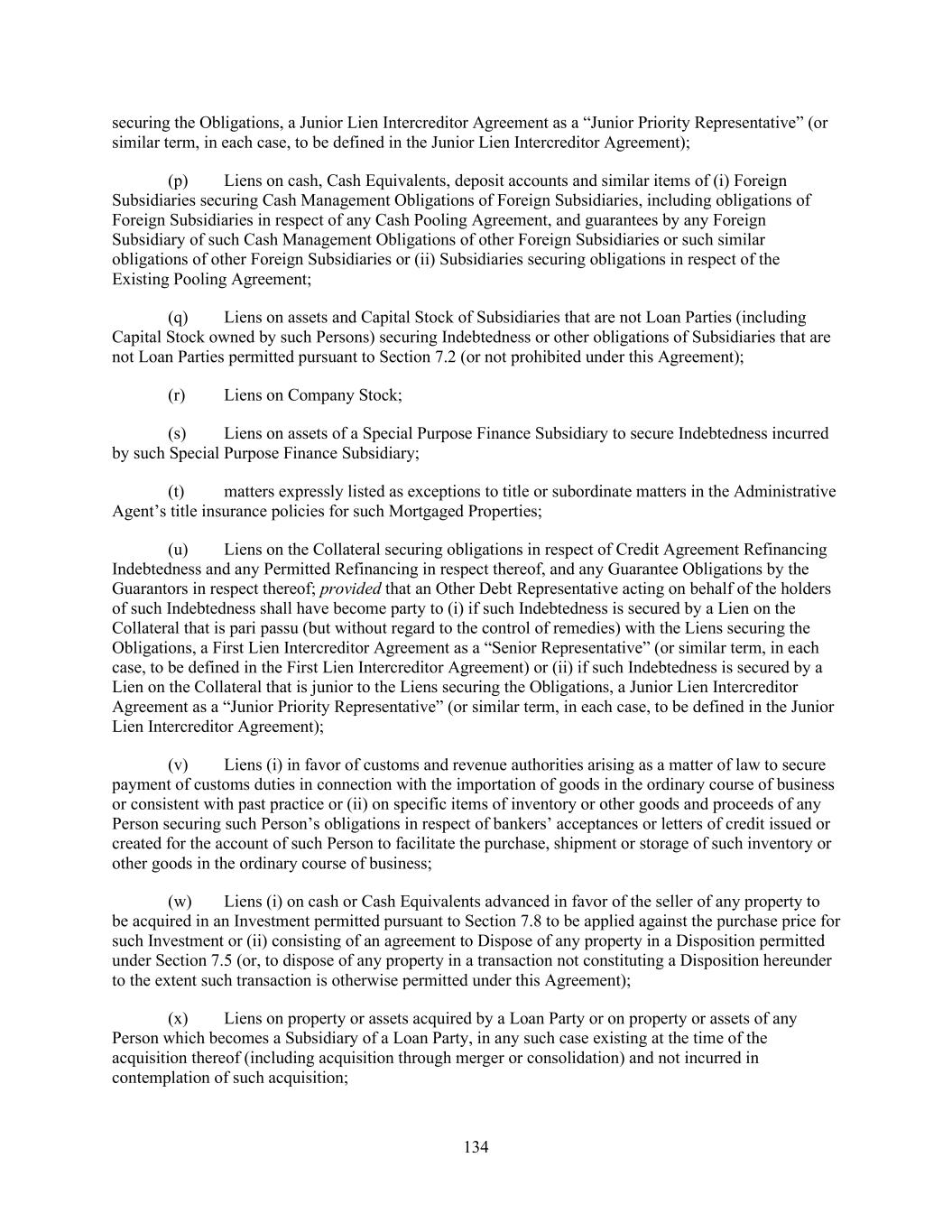 134 securing the Obligations, a Junior Lien Intercreditor Agreement as a “Junior Priority Representative” (or similar term, in each case, to be defined in the Junior Lien Intercreditor Agreement); (p) Liens on cash, Cash Equivalents, deposit accounts and similar items of (i) Foreign Subsidiaries securing Cash Management Obligations of Foreign Subsidiaries, including obligations of Foreign Subsidiaries in respect of any Cash Pooling Agreement, and guarantees by any Foreign Subsidiary of such Cash Management Obligations of other Foreign Subsidiaries or such similar obligations of other Foreign Subsidiaries or (ii) Subsidiaries securing obligations in respect of the Existing Pooling Agreement; (q) Liens on assets and Capital Stock of Subsidiaries that are not Loan Parties (including Capital Stock owned by such Persons) securing Indebtedness or other obligations of Subsidiaries that are not Loan Parties permitted pursuant to Section 7.2 (or not prohibited under this Agreement); (r) Liens on Company Stock; (s) Liens on assets of a Special Purpose Finance Subsidiary to secure Indebtedness incurred by such Special Purpose Finance Subsidiary; (t) matters expressly listed as exceptions to title or subordinate matters in the Administrative Agent’s title insurance policies for such Mortgaged Properties; (u) Liens on the Collateral securing obligations in respect of Credit Agreement Refinancing Indebtedness and any Permitted Refinancing in respect thereof, and any Guarantee Obligations by the Guarantors in respect thereof; provided that an Other Debt Representative acting on behalf of the holders of such Indebtedness shall have become party to (i) if such Indebtedness is secured by a Lien on the Collateral that is pari passu (but without regard to the control of remedies) with the Liens securing the Obligations, a First Lien Intercreditor Agreement as a “Senior Representative” (or similar term, in each case, to be defined in the First Lien Intercreditor Agreement) or (ii) if such Indebtedness is secured by a Lien on the Collateral that is junior to the Liens securing the Obligations, a Junior Lien Intercreditor Agreement as a “Junior Priority Representative” (or similar term, in each case, to be defined in the Junior Lien Intercreditor Agreement); (v) Liens (i) in favor of customs and revenue authorities arising as a matter of law to secure payment of customs duties in connection with the importation of goods in the ordinary course of business or consistent with past practice or (ii) on specific items of inventory or other goods and proceeds of any Person securing such Person’s obligations in respect of bankers’ acceptances or letters of credit issued or created for the account of such Person to facilitate the purchase, shipment or storage of such inventory or other goods in the ordinary course of business; (w) Liens (i) on cash or Cash Equivalents advanced in favor of the seller of any property to be acquired in an Investment permitted pursuant to Section 7.8 to be applied against the purchase price for such Investment or (ii) consisting of an agreement to Dispose of any property in a Disposition permitted under Section 7.5 (or, to dispose of any property in a transaction not constituting a Disposition hereunder to the extent such transaction is otherwise permitted under this Agreement); (x) Liens on property or assets acquired by a Loan Party or on property or assets of any Person which becomes a Subsidiary of a Loan Party, in any such case existing at the time of the acquisition thereof (including acquisition through merger or consolidation) and not incurred in contemplation of such acquisition;
