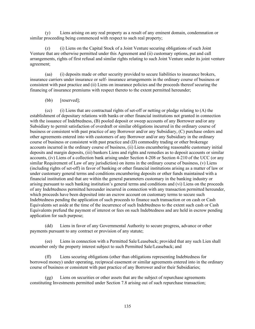 135 (y) Liens arising on any real property as a result of any eminent domain, condemnation or similar proceeding being commenced with respect to such real property; (z) (i) Liens on the Capital Stock of a Joint Venture securing obligations of such Joint Venture that are otherwise permitted under this Agreement and (ii) customary options, put and call arrangements, rights of first refusal and similar rights relating to such Joint Venture under its joint venture agreement; (aa) (i) deposits made or other security provided to secure liabilities to insurance brokers, insurance carriers under insurance or self- insurance arrangements in the ordinary course of business or consistent with past practice and (ii) Liens on insurance policies and the proceeds thereof securing the financing of insurance premiums with respect thereto to the extent permitted hereunder; (bb) [reserved]; (cc) (i) Liens that are contractual rights of set-off or netting or pledge relating to (A) the establishment of depositary relations with banks or other financial institutions not granted in connection with the issuance of Indebtedness, (B) pooled deposit or sweep accounts of any Borrower and/or any Subsidiary to permit satisfaction of overdraft or similar obligations incurred in the ordinary course of business or consistent with past practice of any Borrower and/or any Subsidiary, (C) purchase orders and other agreements entered into with customers of any Borrower and/or any Subsidiary in the ordinary course of business or consistent with past practice and (D) commodity trading or other brokerage accounts incurred in the ordinary course of business, (ii) Liens encumbering reasonable customary initial deposits and margin deposits, (iii) bankers Liens and rights and remedies as to deposit accounts or similar accounts, (iv) Liens of a collection bank arising under Section 4-208 or Section 4-210 of the UCC (or any similar Requirement of Law of any jurisdiction) on items in the ordinary course of business, (v) Liens (including rights of set-off) in favor of banking or other financial institutions arising as a matter of law or under customary general terms and conditions encumbering deposits or other funds maintained with a financial institution and that are within the general parameters customary in the banking industry or arising pursuant to such banking institution’s general terms and conditions and (vi) Liens on the proceeds of any Indebtedness permitted hereunder incurred in connection with any transaction permitted hereunder, which proceeds have been deposited into an escrow account on customary terms to secure such Indebtedness pending the application of such proceeds to finance such transaction or on cash or Cash Equivalents set aside at the time of the incurrence of such Indebtedness to the extent such cash or Cash Equivalents prefund the payment of interest or fees on such Indebtedness and are held in escrow pending application for such purpose; (dd) Liens in favor of any Governmental Authority to secure progress, advance or other payments pursuant to any contract or provision of any statute; (ee) Liens in connection with a Permitted Sale/Leaseback; provided that any such Lien shall encumber only the property interest subject to such Permitted Sale/Leaseback; and (ff) Liens securing obligations (other than obligations representing Indebtedness for borrowed money) under operating, reciprocal easement or similar agreements entered into in the ordinary course of business or consistent with past practice of any Borrower and/or their Subsidiaries; (gg) Liens on securities or other assets that are the subject of repurchase agreements constituting Investments permitted under Section 7.8 arising out of such repurchase transaction;
