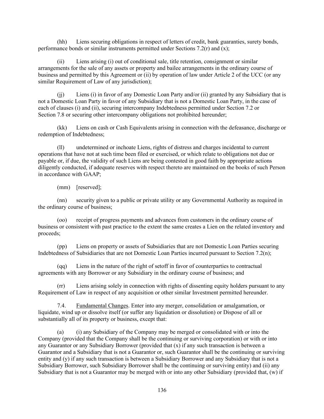 136 (hh) Liens securing obligations in respect of letters of credit, bank guaranties, surety bonds, performance bonds or similar instruments permitted under Sections 7.2(r) and (x); (ii) Liens arising (i) out of conditional sale, title retention, consignment or similar arrangements for the sale of any assets or property and bailee arrangements in the ordinary course of business and permitted by this Agreement or (ii) by operation of law under Article 2 of the UCC (or any similar Requirement of Law of any jurisdiction); (jj) Liens (i) in favor of any Domestic Loan Party and/or (ii) granted by any Subsidiary that is not a Domestic Loan Party in favor of any Subsidiary that is not a Domestic Loan Party, in the case of each of clauses (i) and (ii), securing intercompany Indebtedness permitted under Section 7.2 or Section 7.8 or securing other intercompany obligations not prohibited hereunder; (kk) Liens on cash or Cash Equivalents arising in connection with the defeasance, discharge or redemption of Indebtedness; (ll) undetermined or inchoate Liens, rights of distress and charges incidental to current operations that have not at such time been filed or exercised, or which relate to obligations not due or payable or, if due, the validity of such Liens are being contested in good faith by appropriate actions diligently conducted, if adequate reserves with respect thereto are maintained on the books of such Person in accordance with GAAP; (mm) [reserved]; (nn) security given to a public or private utility or any Governmental Authority as required in the ordinary course of business; (oo) receipt of progress payments and advances from customers in the ordinary course of business or consistent with past practice to the extent the same creates a Lien on the related inventory and proceeds; (pp) Liens on property or assets of Subsidiaries that are not Domestic Loan Parties securing Indebtedness of Subsidiaries that are not Domestic Loan Parties incurred pursuant to Section 7.2(n); (qq) Liens in the nature of the right of setoff in favor of counterparties to contractual agreements with any Borrower or any Subsidiary in the ordinary course of business; and (rr) Liens arising solely in connection with rights of dissenting equity holders pursuant to any Requirement of Law in respect of any acquisition or other similar Investment permitted hereunder. 7.4. Fundamental Changes. Enter into any merger, consolidation or amalgamation, or liquidate, wind up or dissolve itself (or suffer any liquidation or dissolution) or Dispose of all or substantially all of its property or business, except that: (a) (i) any Subsidiary of the Company may be merged or consolidated with or into the Company (provided that the Company shall be the continuing or surviving corporation) or with or into any Guarantor or any Subsidiary Borrower (provided that (x) if any such transaction is between a Guarantor and a Subsidiary that is not a Guarantor or, such Guarantor shall be the continuing or surviving entity and (y) if any such transaction is between a Subsidiary Borrower and any Subsidiary that is not a Subsidiary Borrower, such Subsidiary Borrower shall be the continuing or surviving entity) and (ii) any Subsidiary that is not a Guarantor may be merged with or into any other Subsidiary (provided that, (w) if