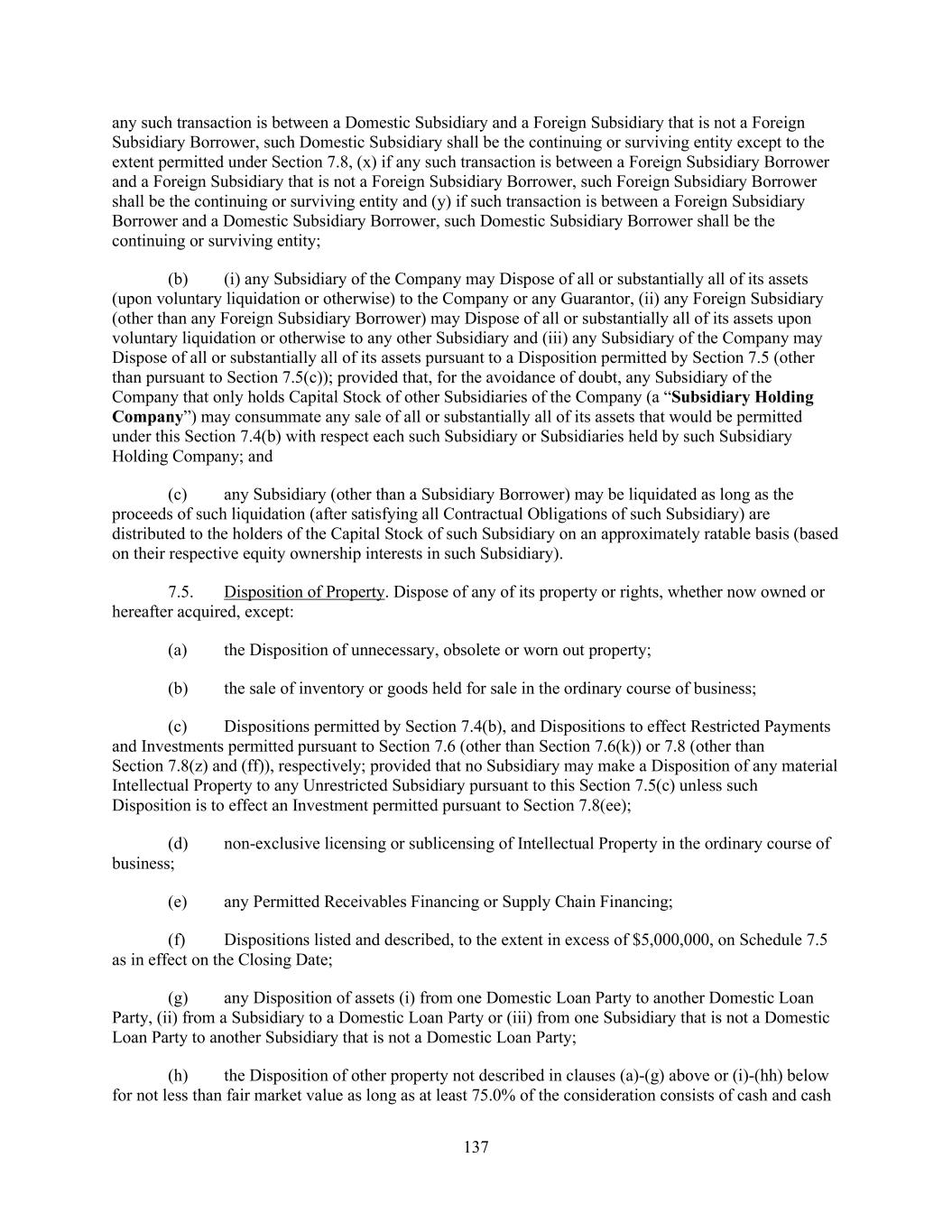 137 any such transaction is between a Domestic Subsidiary and a Foreign Subsidiary that is not a Foreign Subsidiary Borrower, such Domestic Subsidiary shall be the continuing or surviving entity except to the extent permitted under Section 7.8, (x) if any such transaction is between a Foreign Subsidiary Borrower and a Foreign Subsidiary that is not a Foreign Subsidiary Borrower, such Foreign Subsidiary Borrower shall be the continuing or surviving entity and (y) if such transaction is between a Foreign Subsidiary Borrower and a Domestic Subsidiary Borrower, such Domestic Subsidiary Borrower shall be the continuing or surviving entity; (b) (i) any Subsidiary of the Company may Dispose of all or substantially all of its assets (upon voluntary liquidation or otherwise) to the Company or any Guarantor, (ii) any Foreign Subsidiary (other than any Foreign Subsidiary Borrower) may Dispose of all or substantially all of its assets upon voluntary liquidation or otherwise to any other Subsidiary and (iii) any Subsidiary of the Company may Dispose of all or substantially all of its assets pursuant to a Disposition permitted by Section 7.5 (other than pursuant to Section 7.5(c)); provided that, for the avoidance of doubt, any Subsidiary of the Company that only holds Capital Stock of other Subsidiaries of the Company (a “Subsidiary Holding Company”) may consummate any sale of all or substantially all of its assets that would be permitted under this Section 7.4(b) with respect each such Subsidiary or Subsidiaries held by such Subsidiary Holding Company; and (c) any Subsidiary (other than a Subsidiary Borrower) may be liquidated as long as the proceeds of such liquidation (after satisfying all Contractual Obligations of such Subsidiary) are distributed to the holders of the Capital Stock of such Subsidiary on an approximately ratable basis (based on their respective equity ownership interests in such Subsidiary). 7.5. Disposition of Property. Dispose of any of its property or rights, whether now owned or hereafter acquired, except: (a) the Disposition of unnecessary, obsolete or worn out property; (b) the sale of inventory or goods held for sale in the ordinary course of business; (c) Dispositions permitted by Section 7.4(b), and Dispositions to effect Restricted Payments and Investments permitted pursuant to Section 7.6 (other than Section 7.6(k)) or 7.8 (other than Section 7.8(z) and (ff)), respectively; provided that no Subsidiary may make a Disposition of any material Intellectual Property to any Unrestricted Subsidiary pursuant to this Section 7.5(c) unless such Disposition is to effect an Investment permitted pursuant to Section 7.8(ee); (d) non-exclusive licensing or sublicensing of Intellectual Property in the ordinary course of business; (e) any Permitted Receivables Financing or Supply Chain Financing; (f) Dispositions listed and described, to the extent in excess of $5,000,000, on Schedule 7.5 as in effect on the Closing Date; (g) any Disposition of assets (i) from one Domestic Loan Party to another Domestic Loan Party, (ii) from a Subsidiary to a Domestic Loan Party or (iii) from one Subsidiary that is not a Domestic Loan Party to another Subsidiary that is not a Domestic Loan Party; (h) the Disposition of other property not described in clauses (a)-(g) above or (i)-(hh) below for not less than fair market value as long as at least 75.0% of the consideration consists of cash and cash